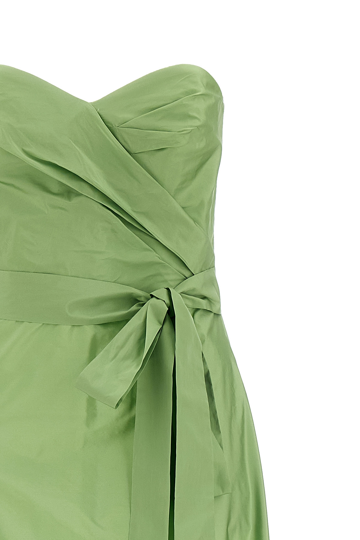 Long 'Falena' taffeta dress, off-the-shoulder model, sweetheart neckline with front curled corset, back zip closure, flounce on the hem, pockets, sash tie at the waist.