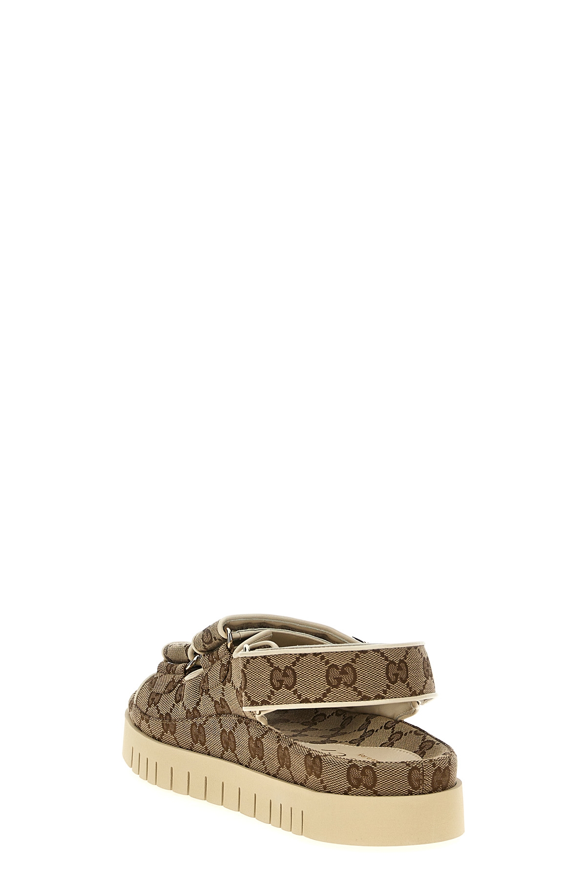 GG fabric sandal, leather lining, adjustable straps with velcro and double metal GG applique, rubber sole.
