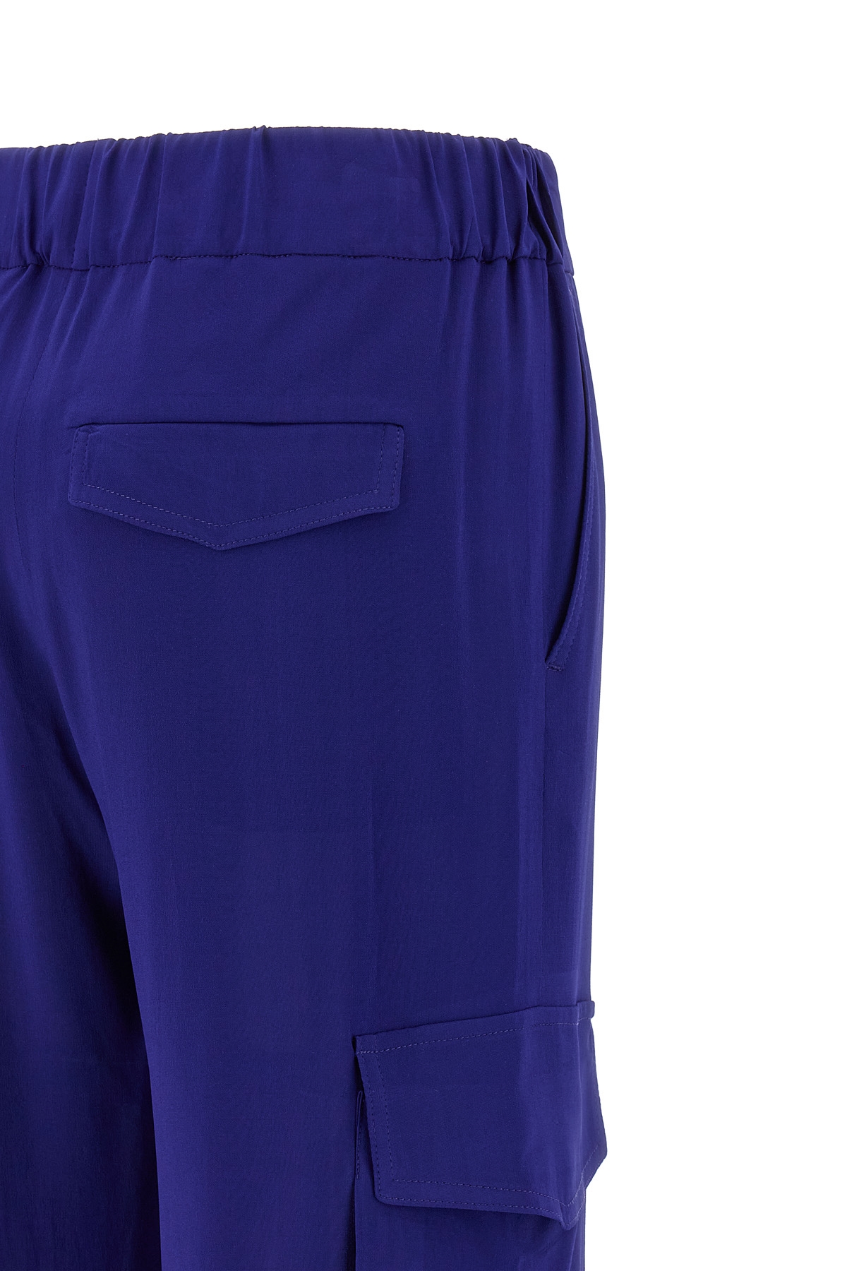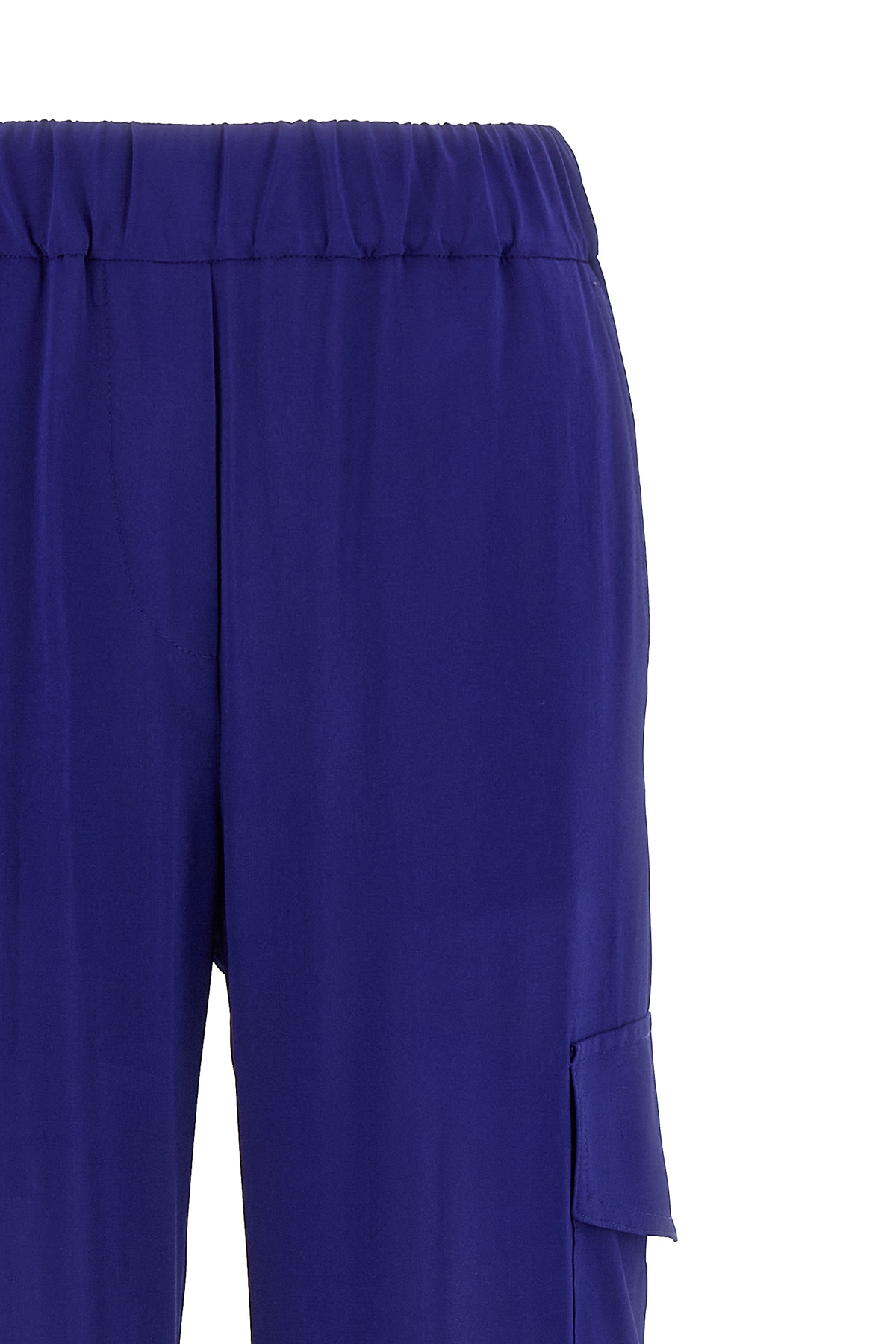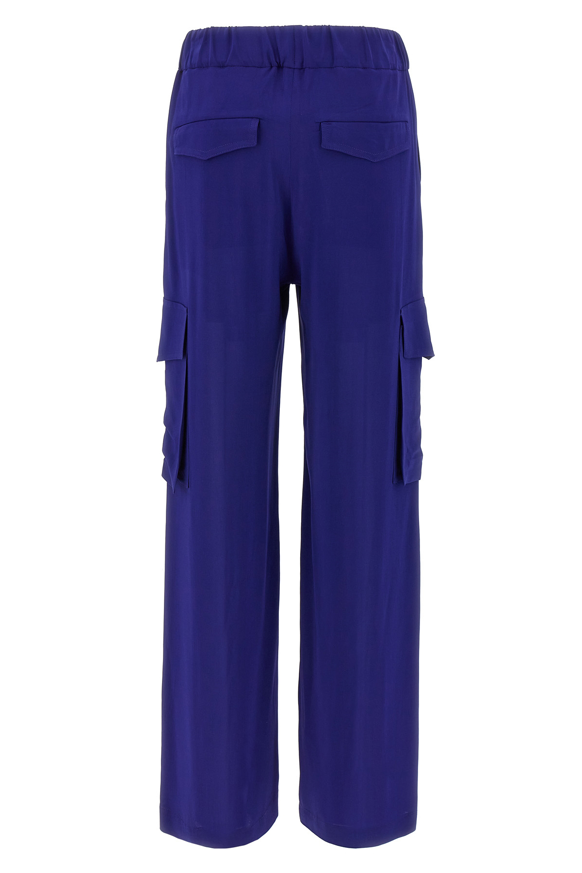 Stretch viscose trousers with cargo pockets, elastic waistband, wide and straight leg, pockets.