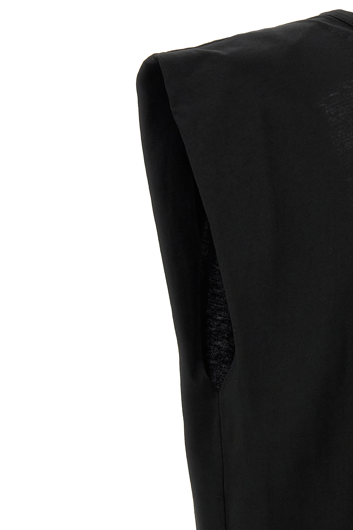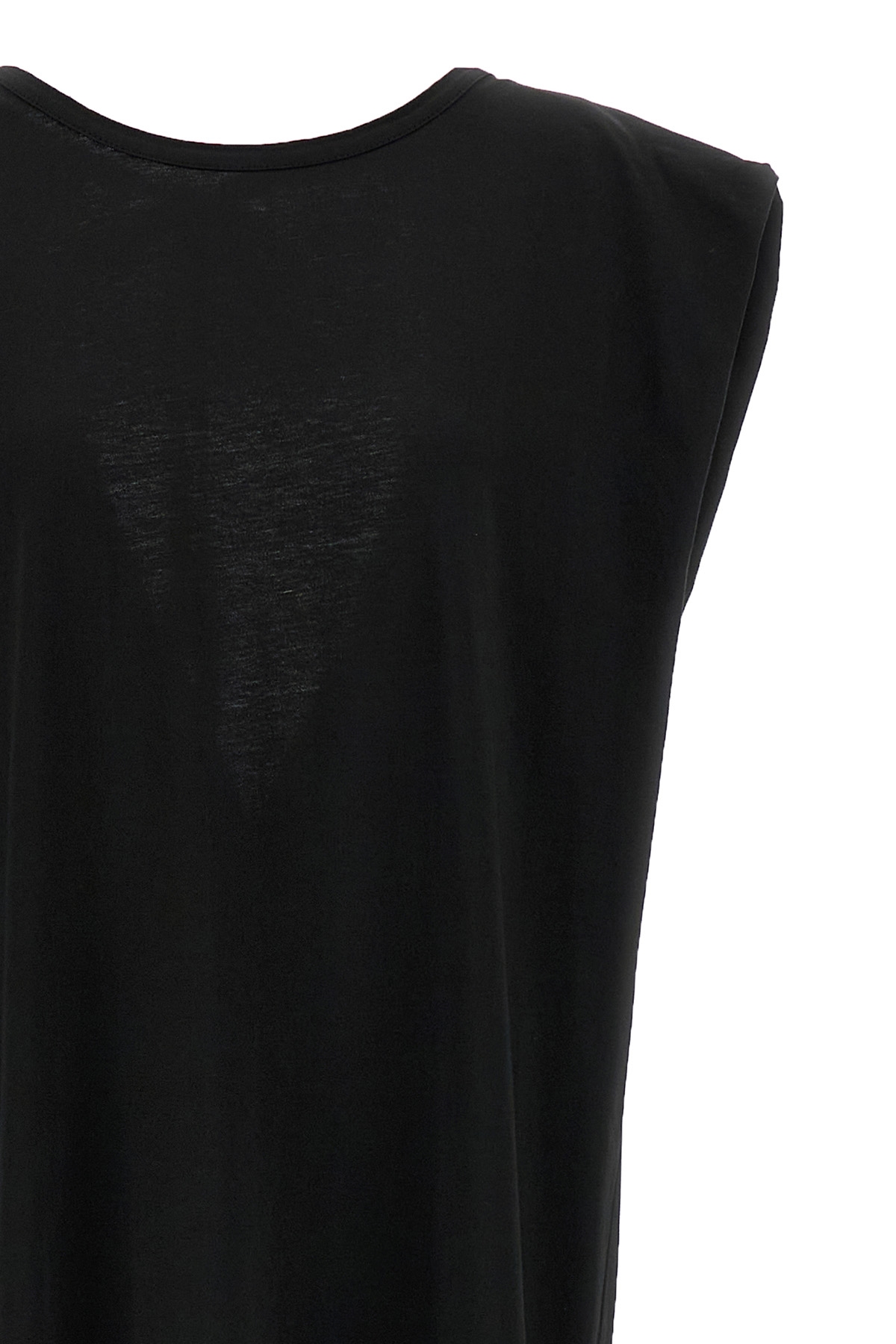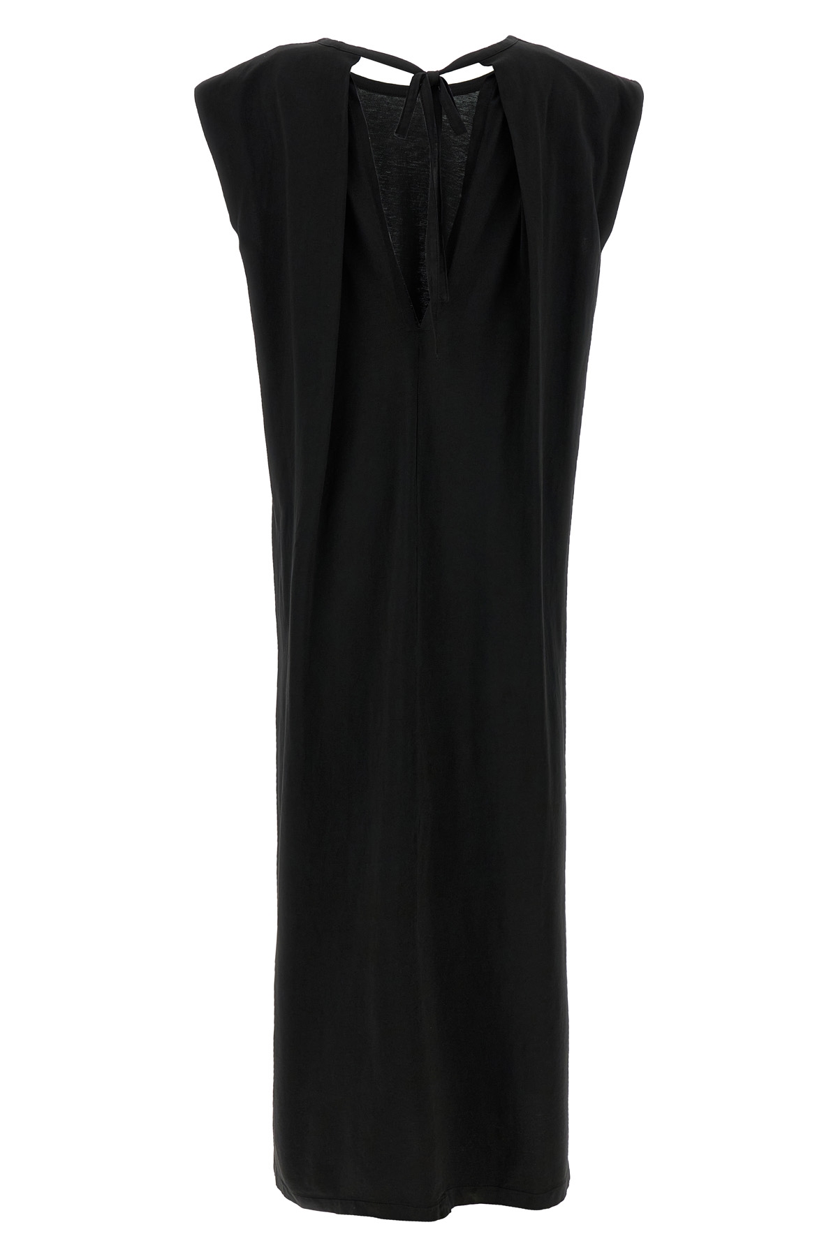 Long cotton dress, crew neck, draped tie closure and cut out detail at the back, sleeveless.