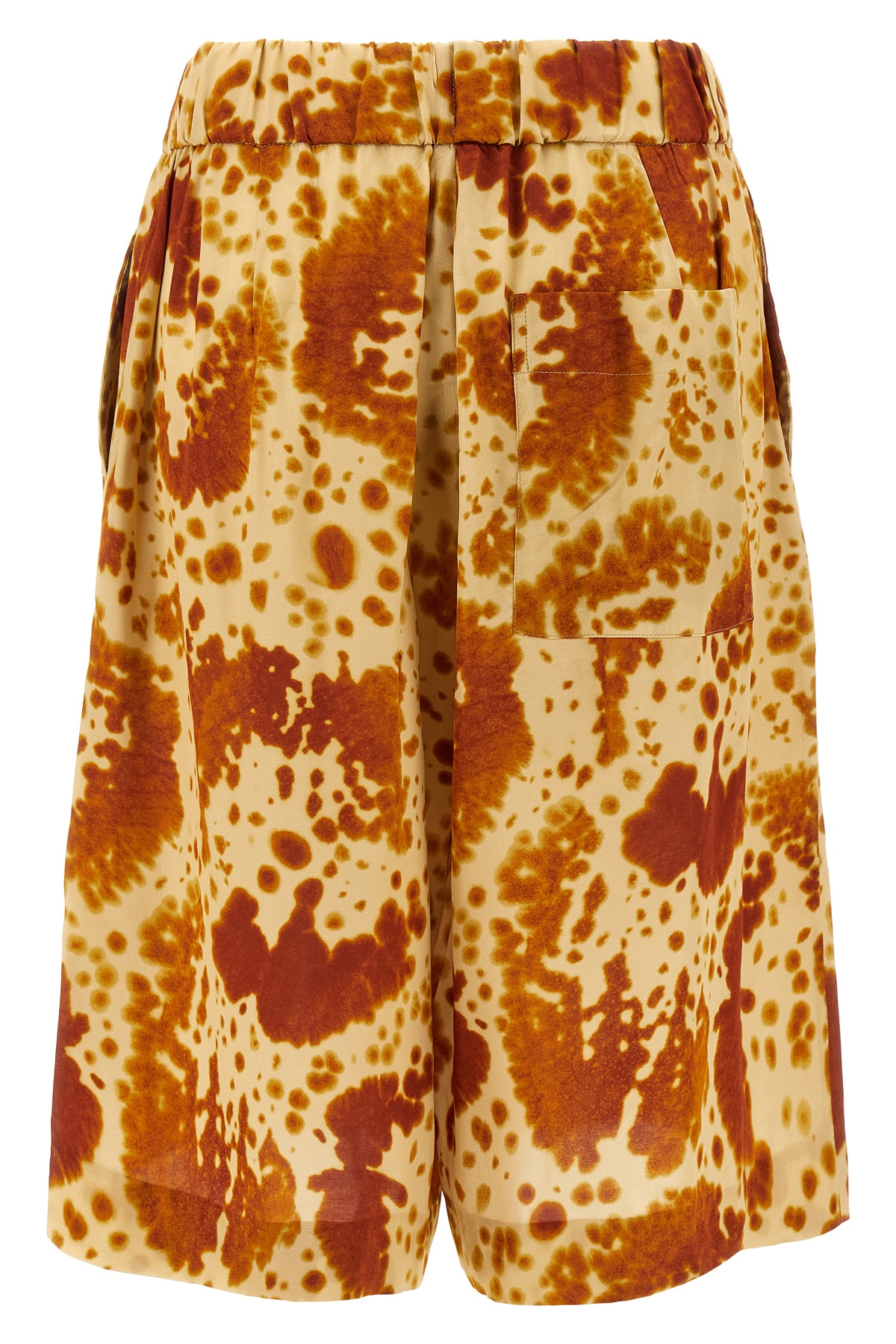 'Pomy Bis' bermuda shorts in patterned print viscose with elastic waistband, wide leg, pockets, trompe l'oeil patch.