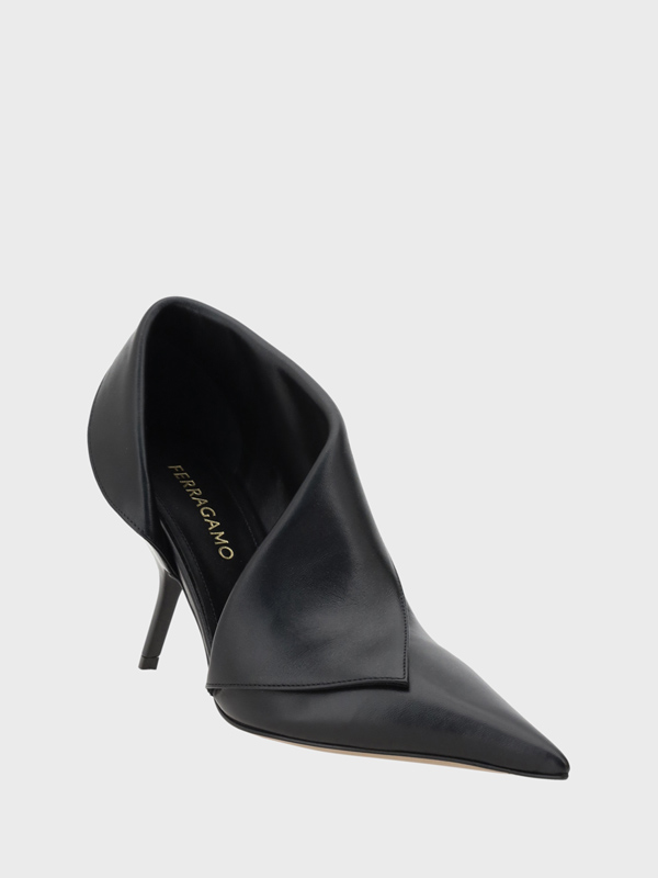 Ferragamos leather Pumps are an elegant and bold interpretation of the classic high heel They feature an elongated toe that lends a refined look while the crooked leather stiletto heel adds a touch of originality A cutout detail on the outer side panel and an elegant turnup at the edge lend distinctive character to the model The branded insole completes the design with an additional luxury accent
