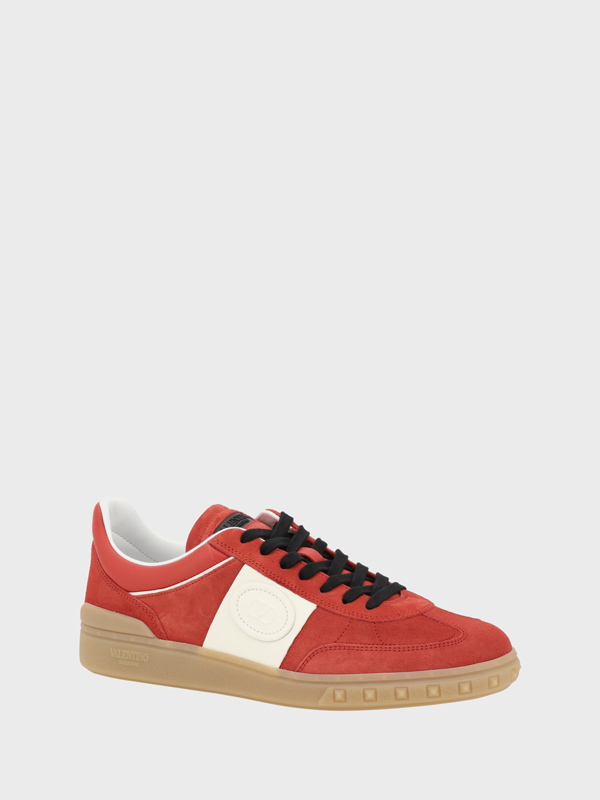Suede Sneakers by Valentino Garavani feature a round toe and a front laceup closure A contrasting slanted band on the outer side panel is embellished with the brands signature embossed VLogo The flat rubber sole is decorated with the brands iconic monogram and embossed Rockstud studs an additional detail that lends a bold and sophisticated touch to the design A pair of sneakers with a unique and refined look ideal for a modern and trendy outfit