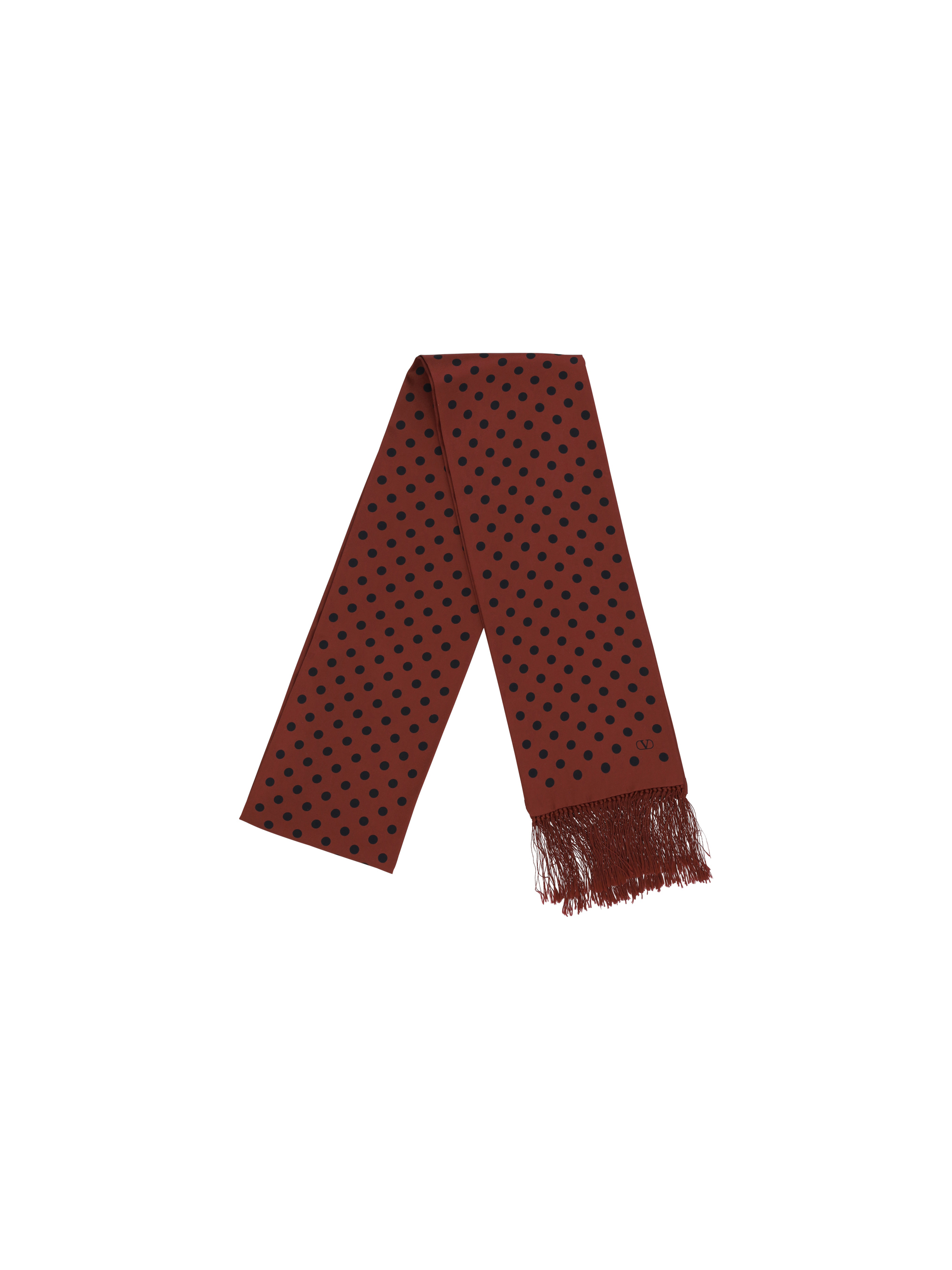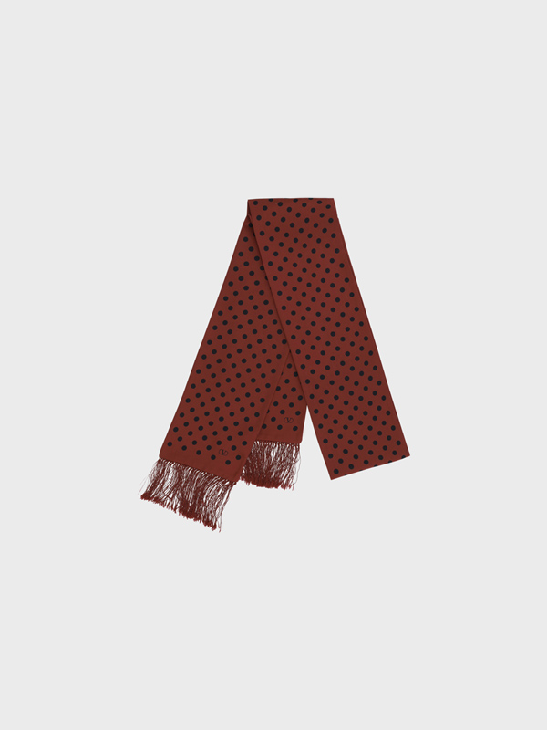 Valentino Garavanis Silk Scarf features a refined polkadot pattern that adds a touch of understated elegance The frayed bottom completes the design giving it a unique style detail Made from highquality silk it is perfect for adding a sophisticated and versatile touch to any outfit