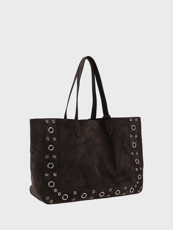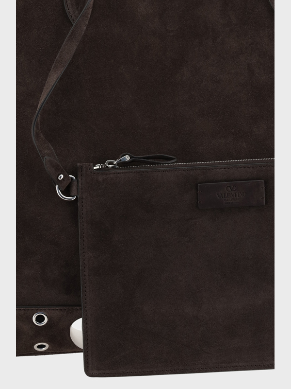 The Nellcote large Tote Bag by Valentino Garavani is an elegant accessory with a touch of character Made of suede leather it features two flat handles for comfortable carrying The design is embellished with an applied iconic logo patch on the front and round studs on the front adding a distinctive and bold detail A perfect balance of sophistication and grit