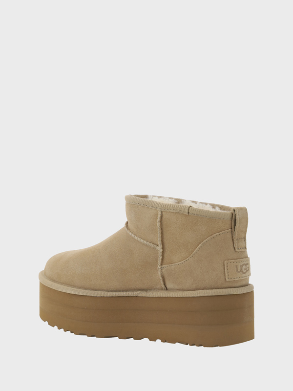 Calfskin Classic Ultra Mini Platform Boots by UGG knurled platform sound round toe soft shearling lining iconic brand monogram applied to heel raised stitching suede design