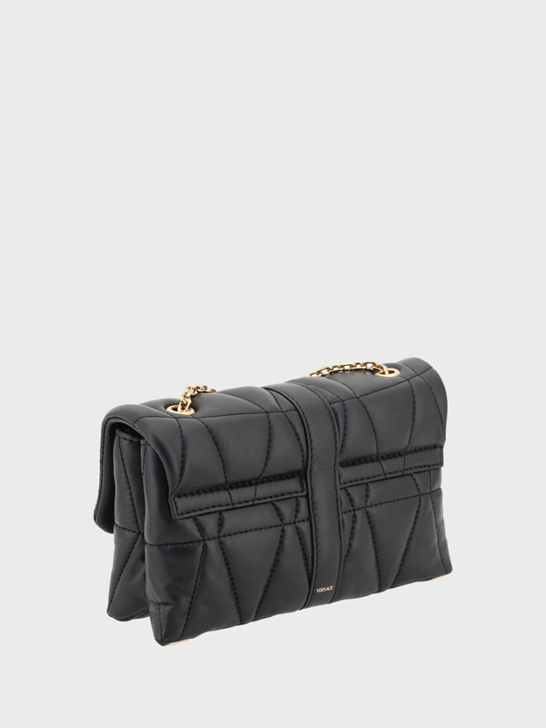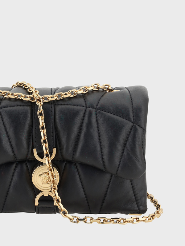 Leather Kleio Shoulder Bag by Versace a chain shoulder strap front closure via flap and hook with Medusa logo padded design iconic brand monogram stamped on the back