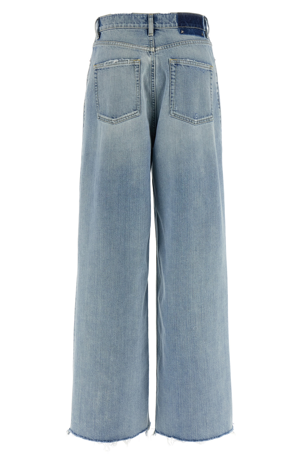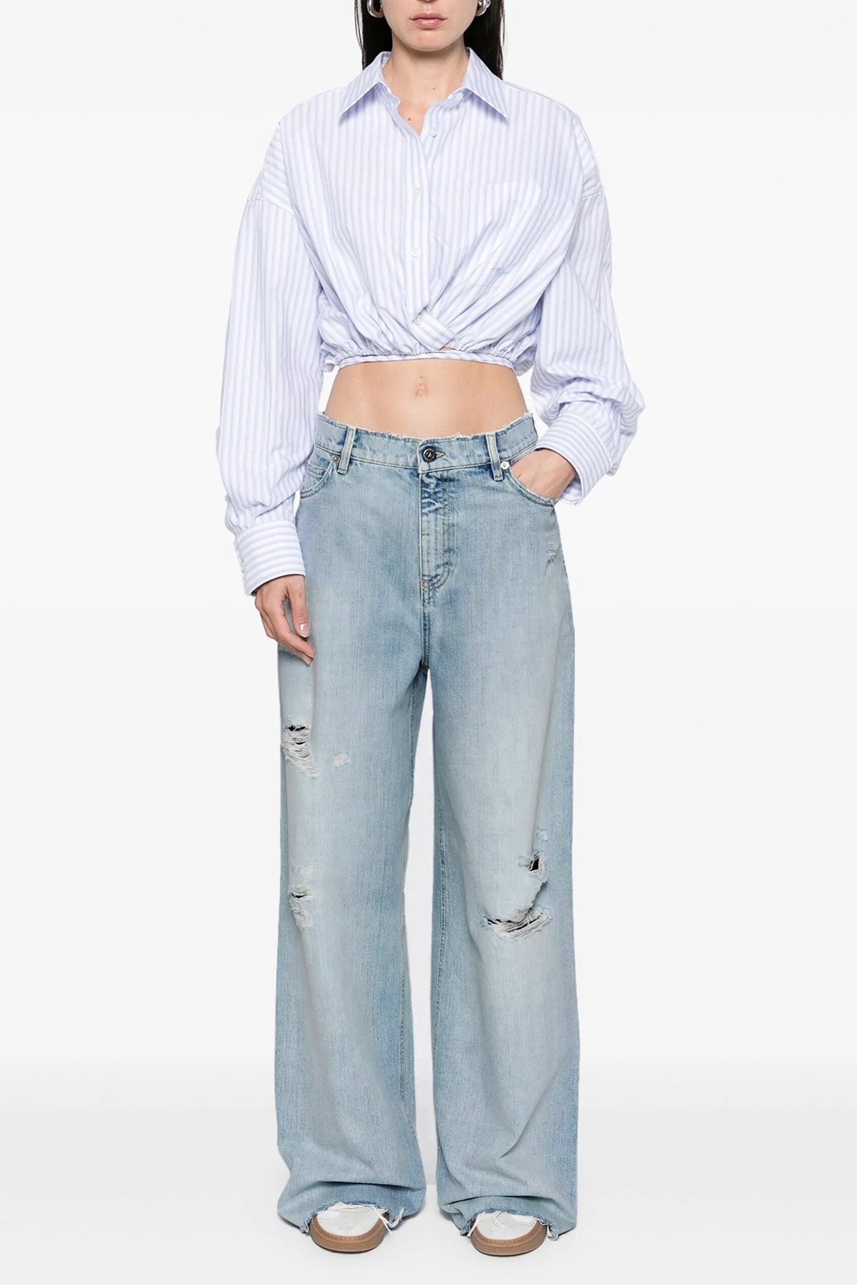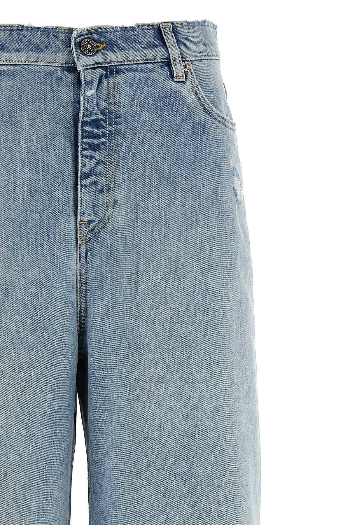 Lived-in effect cotton denim jeans with rips, five pockets, zip and front button closure, wide and straight legs, leg bottoms with raw cut hem.