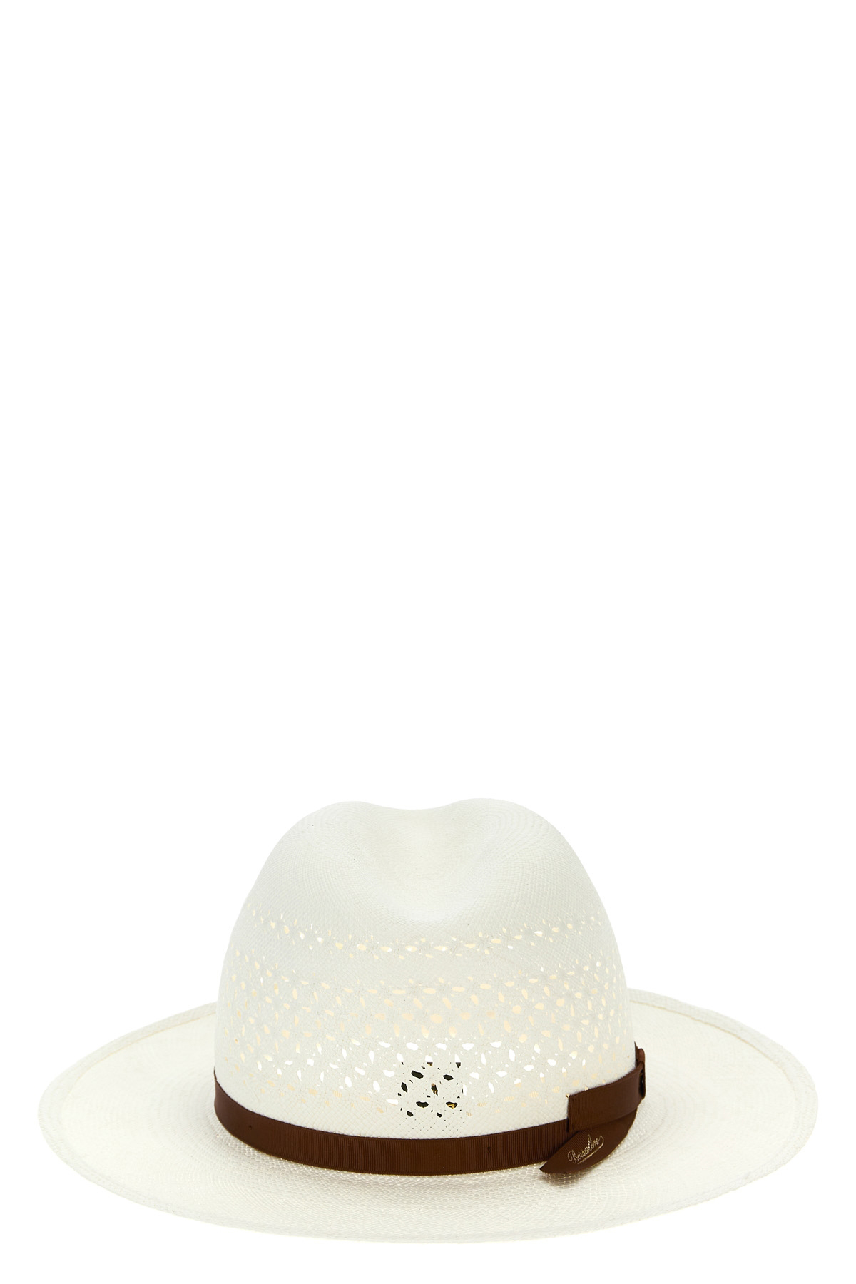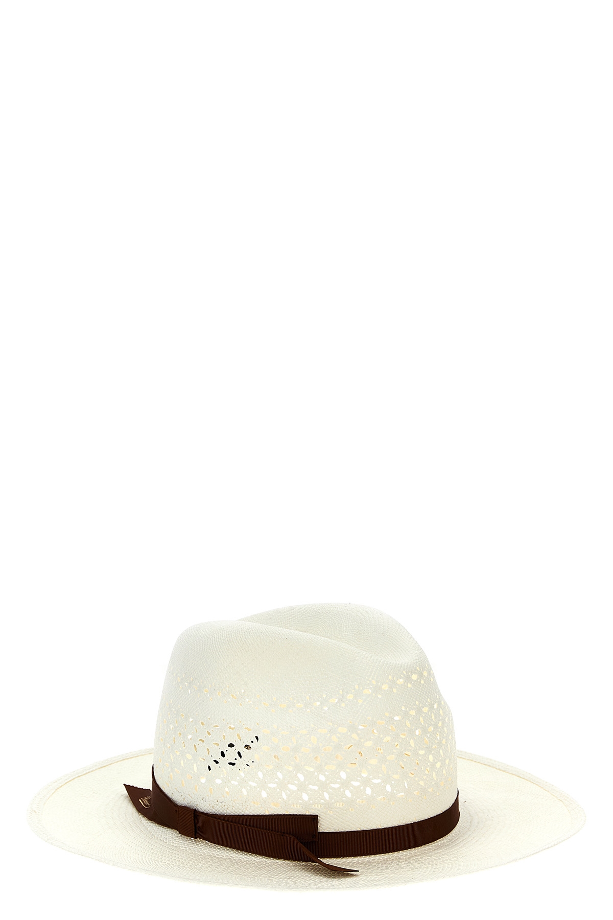 Medea' straw hat in woven straw with cut-out decorations, panama model with wide brim, grosgrain ribbon with printed logo.