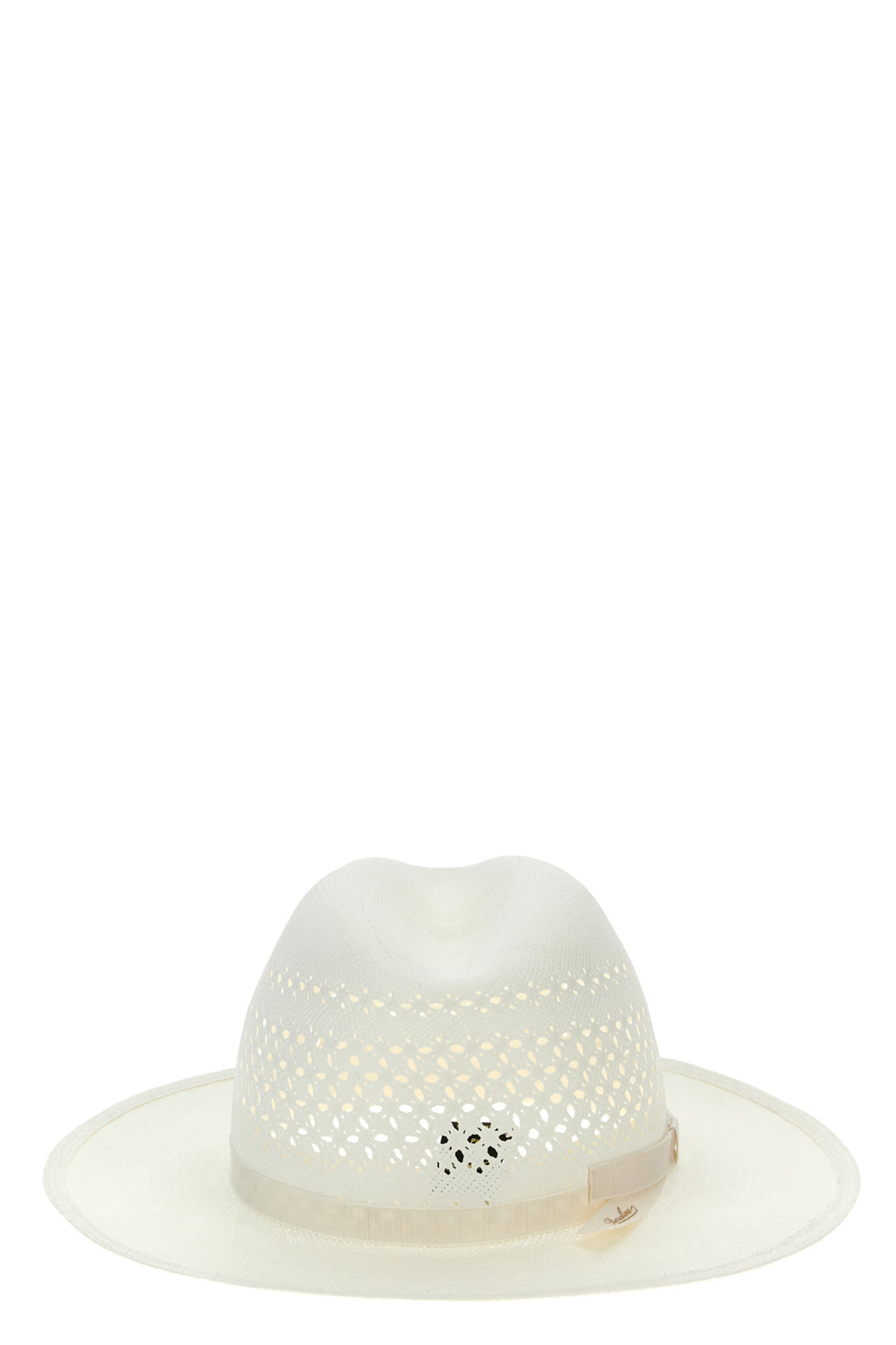 Medea' straw hat in woven straw with cut-out decorations, panama model with wide brim, grosgrain ribbon with printed logo.