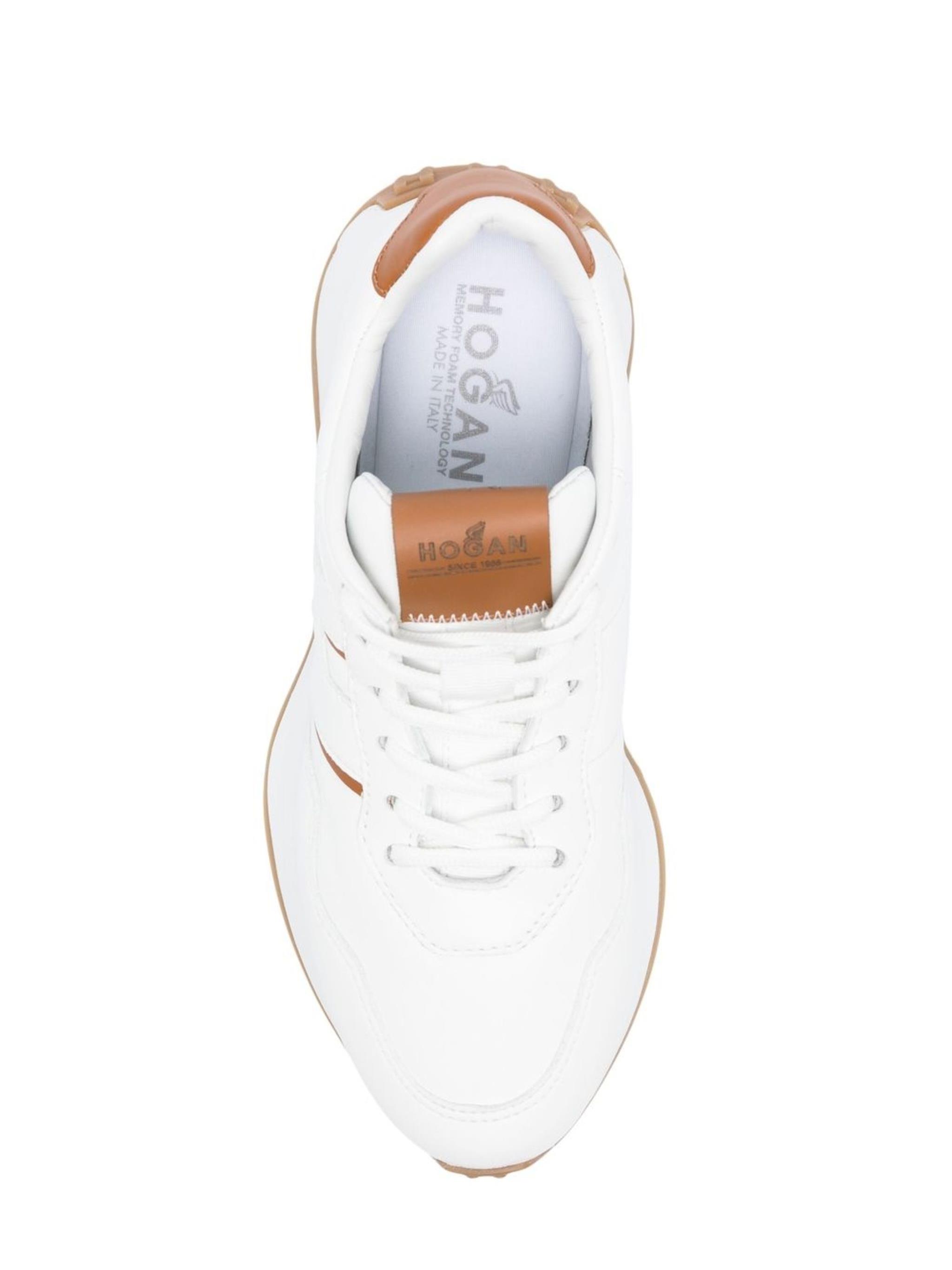whitebrown calf leather panelled design logo patch to the side logo patch at the tongue round toe front laceup fastening chunky rubber sole