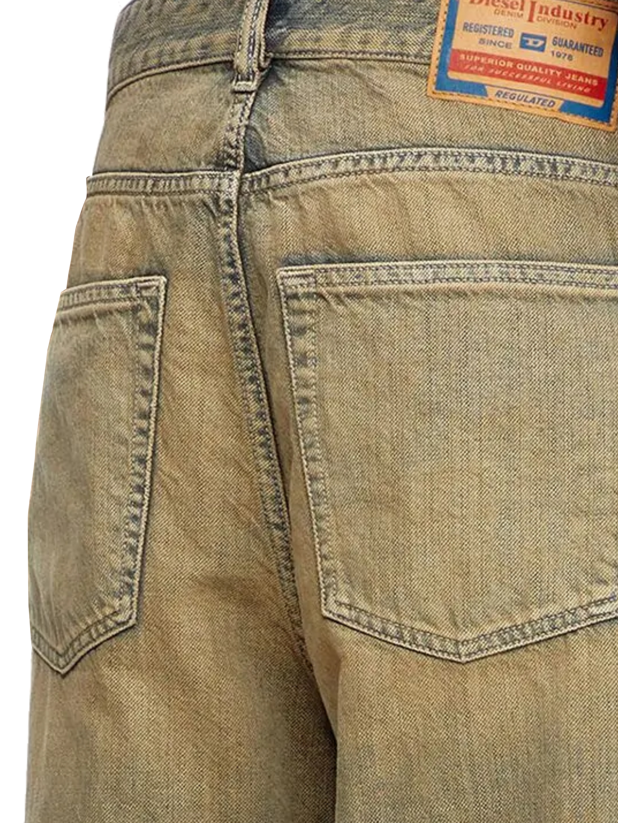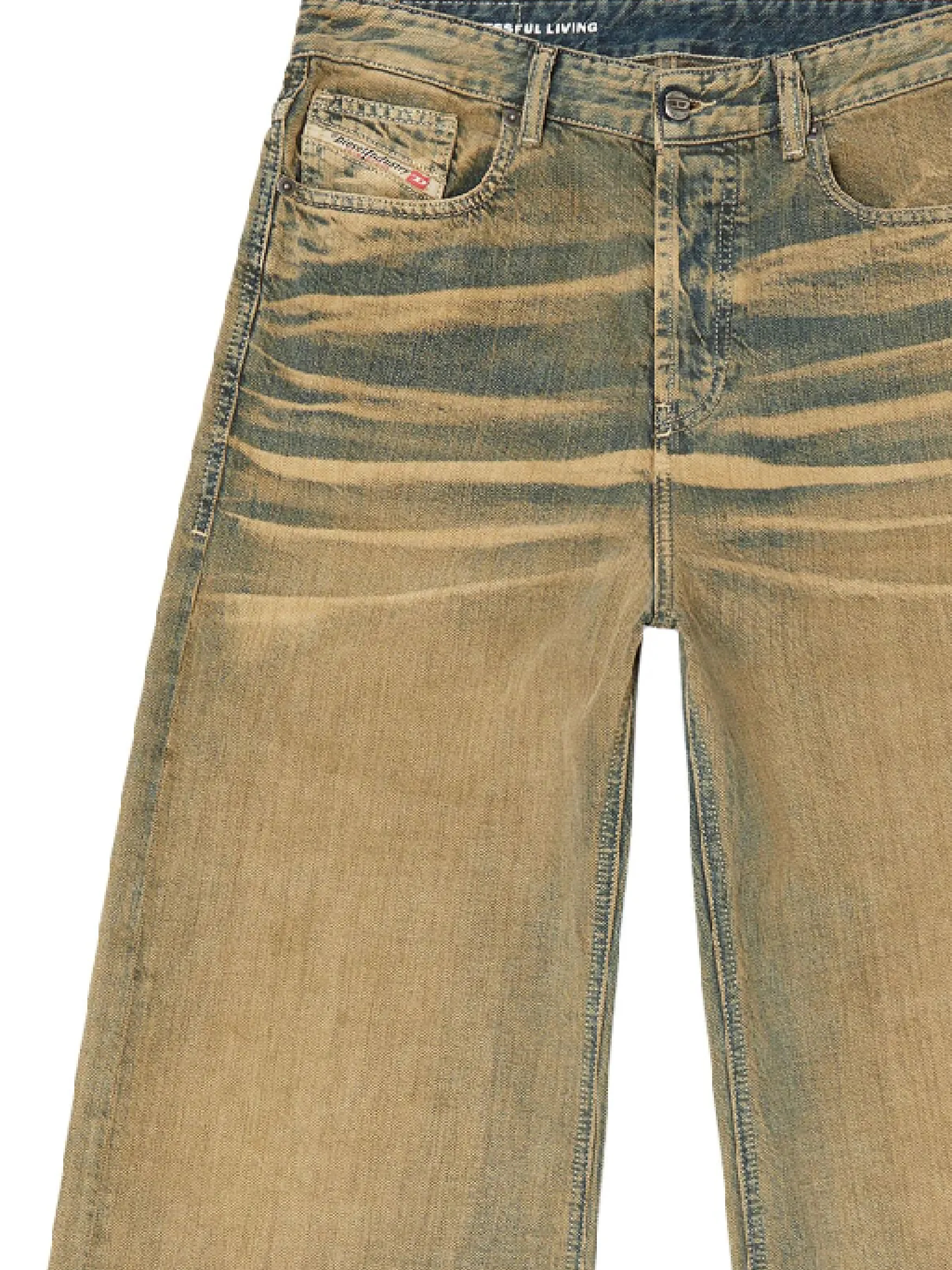 green cotton denim button fly fastening lowrise belt loops whiskering effect at the thighs classic five pockets logo patch to the rear floorlength wide leg