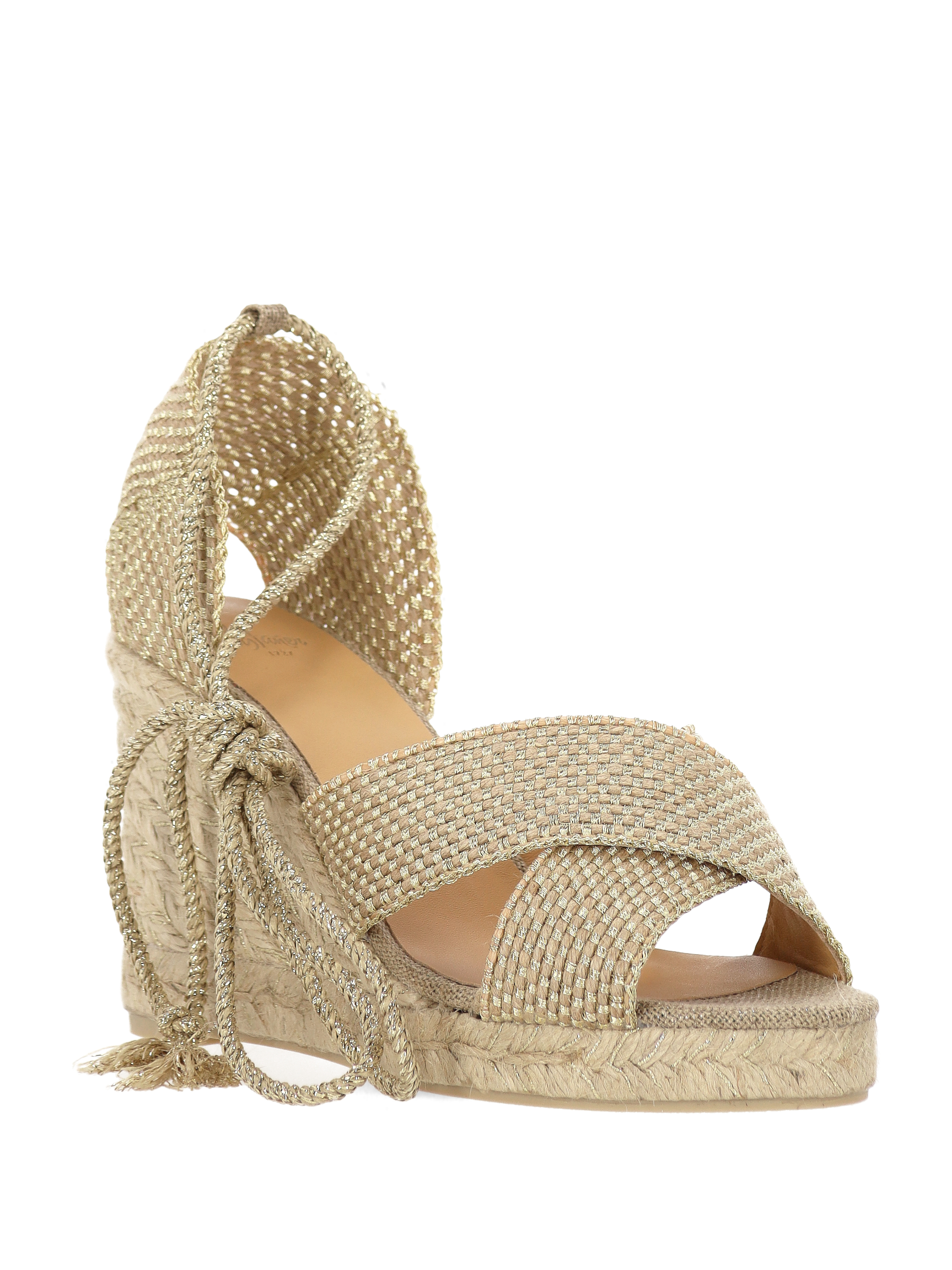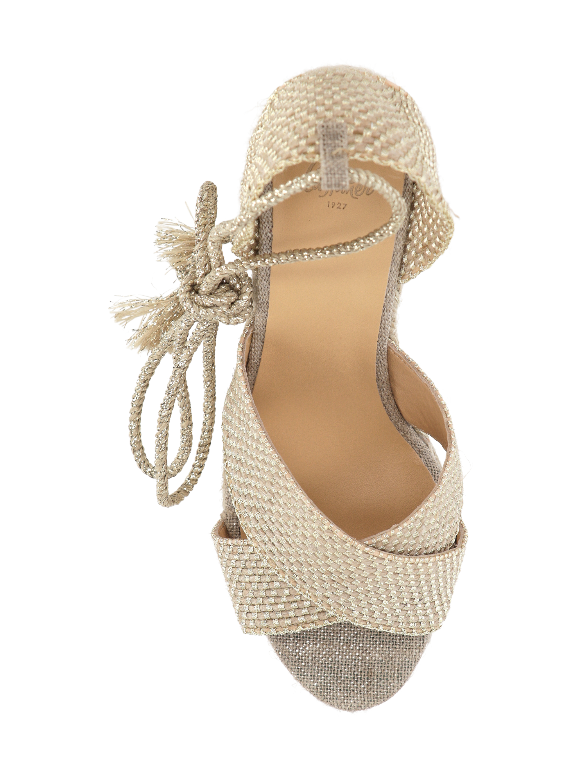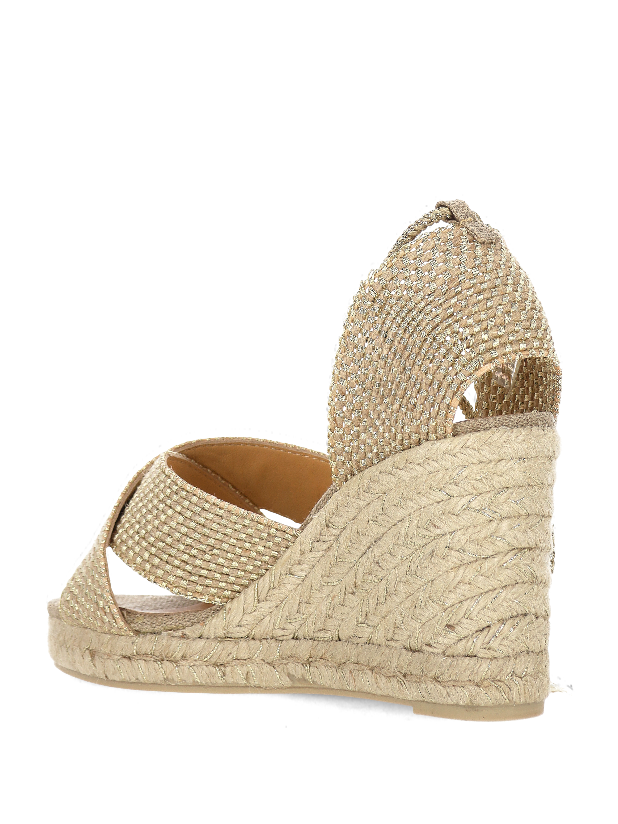 Gold tone strap high wedge heel branded footbed crossover strap detail