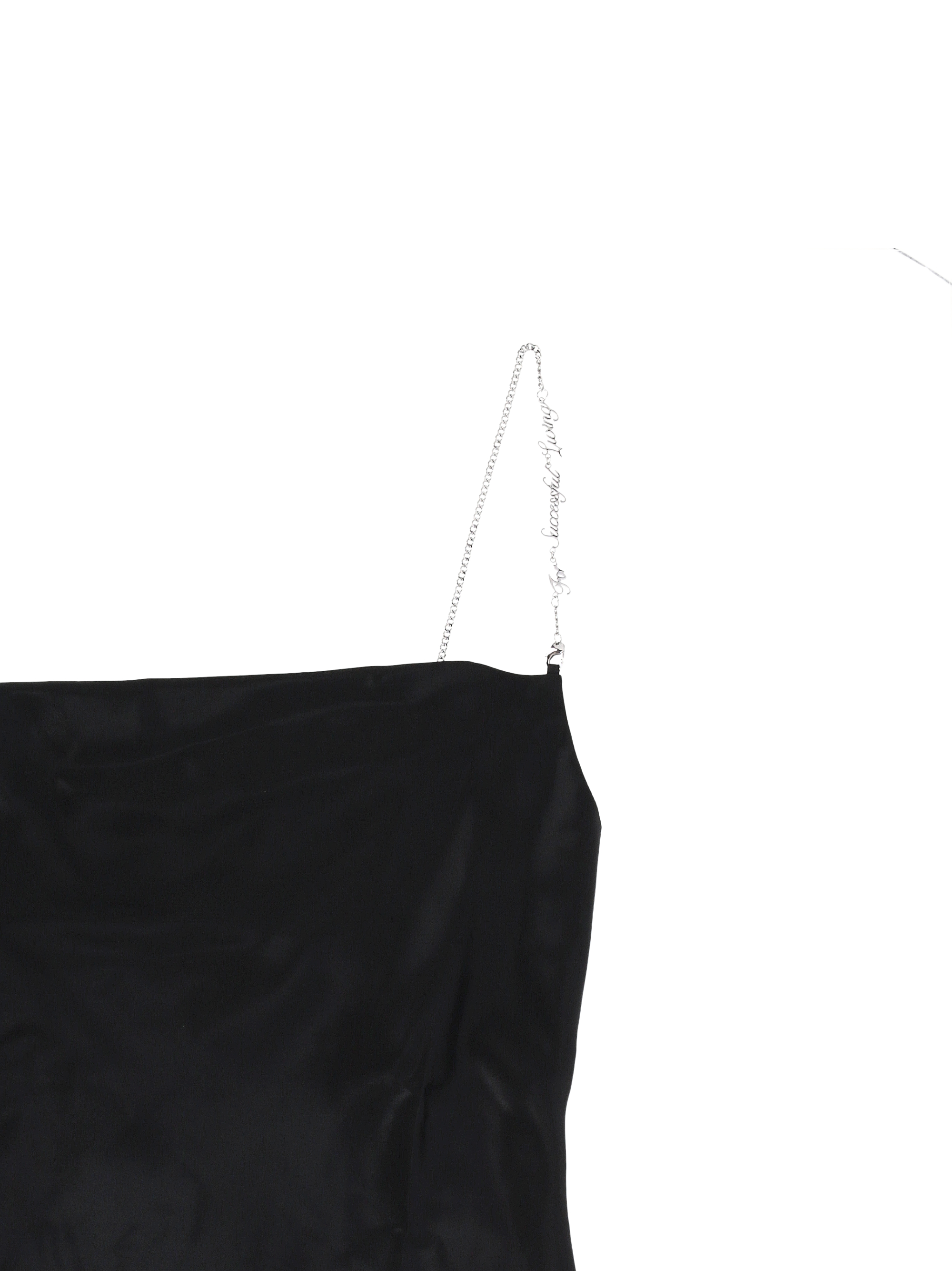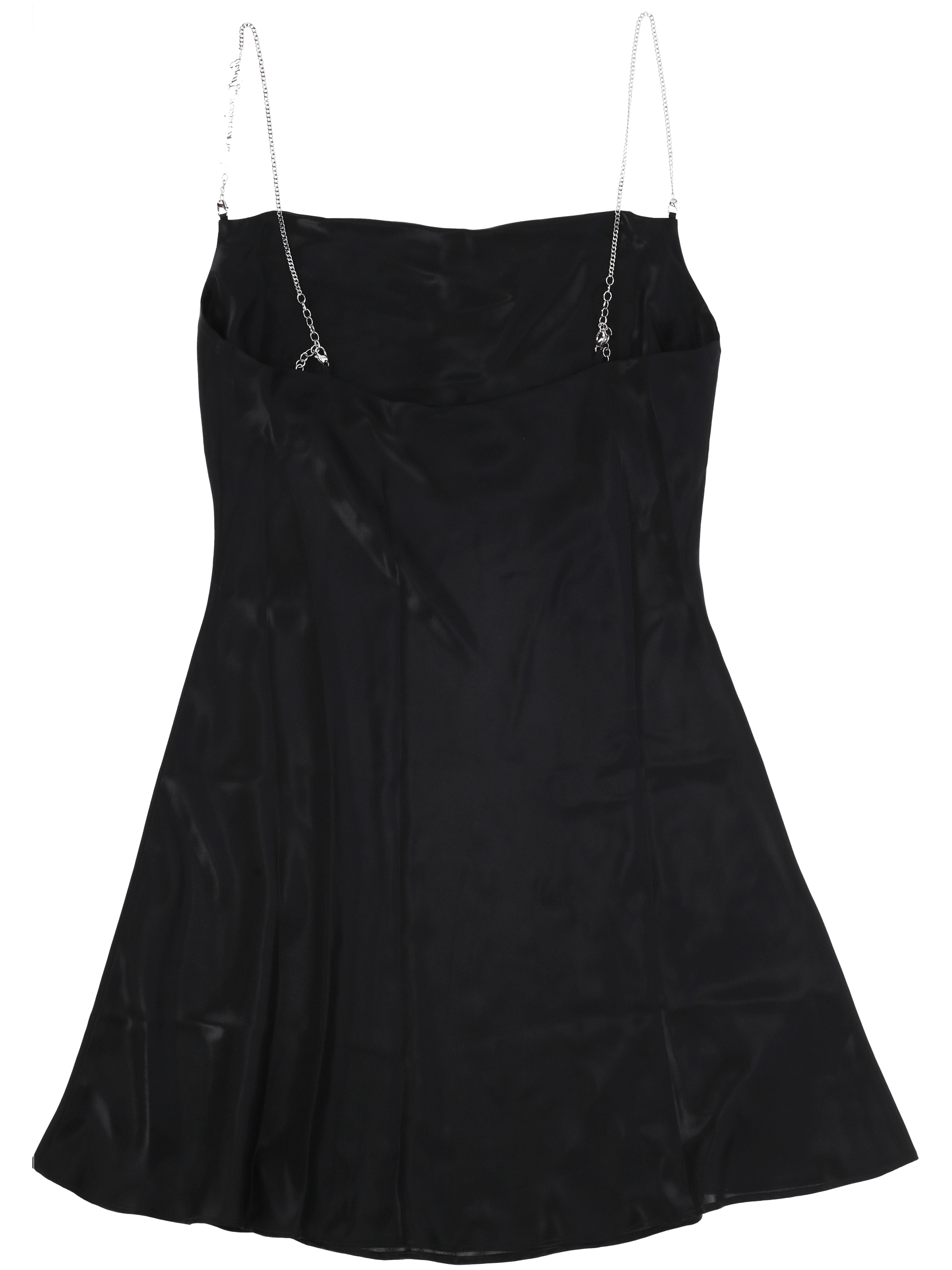 black bias cut cowl neck two chainlink shoulder straps thighlength straight hem
