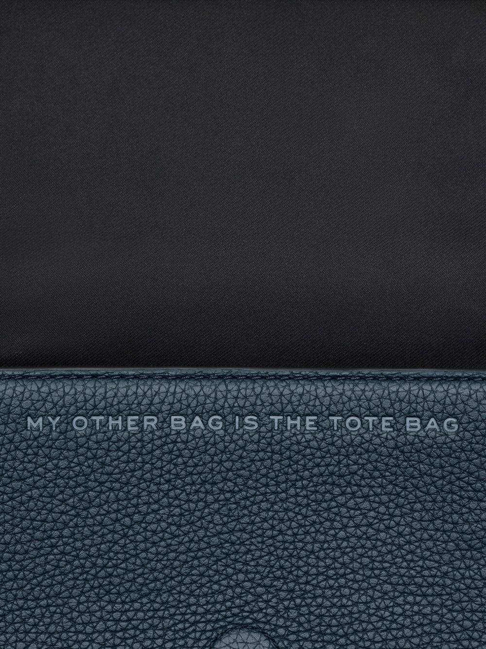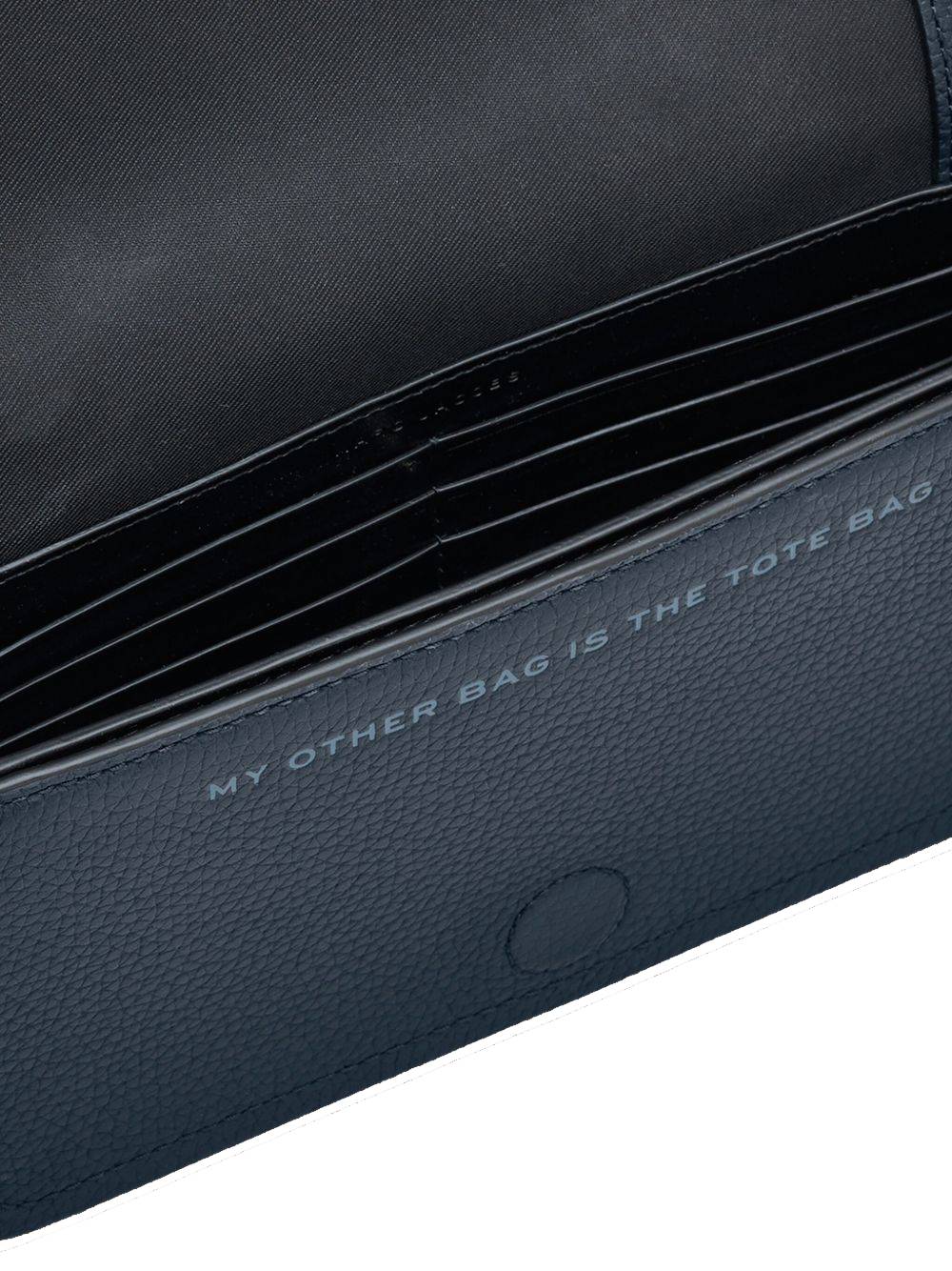 navy blue foldover top with magnetic fastening adjustable detachable shoulder strap internal card slots logo print to the front