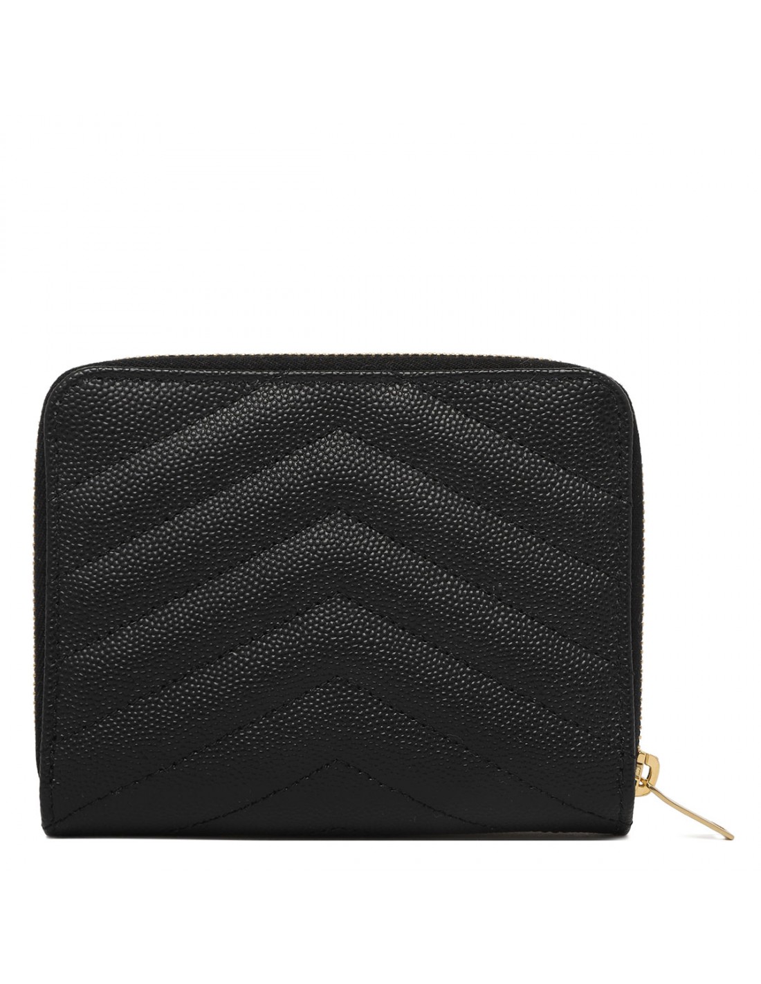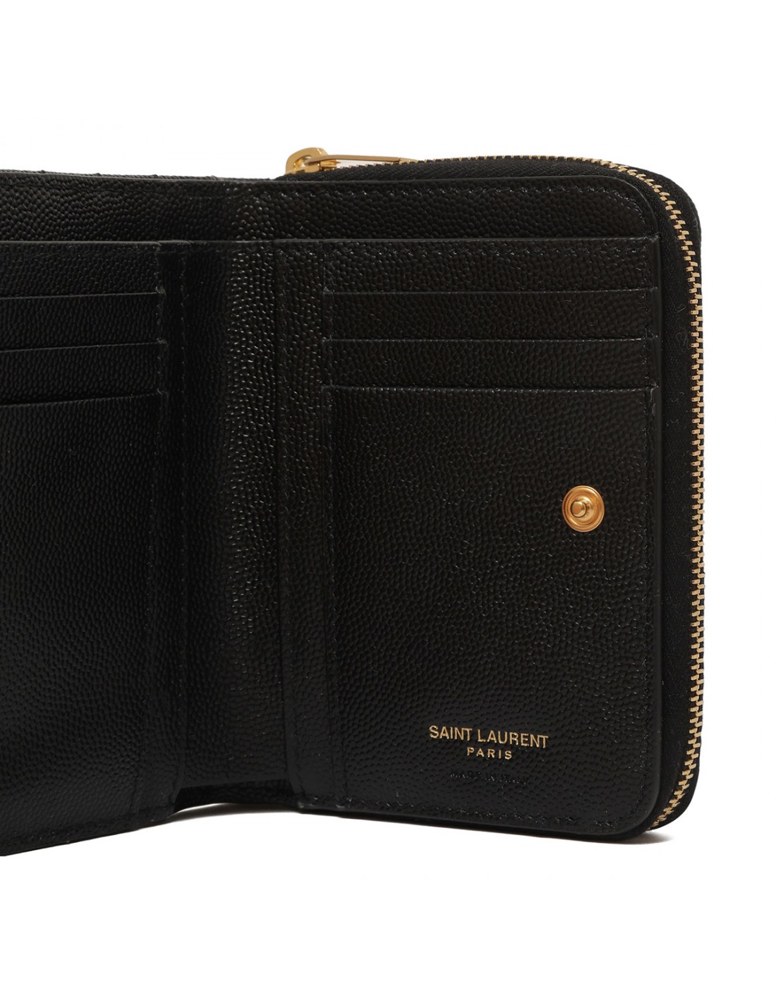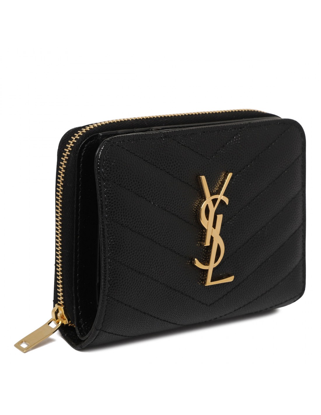 Black matelasse grained leather Cassandre compact wallet from Saint Laurent featuring interlaced YSL metal monogram at center, quilted overstitching, six card slots, one zippered coin pocket, one bill compartment and four receipt compartments.