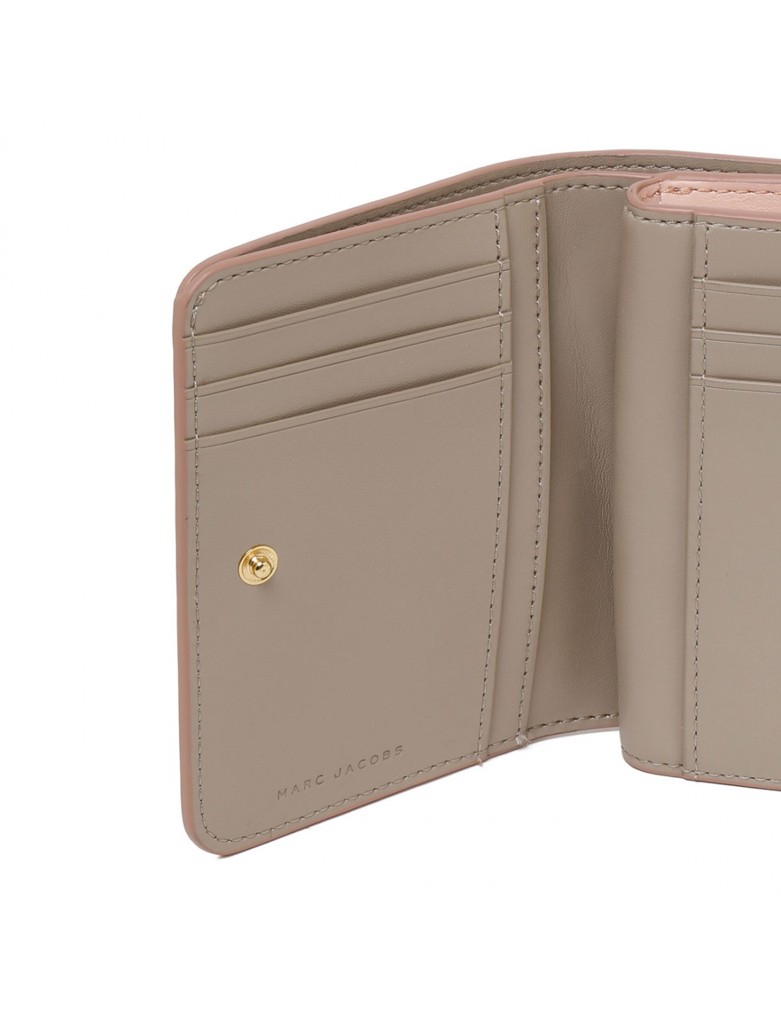 Rose smooth leather The Covered J Marc mini compact wallet from Marc Jacobs featuring? leather-covered J Marc logo, snap closure, twill lining, four slip pockets, six card slots, one bill sleeve, one coin pouch with double gusset.