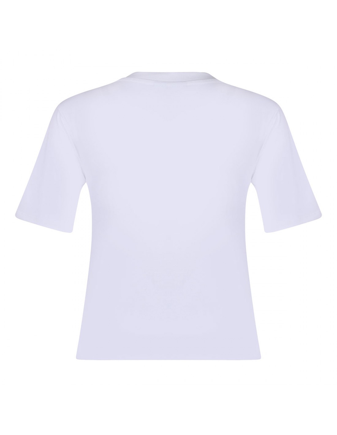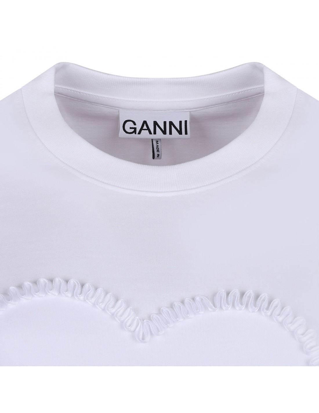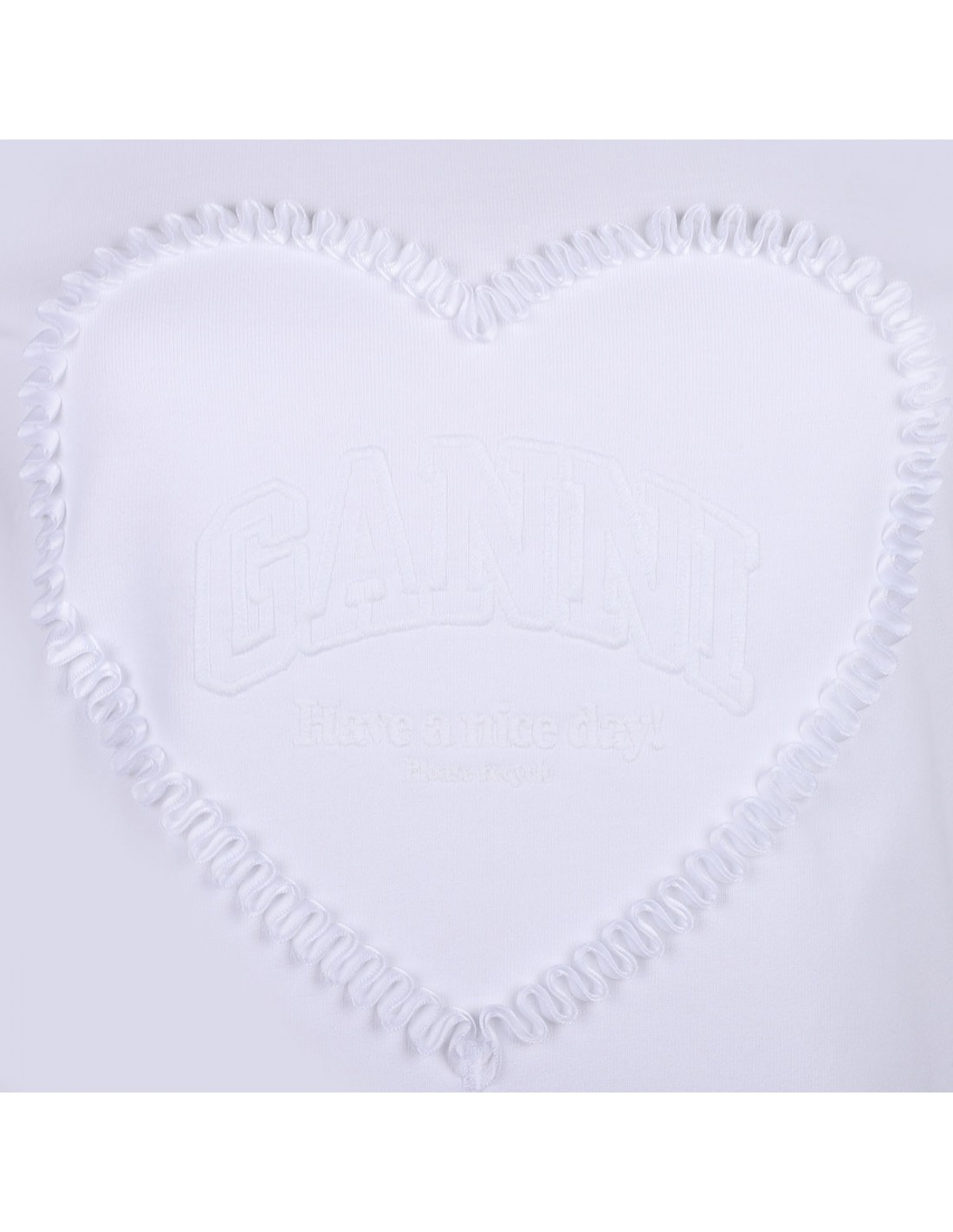 White heavy cotton T-Shirt from Ganni featuring embroidered heart with logo and the phrase "Have a nice day! Please recycle", round neckline and short sleeves.