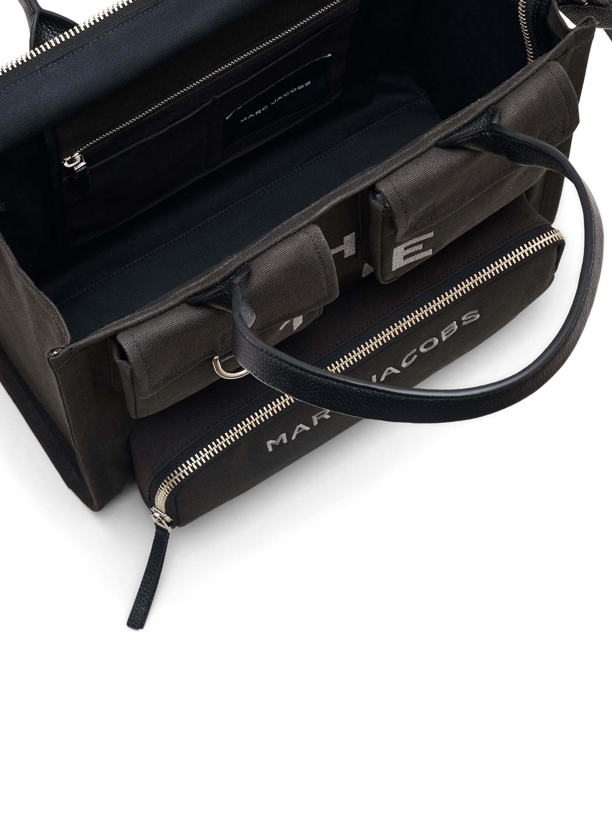 blacksilver cotton canvastop zip closure two flat handlescargo pockets logo print on the frontlogo application single compartment internal zip pocket full lining