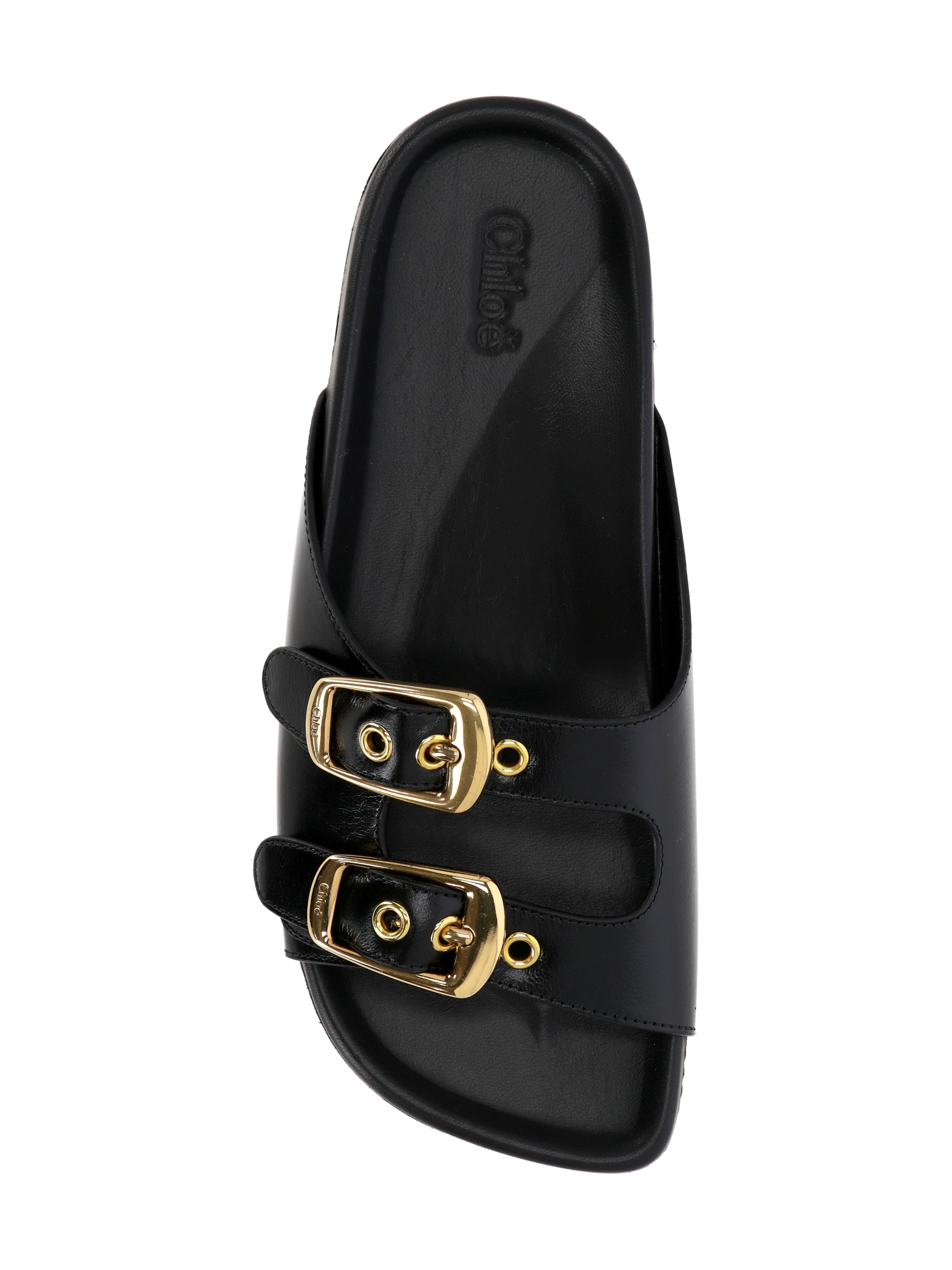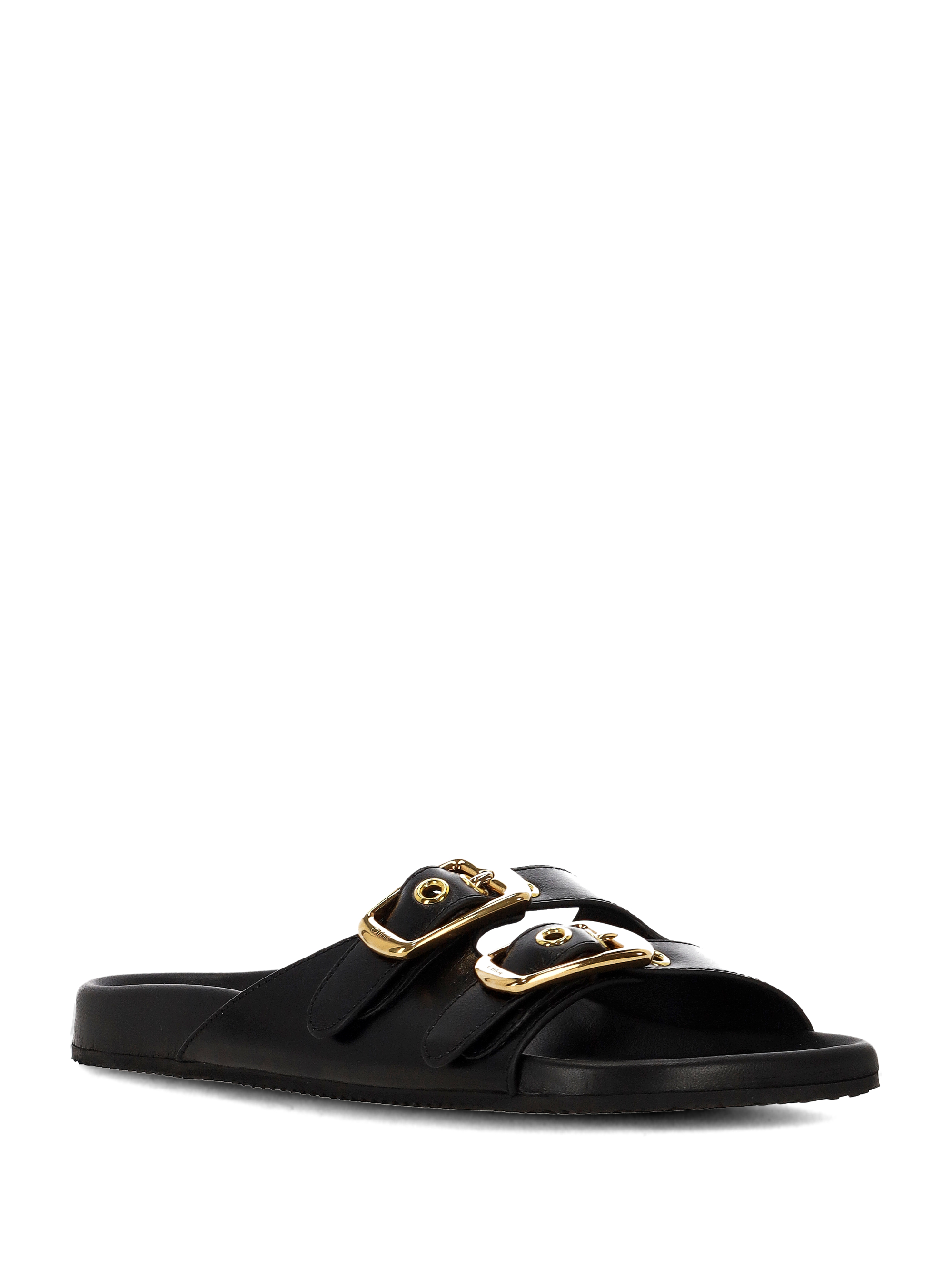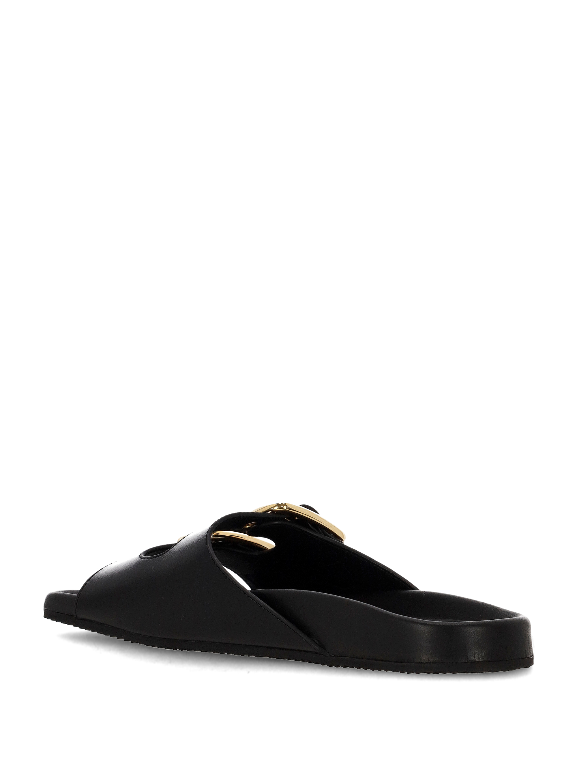 Crafted from shiny calfskin the Polly flat mules combine an anatomical rubber footbed with an asymmetrically shaped toe