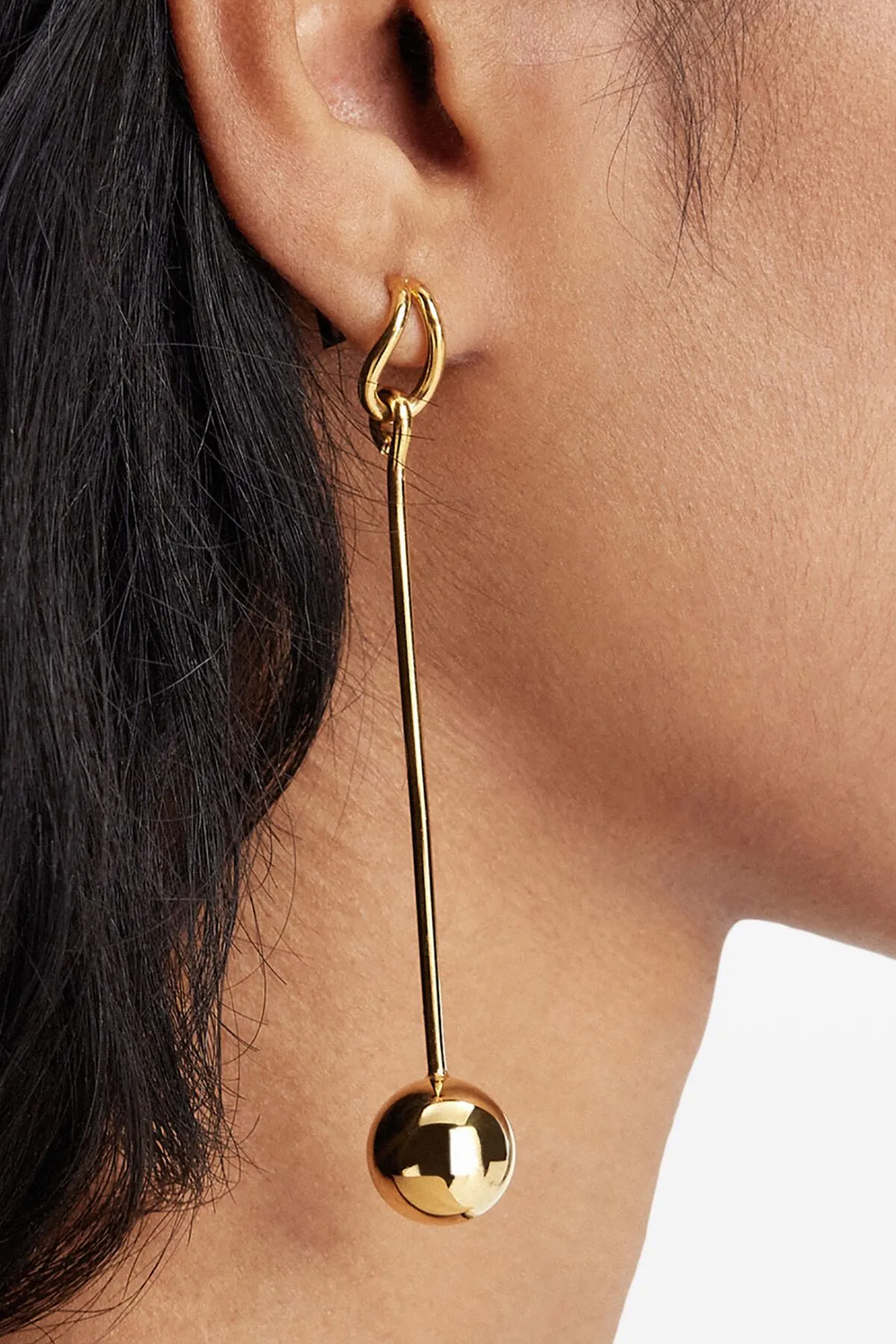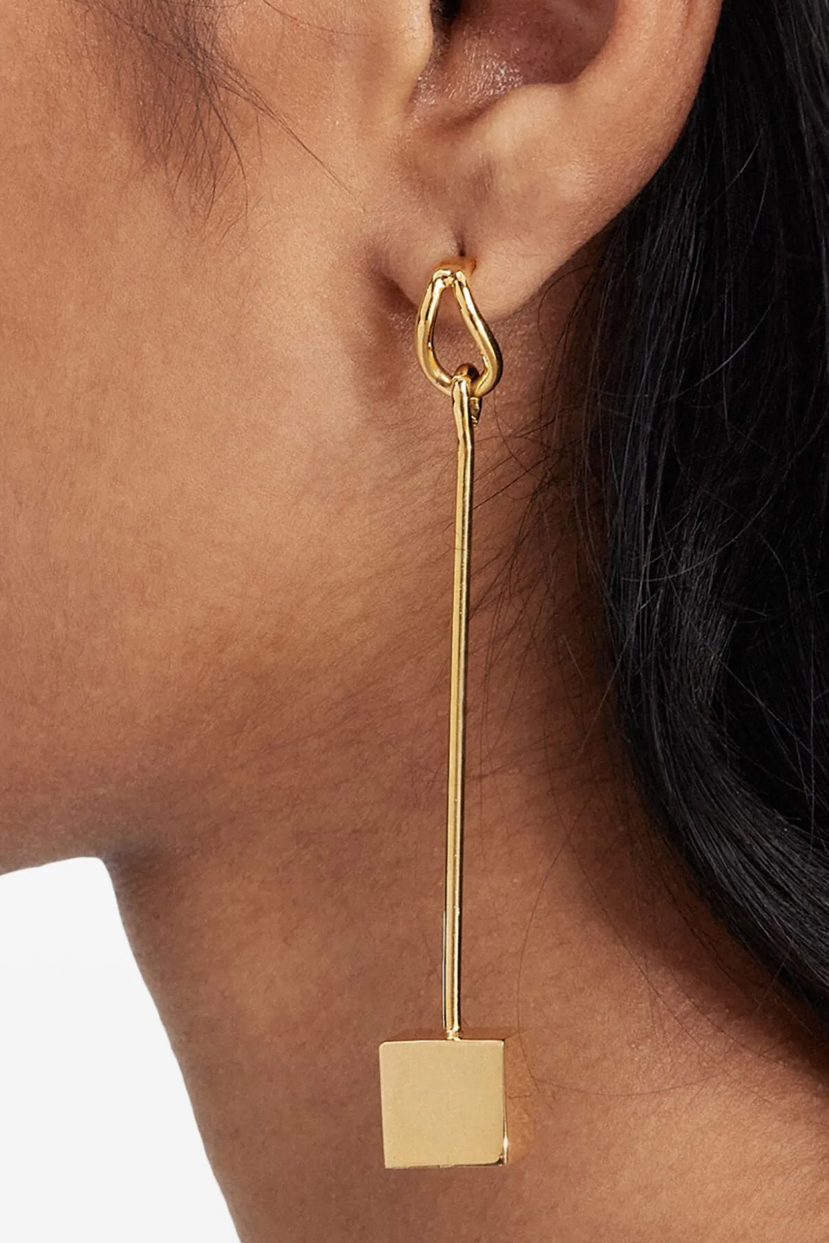 'Les Boucles Nodo' earrings in plated brass with smooth finish, thin suspended bar model with round and square end, butterfly closure. ITEM CANNOT BE RETURNED