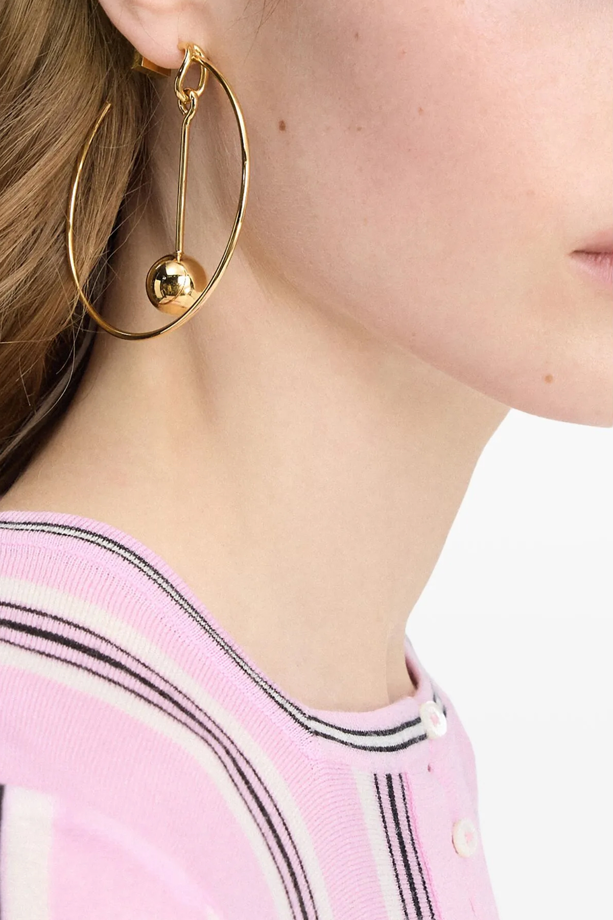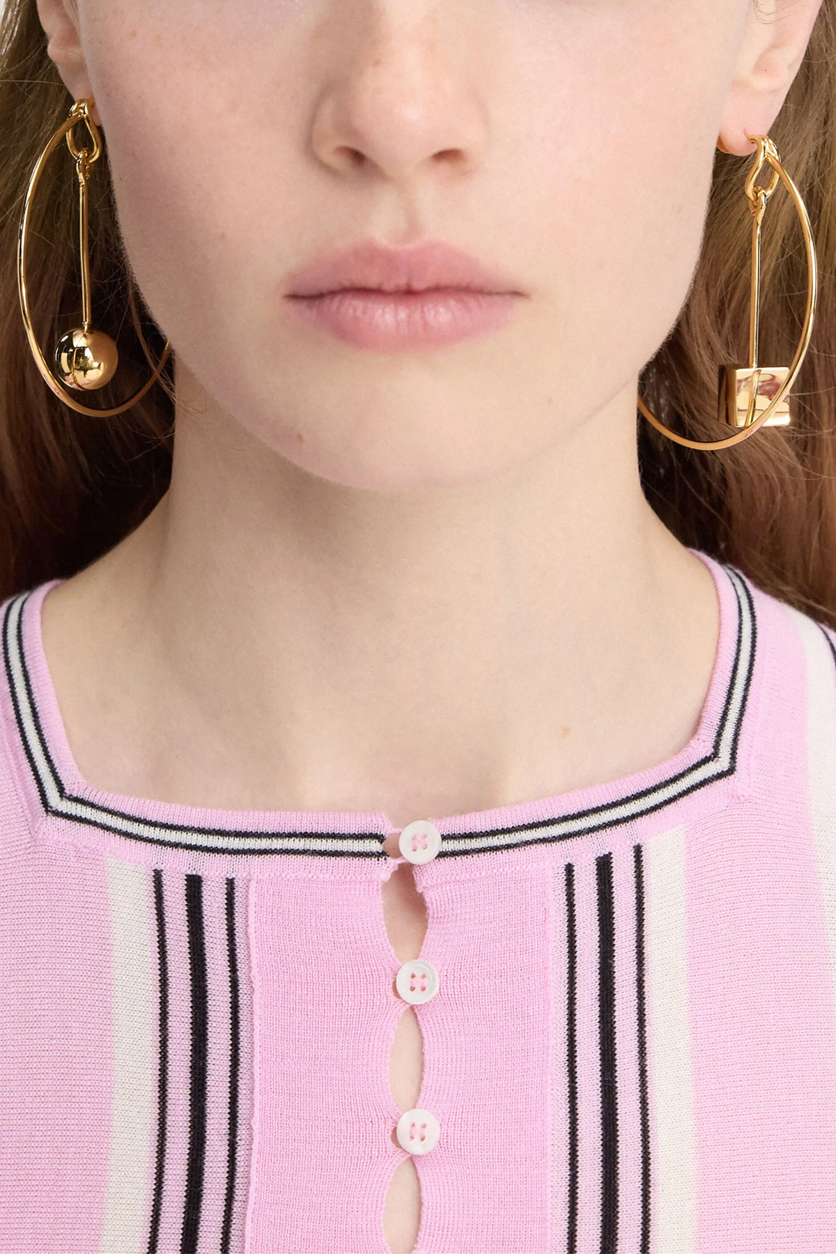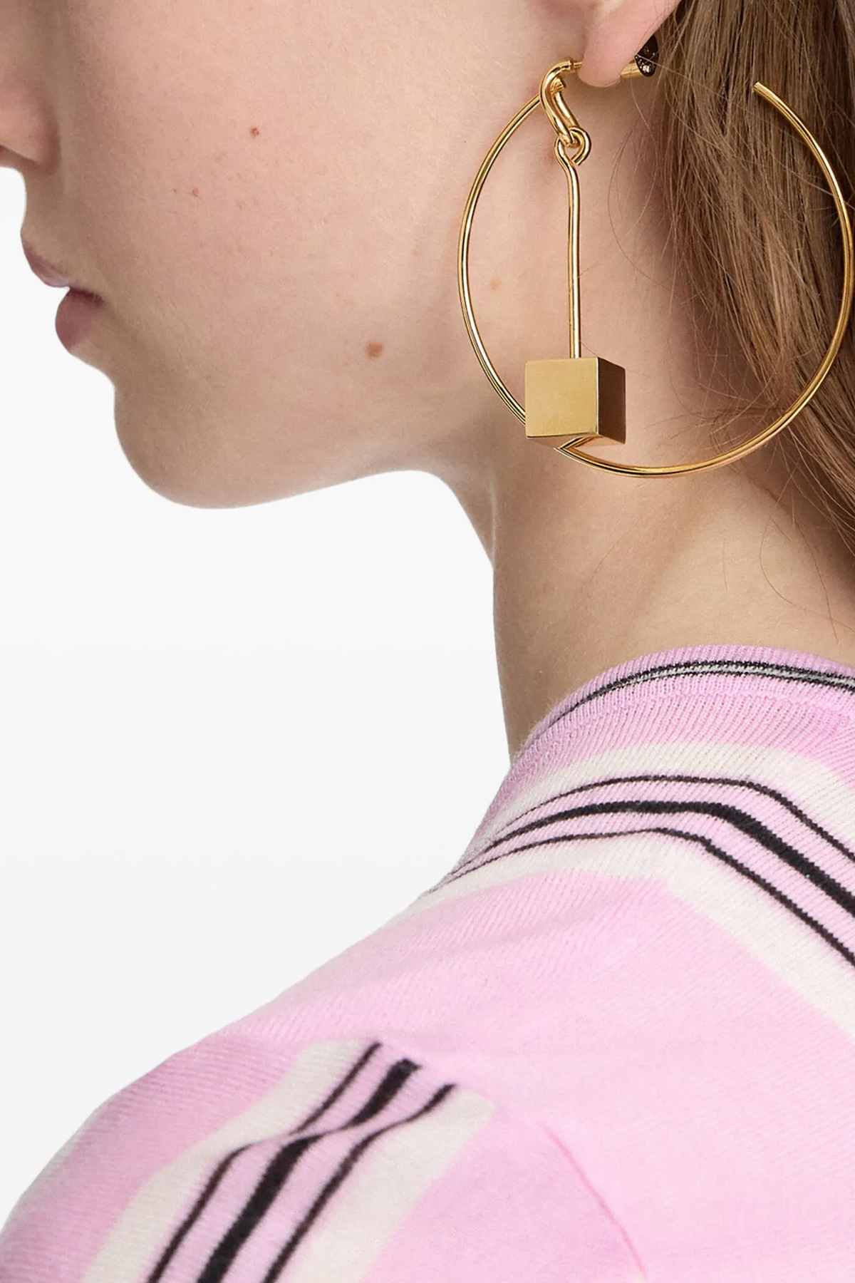 Les Creoles Nodo' brass plated earrings with smooth finish, thin circle model with suspended round and square charm, butterfly closure. ITEM CANNOT BE RETURNED