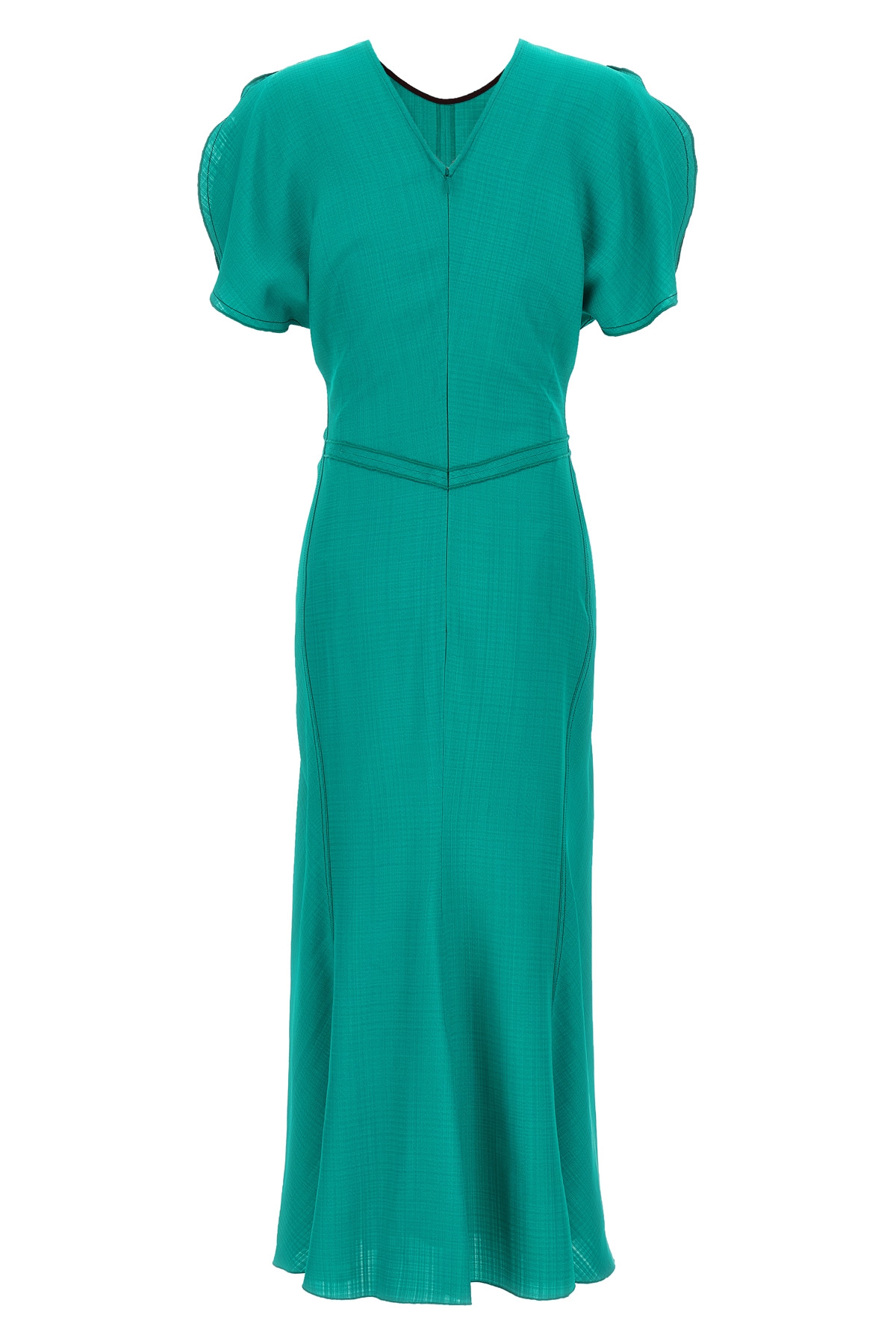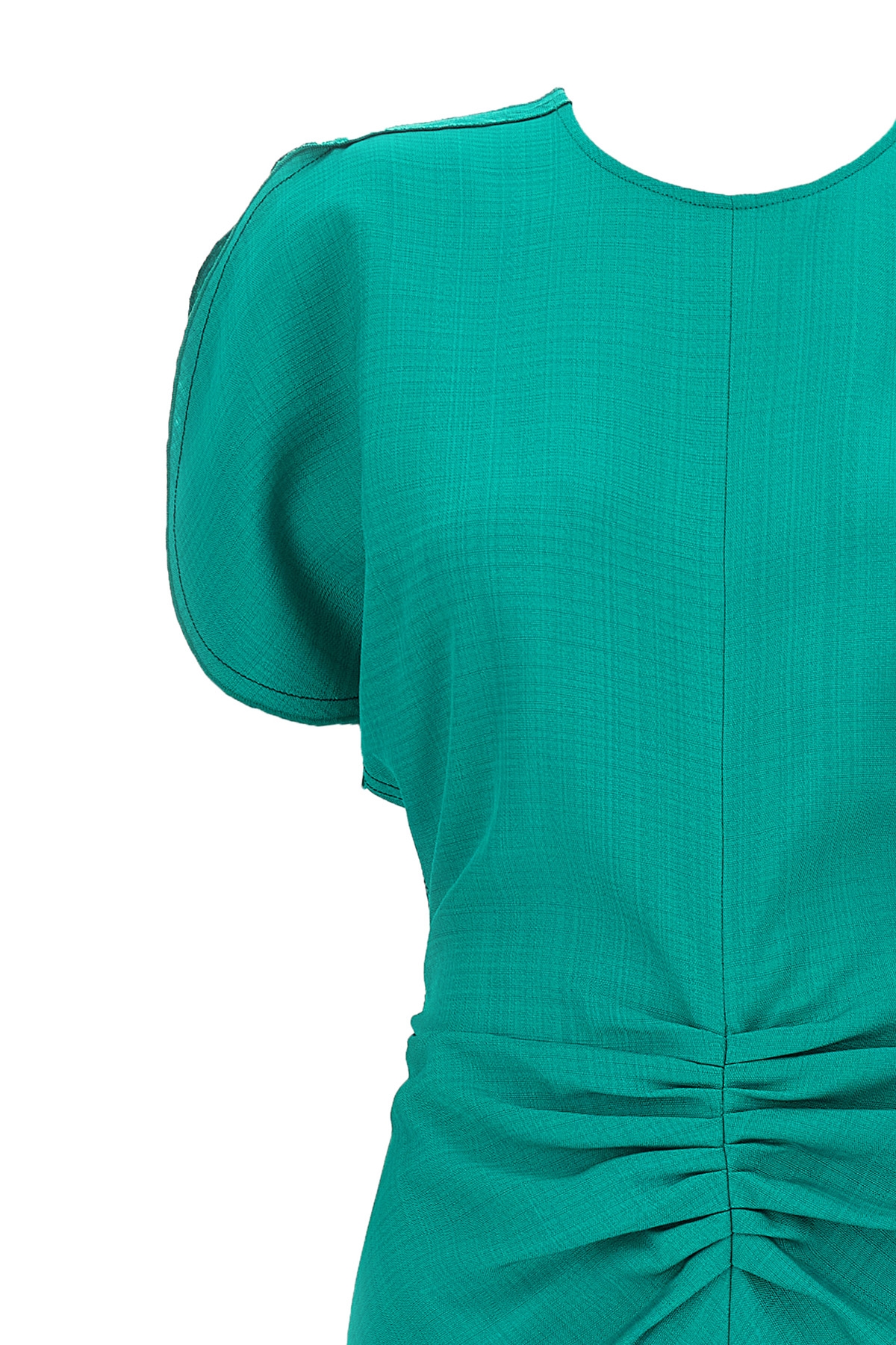 'Gathered Waist Midi' dress in new viscose, tight at the waist with crinkled detail, front round neckline, V-neck and back zip closure, short sleeves with slits, contrast stitching.