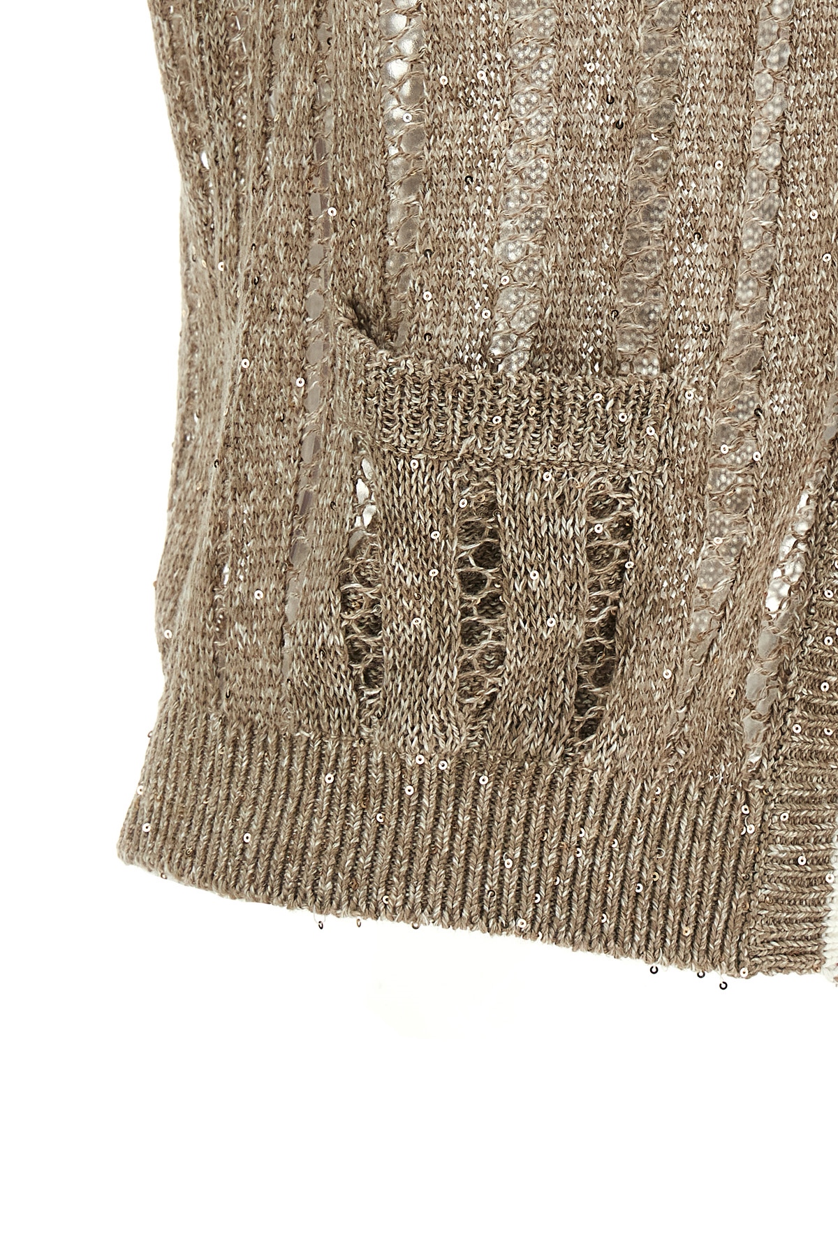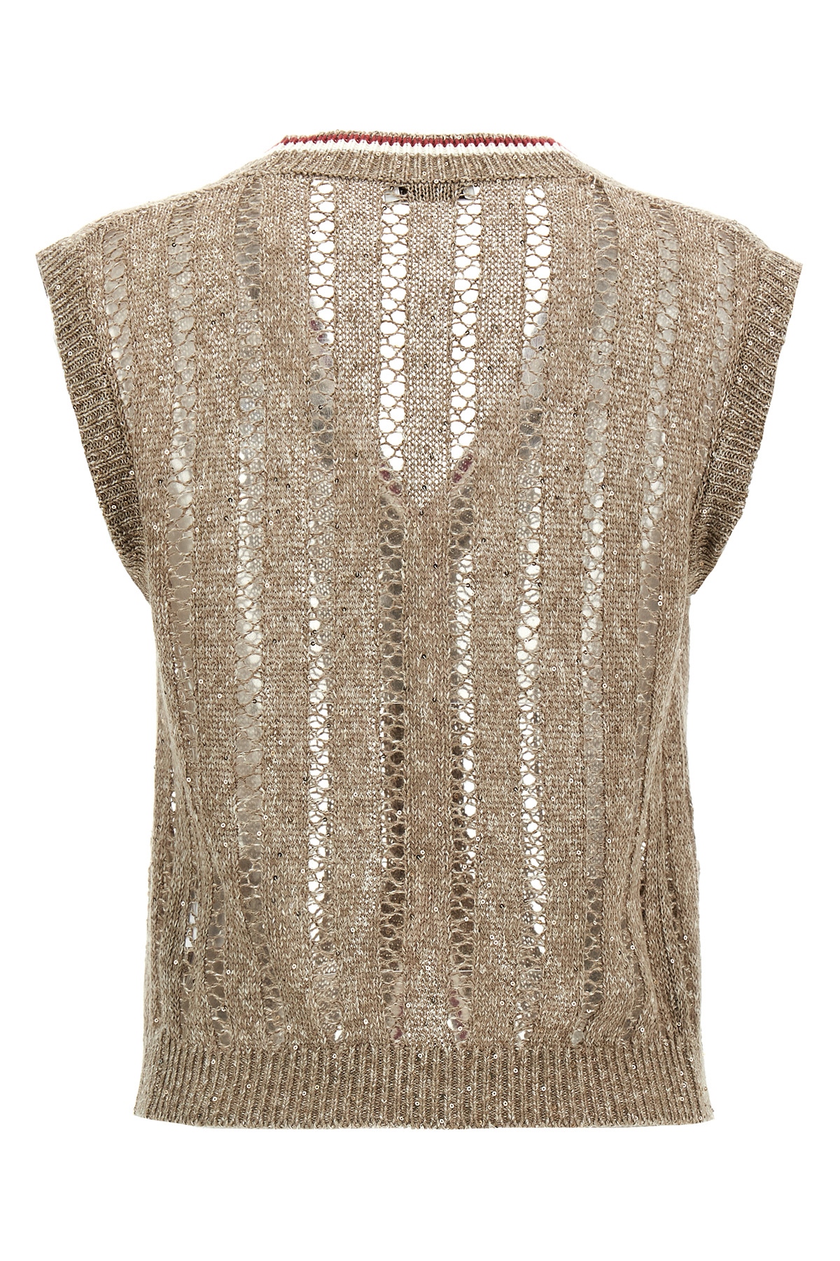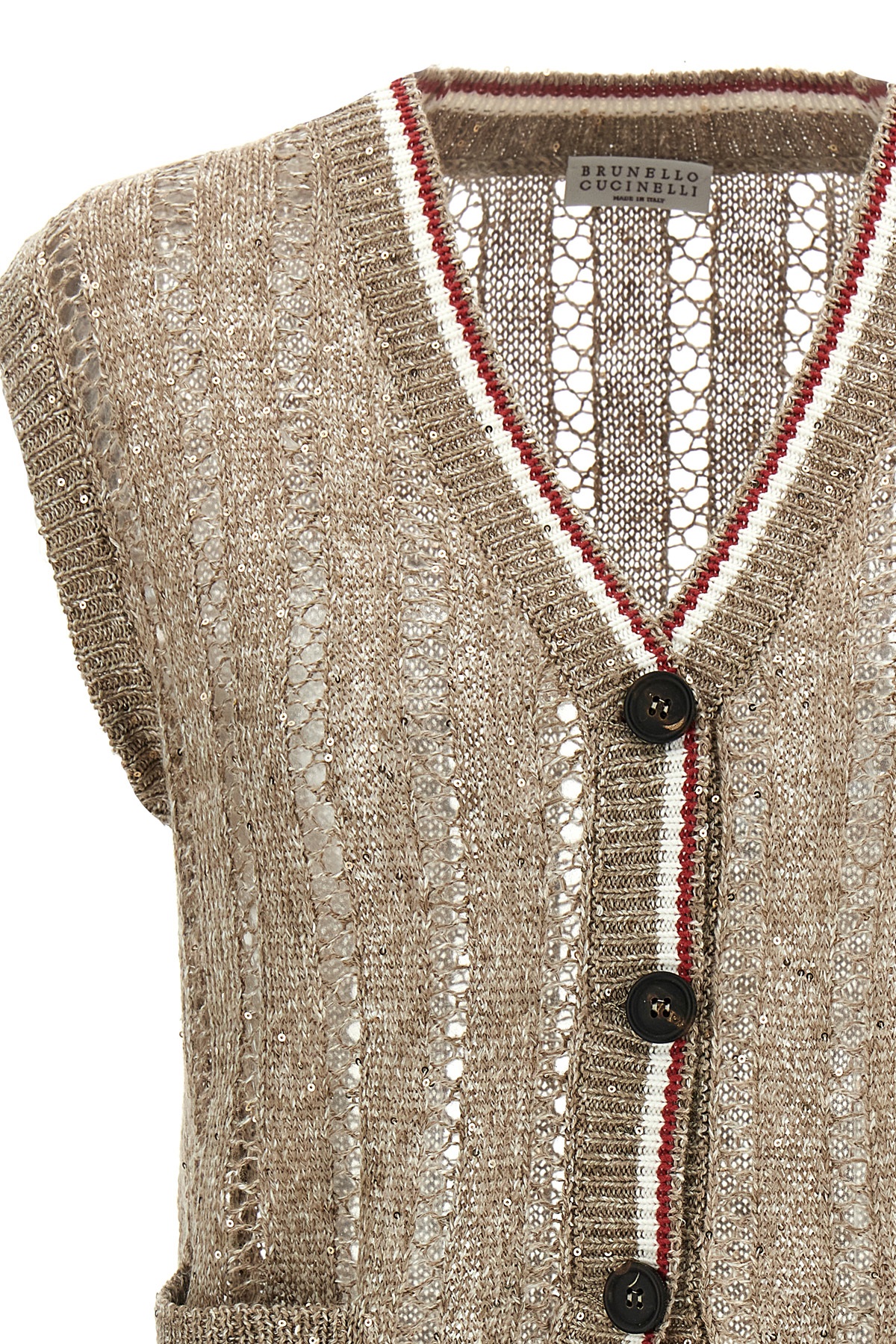 'Dazzling Ribbed Net' ribbed linen vest with very wide stitches with all-over sequin applique, contrast details, front button closure, V-neck, pockets.