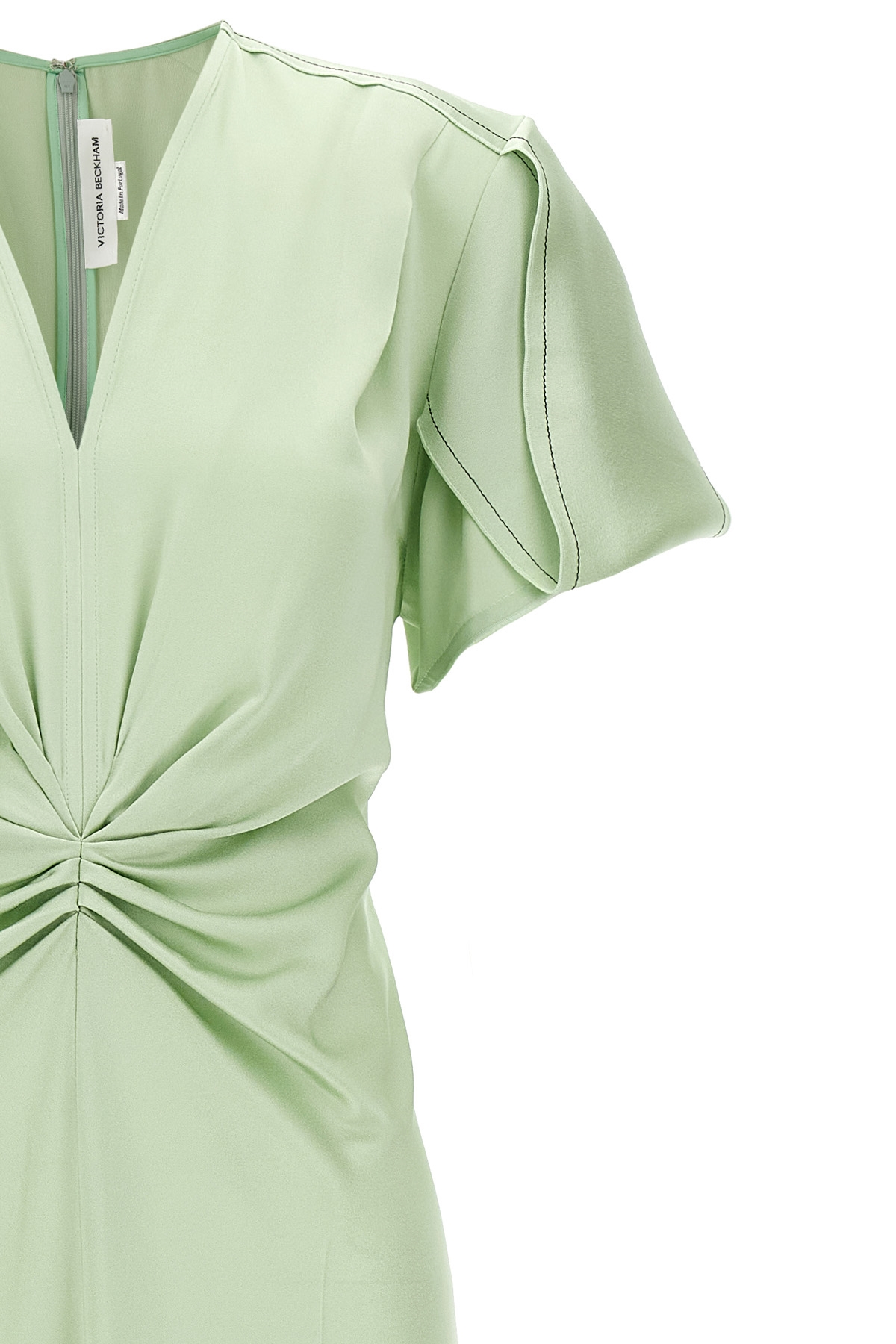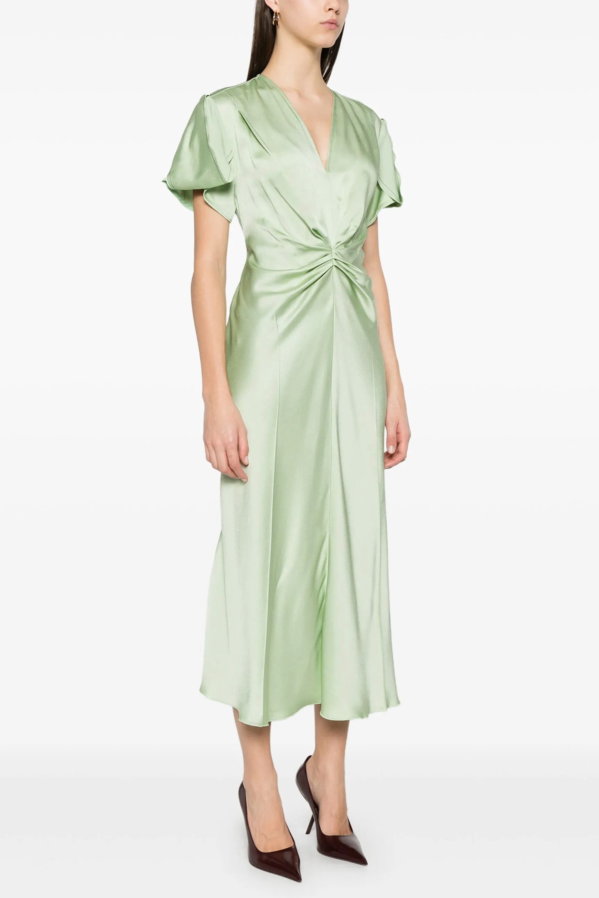 'Gathered Waist Midi' dress in fluid cady fabric tight at the waist with draping detail, V-neck, short sleeves with drape, contrast stitching, back zip closure.