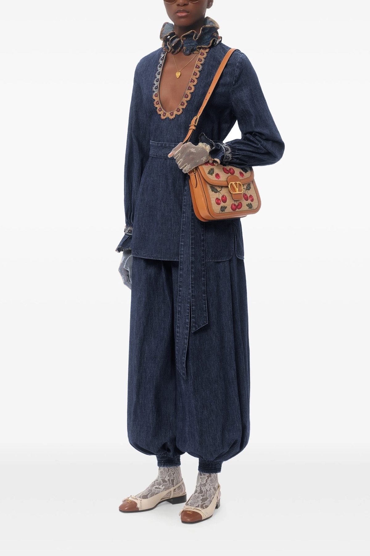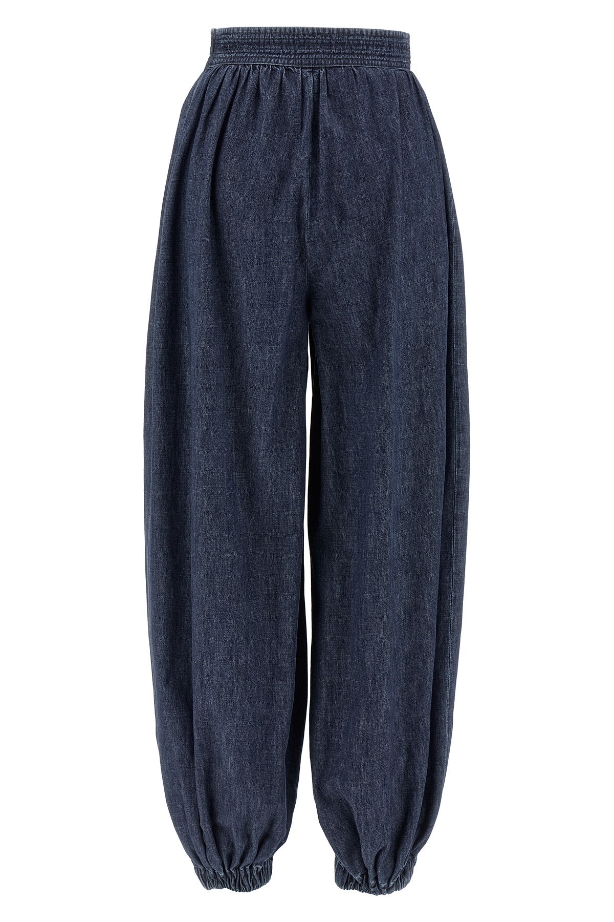 Chambray cotton denim pants with loose leg, high waist, printed fabric piping pockets, elastic waistband, elastic ankle cuffs.