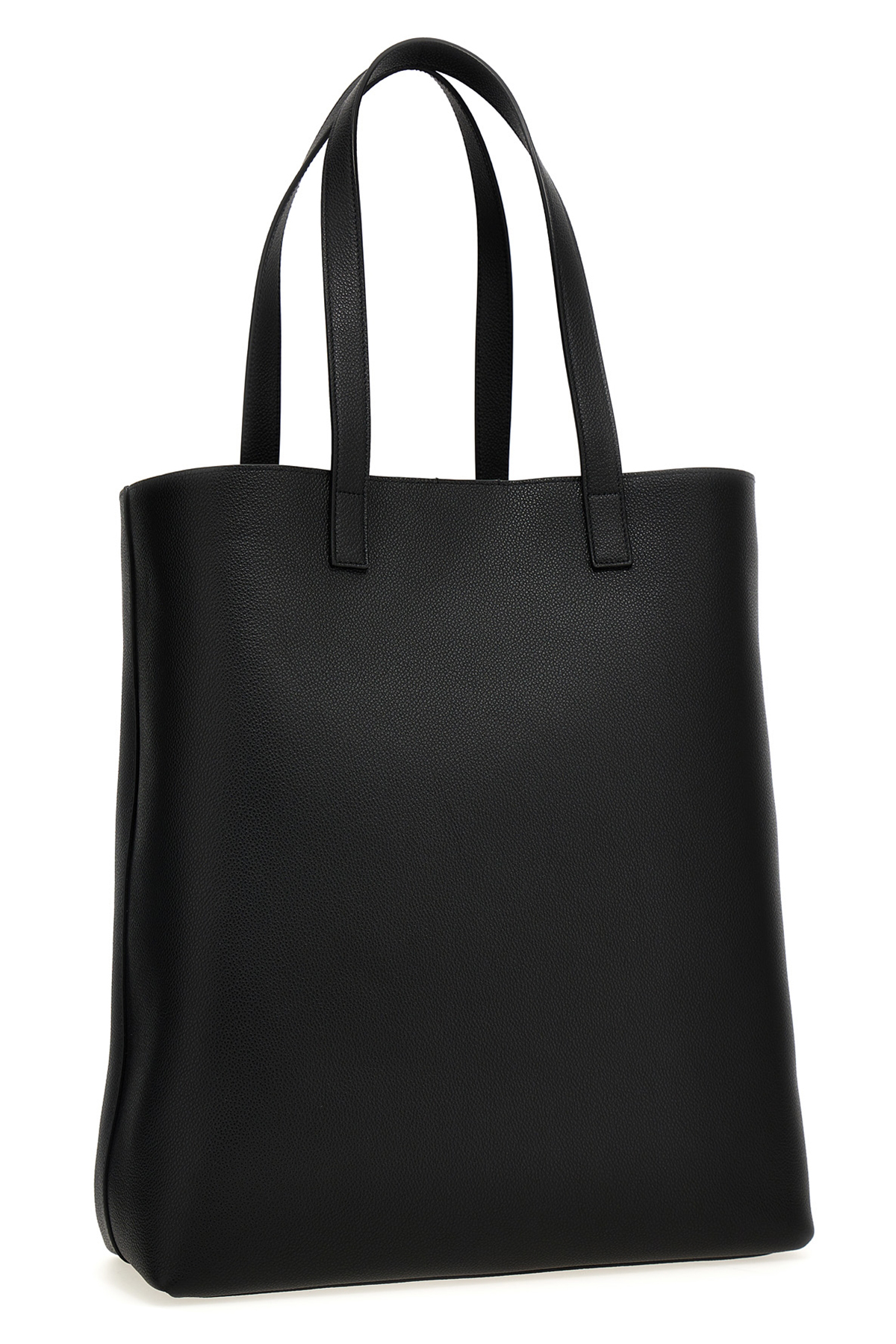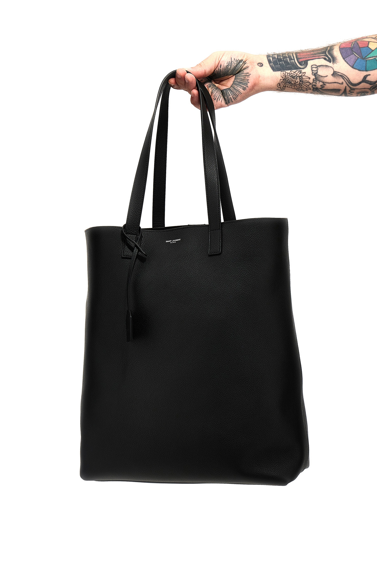 'YSL BV Bold' leather shopping bag with front logo print, double handle, snap button closure, removable leather-covered keyring, removable inner clutch.