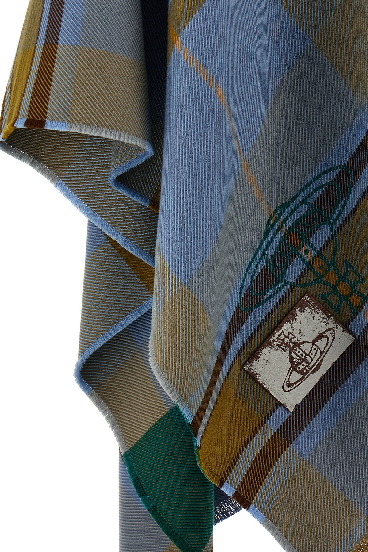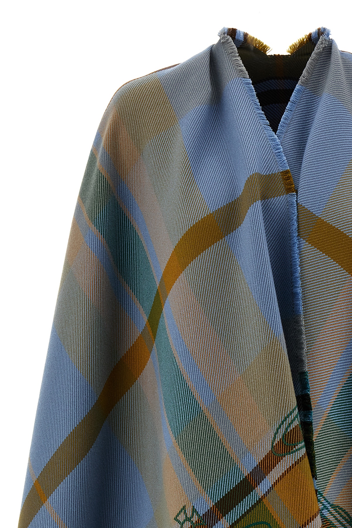 Tartan print double-sided wool and cotton blend poncho with maxi Orb jacquard logo and frayed edges.