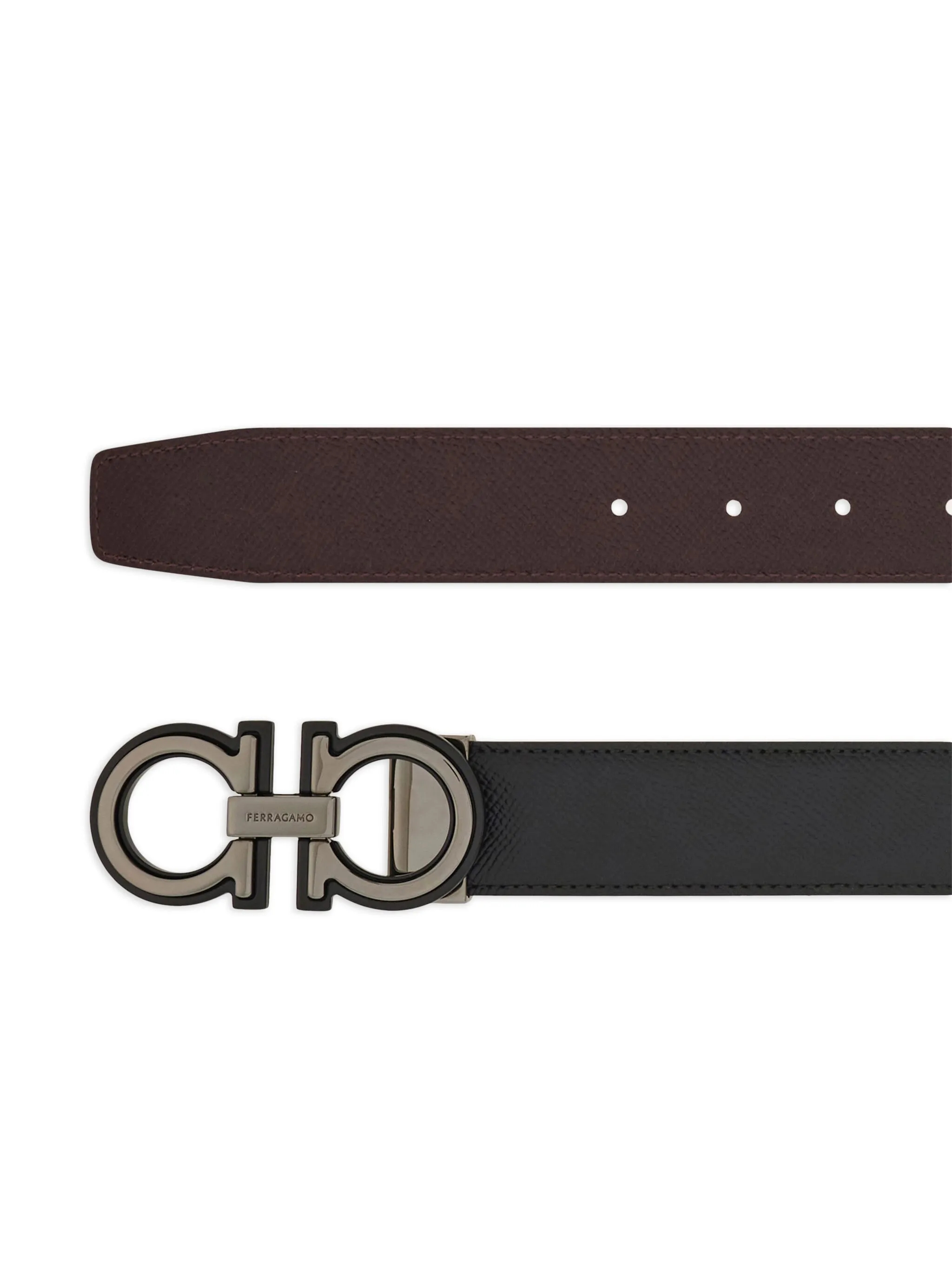 blackbrown calf leather reversible Gancini buckle pin fastening adjustable fit punched holes gunmetaltone hardware This piece comes complete with a protective dust bag