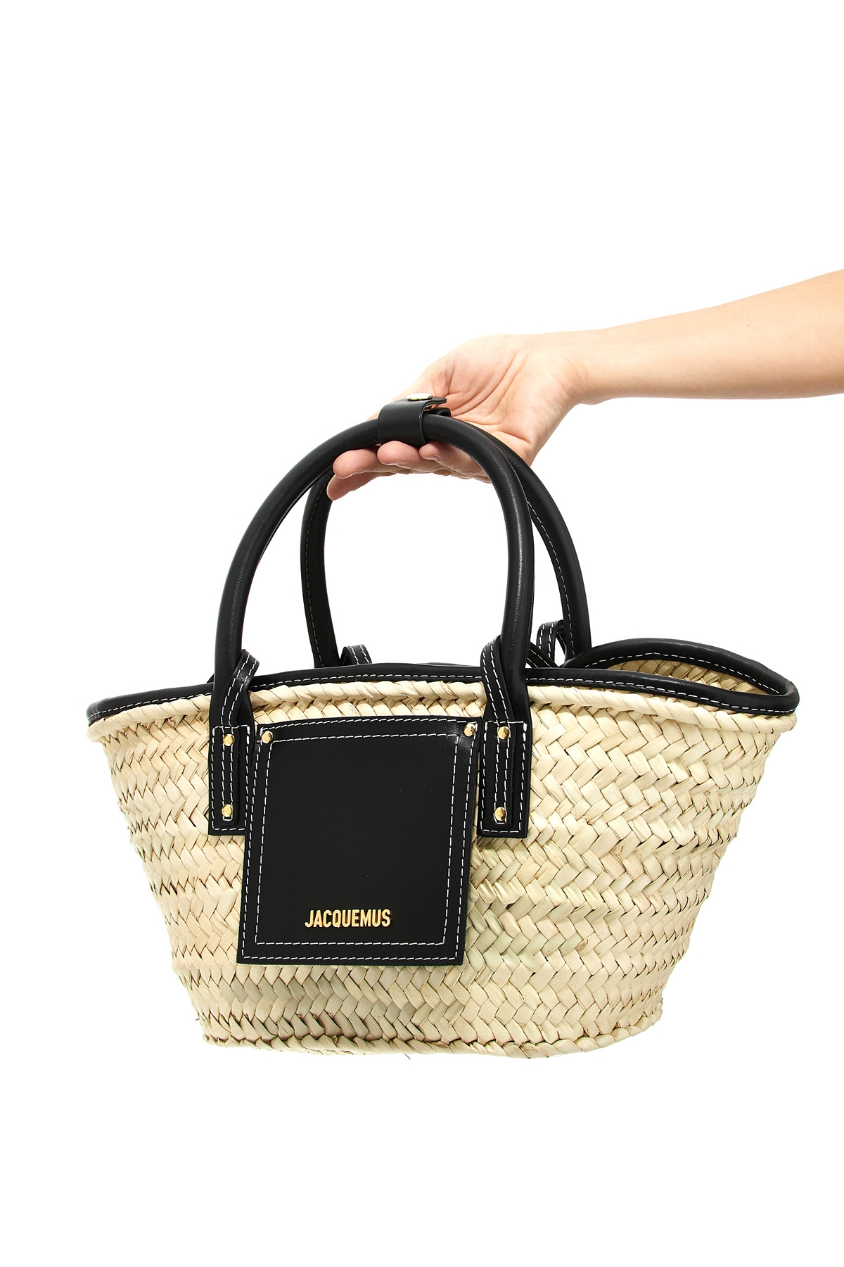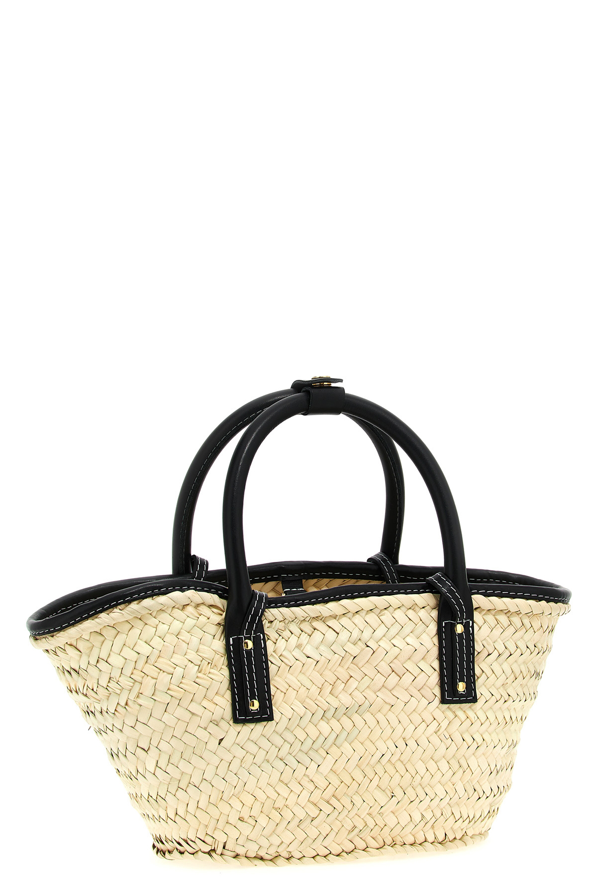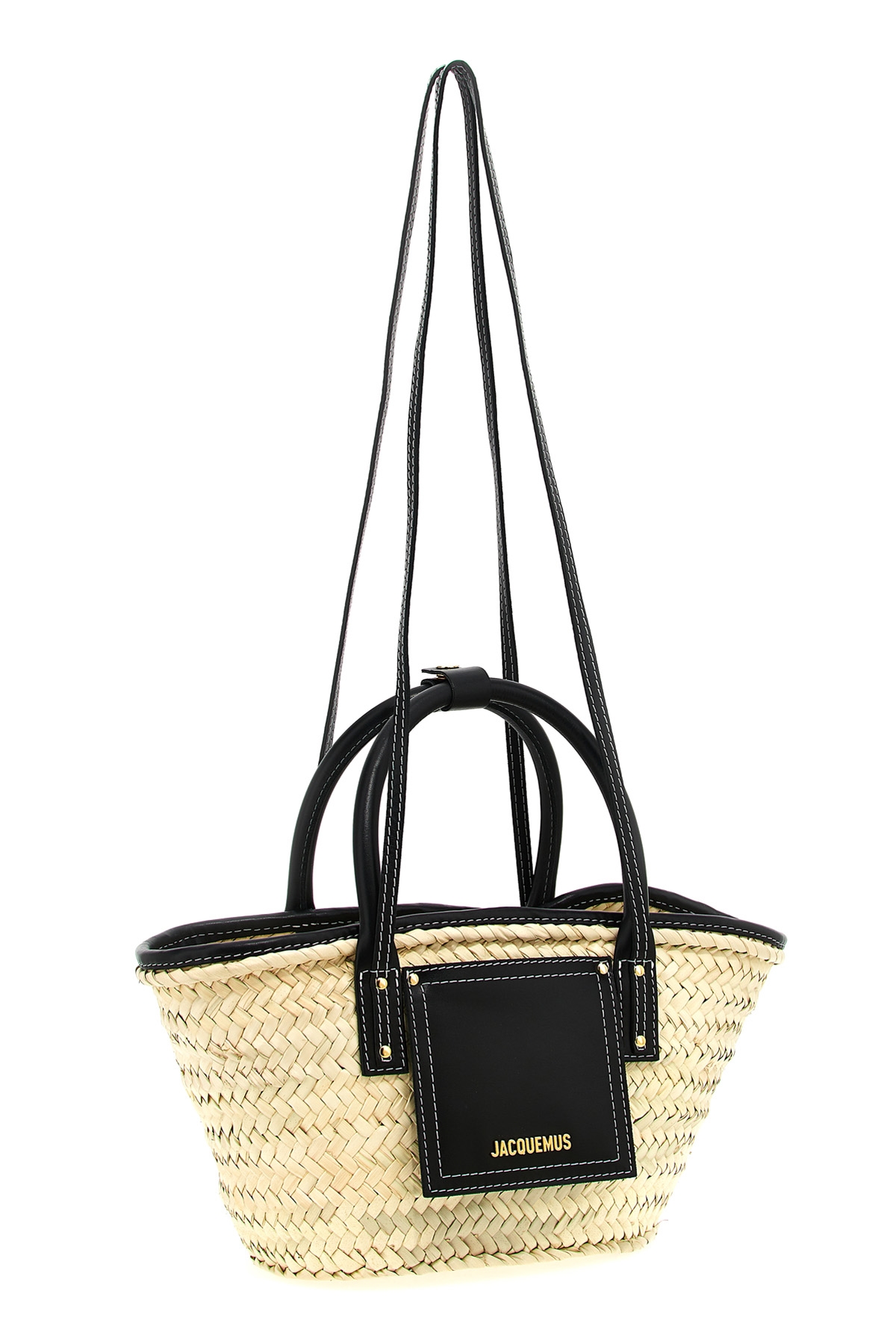 'Le Petit Panier Soli' woven straw shopping bag with leather details, leather front pocket with metal lettering logo, double short tubular handle, double long shoulder handle.