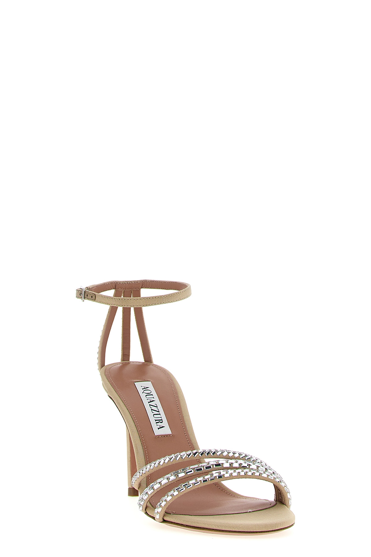 'Milagros' suede and satin sandals with all-over crystal applique, adjustable ankle strap, heel, leather sole.