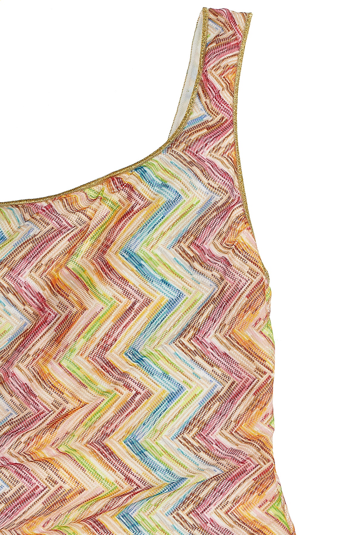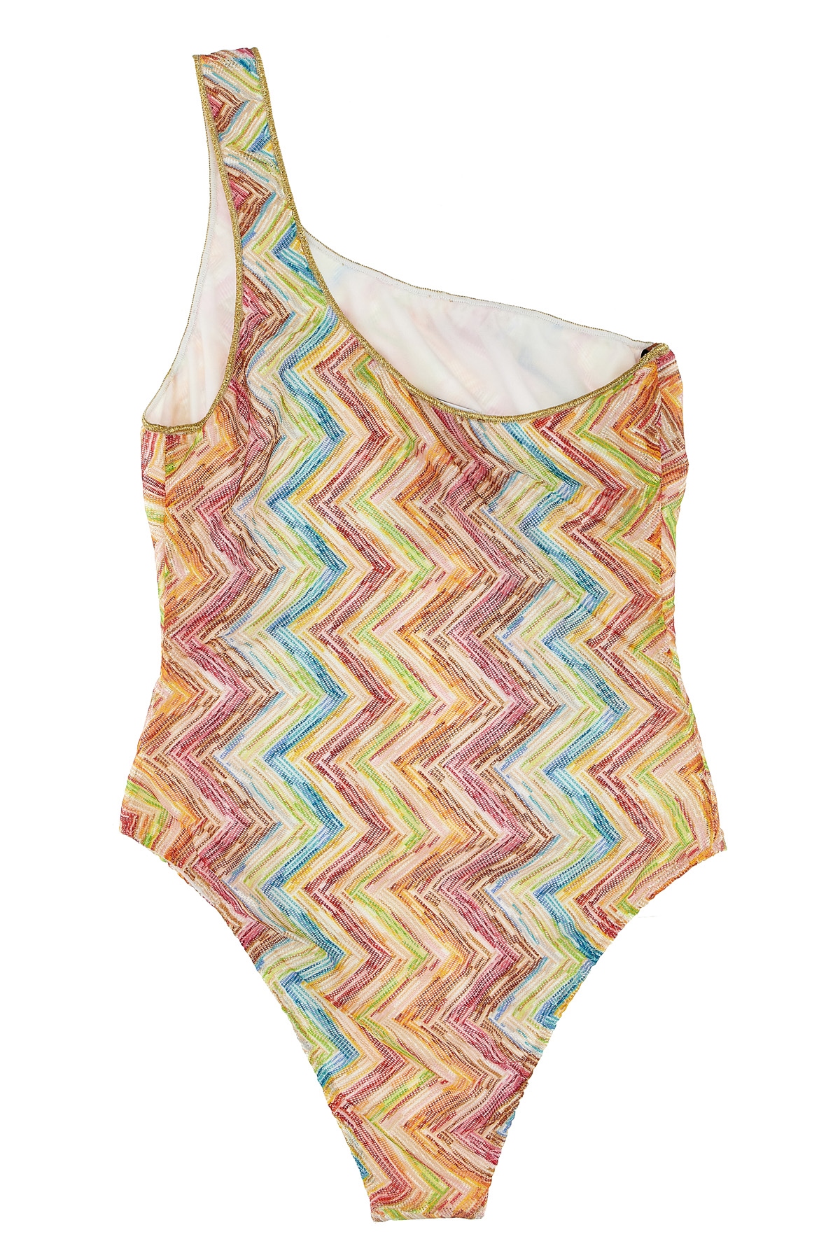 One-piece swimsuit in printed tulle with zigzag pattern and raschel pattern.