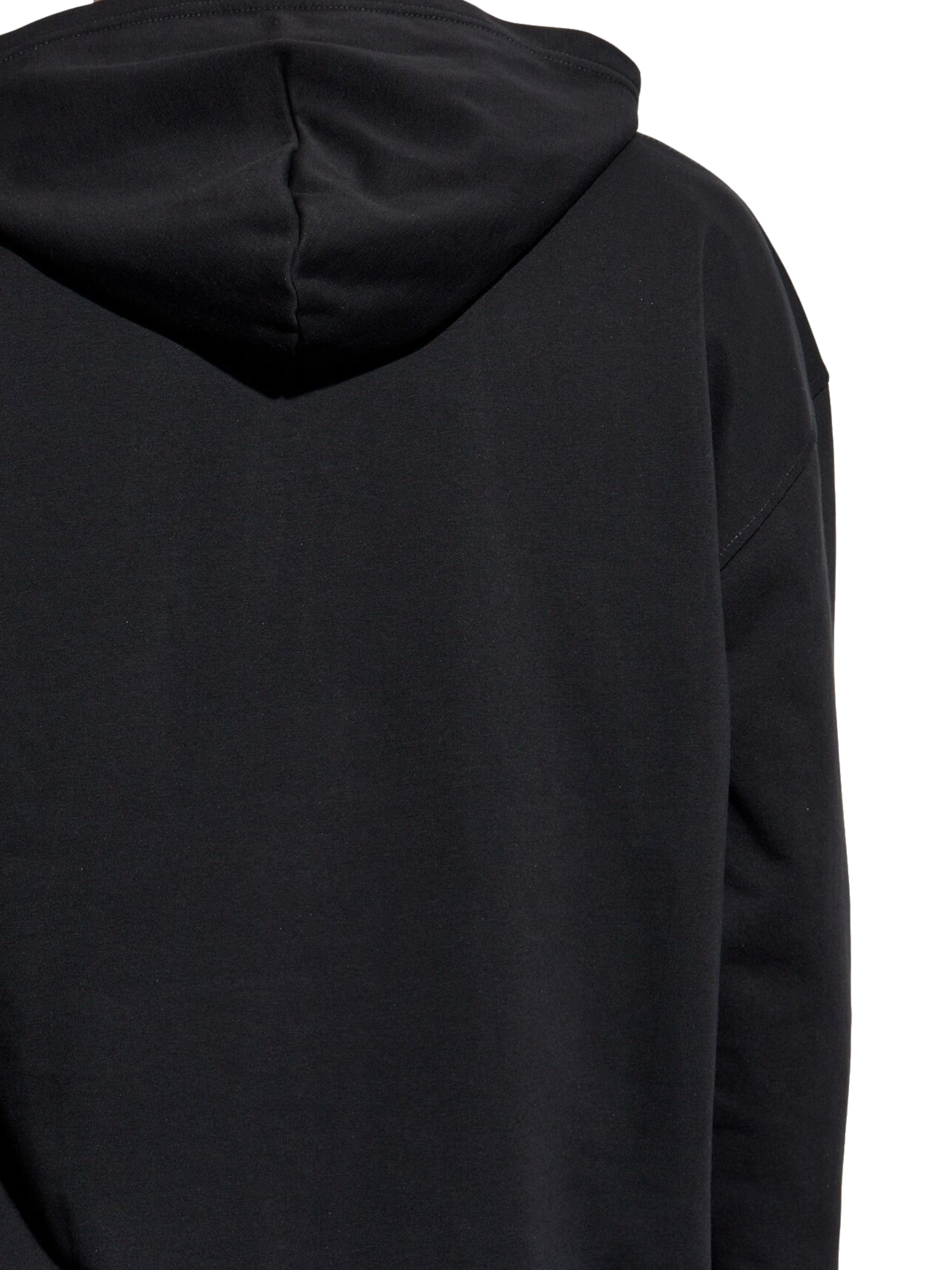 black front pouch pocket ribbed cuffs and hem logo print to the front