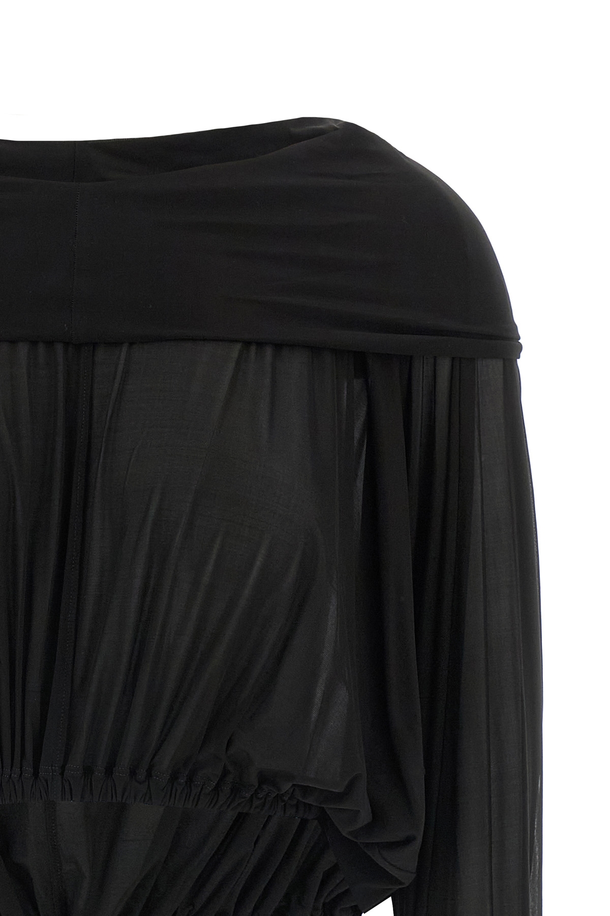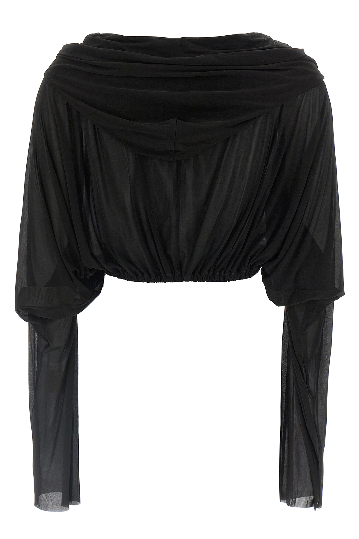 'Crooped Hooded Tunic' semi-transparent cupro sweater, hood, crop model, shawl collar, elastic hem, long bat sleeves with raw cut hem.