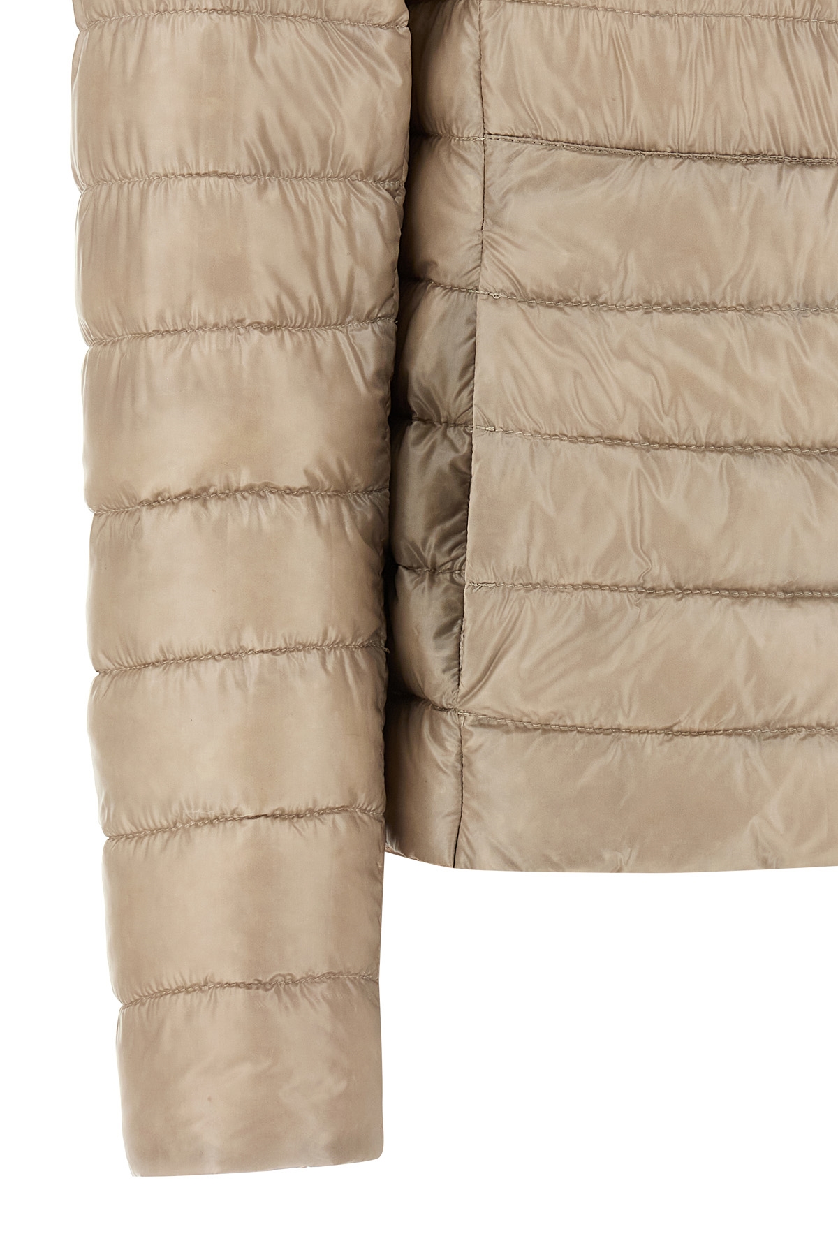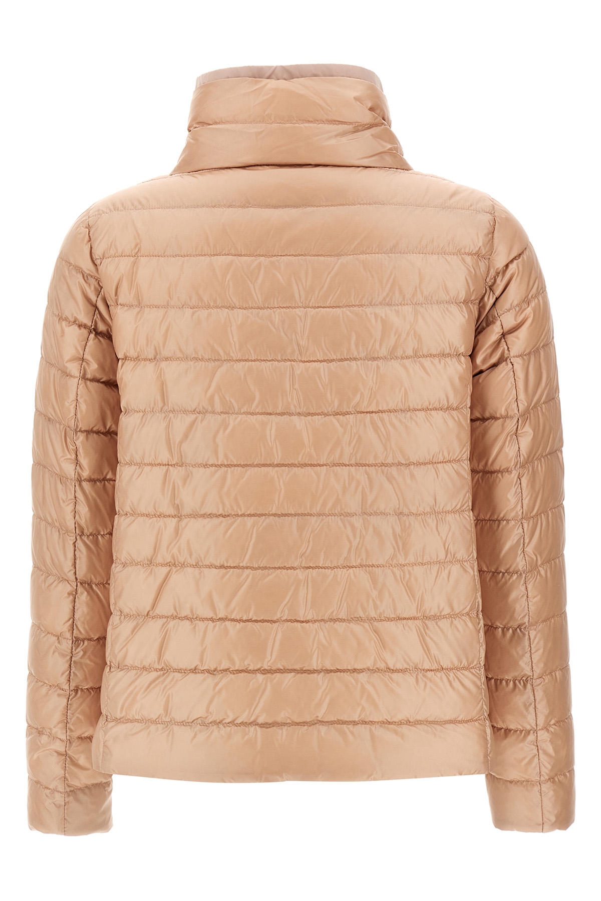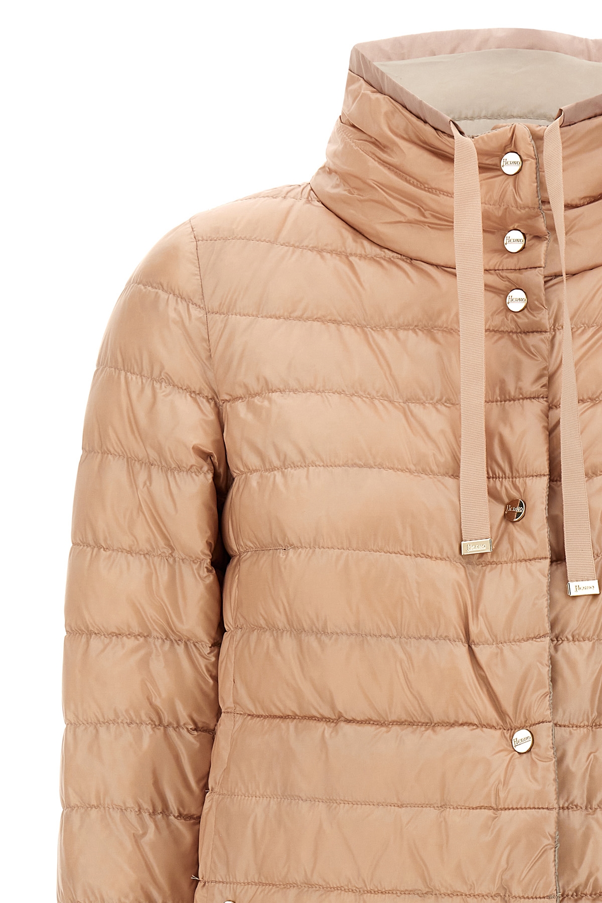 Reversible quilted nylon down jacket with goose down padding, high neck with adjustable drawstring, long sleeves, button closure, pockets.