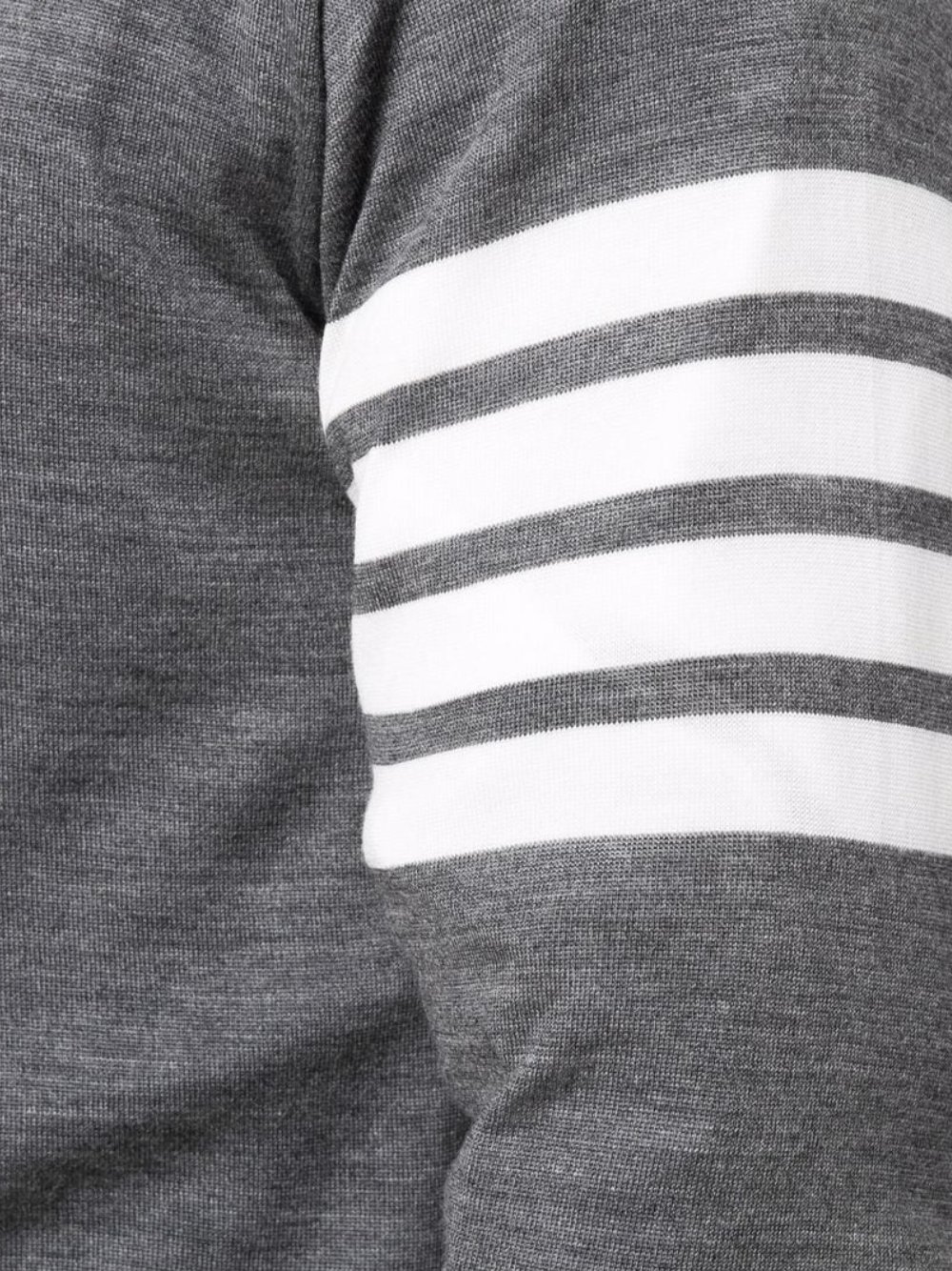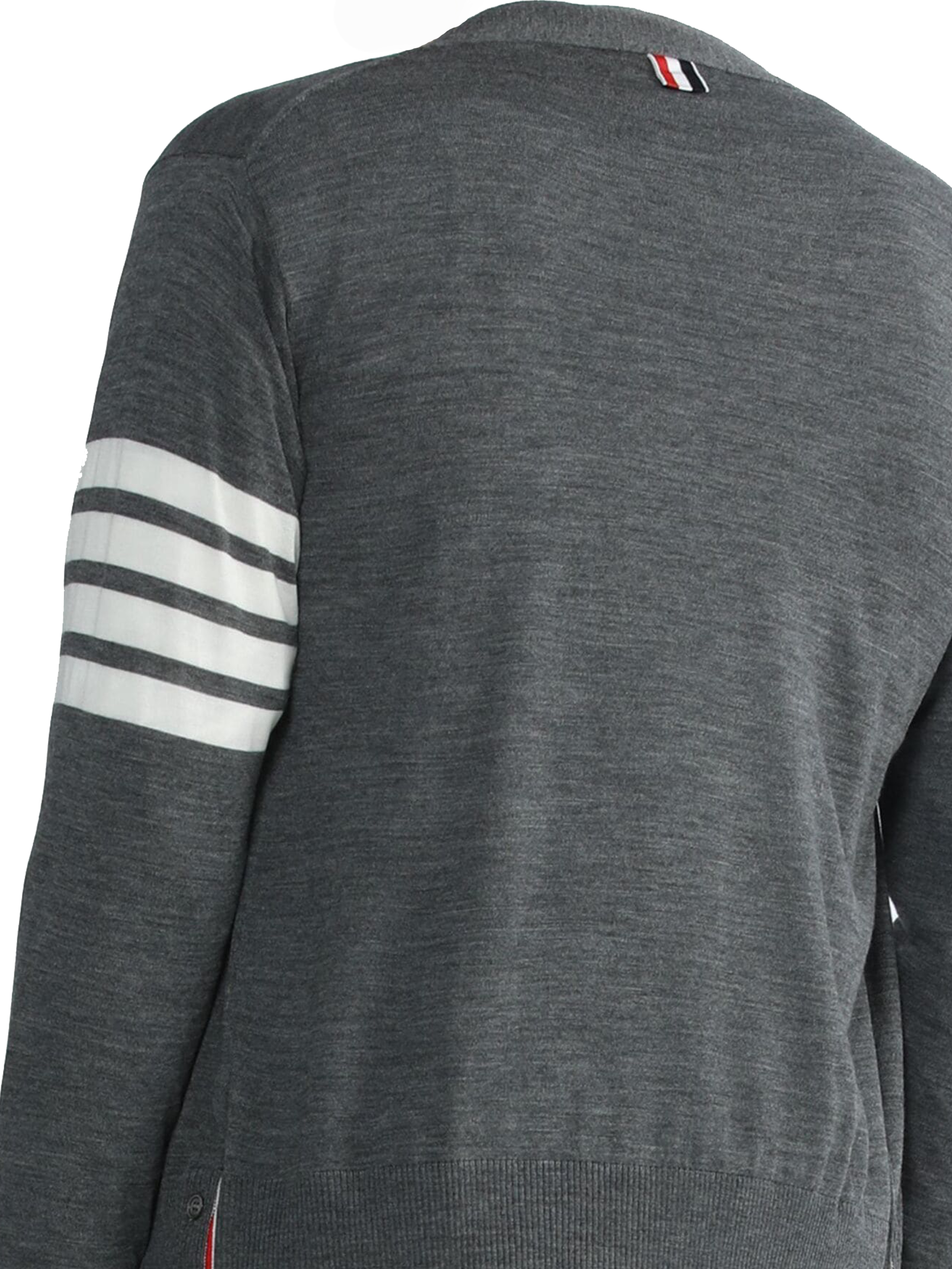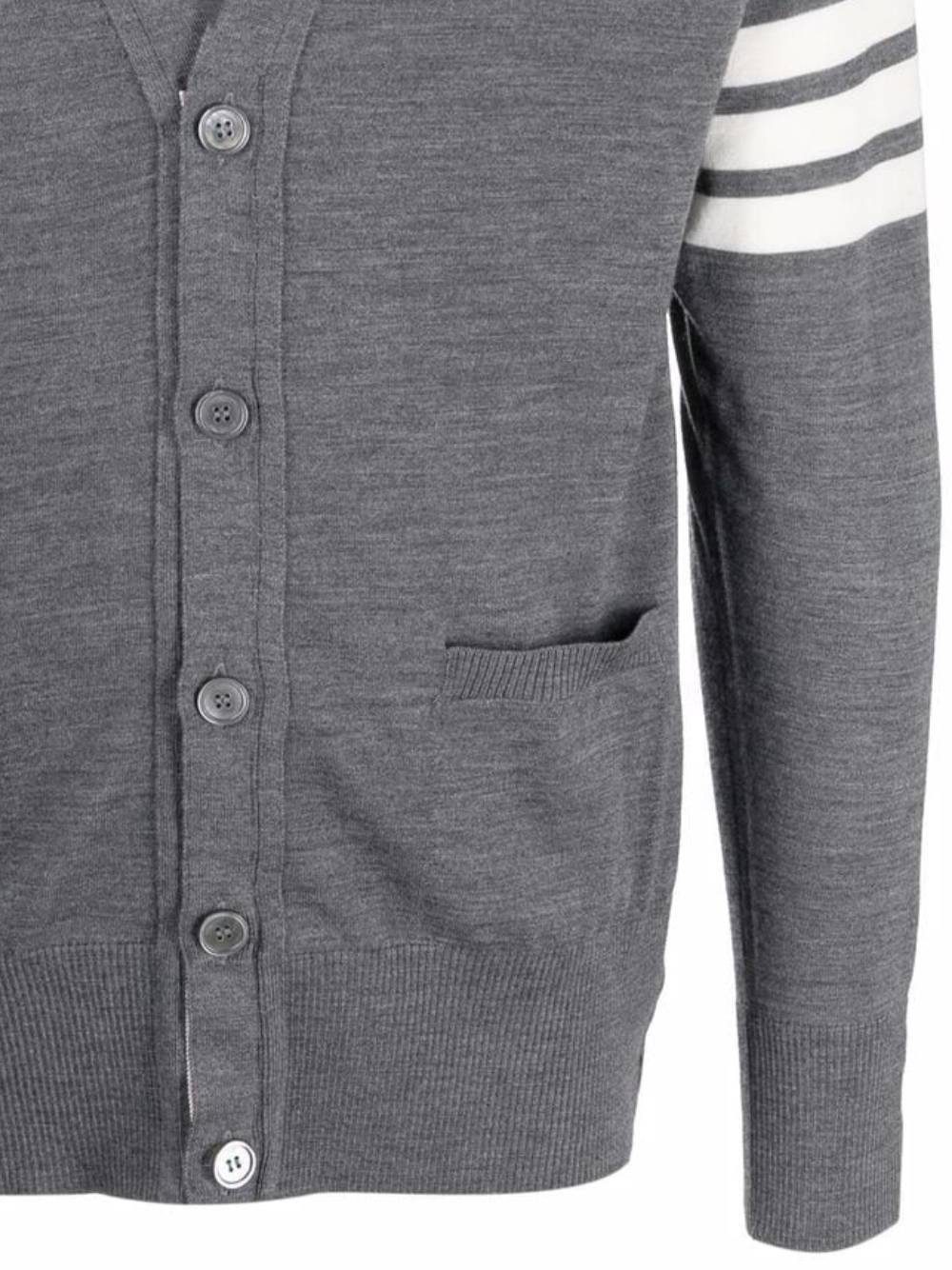 Grey merino 4Bar knitted cardigan from THOM BROWNE featuring signature 4Bar stripe Vneck front button fastening long sleeves and buttoned cuffs