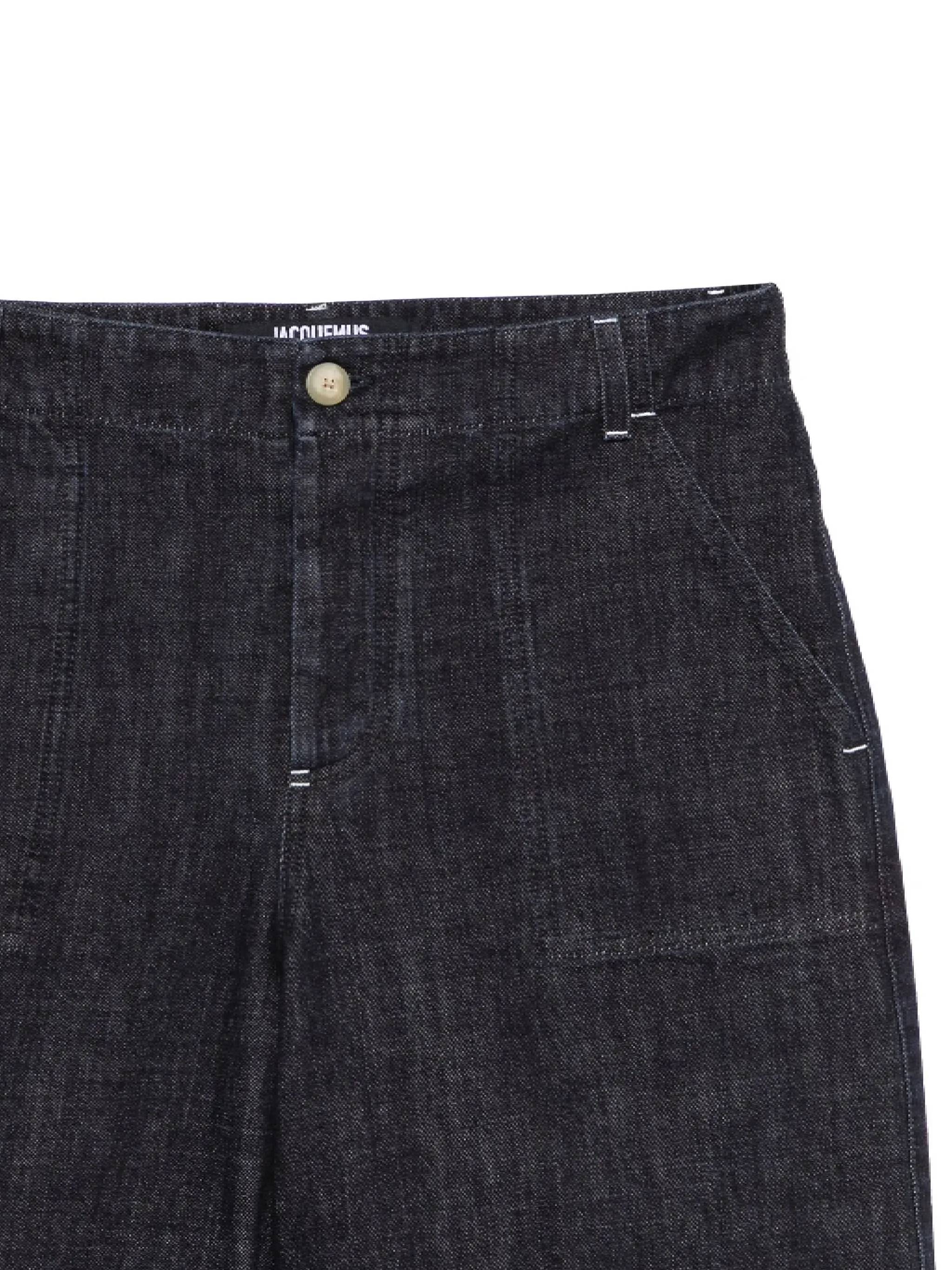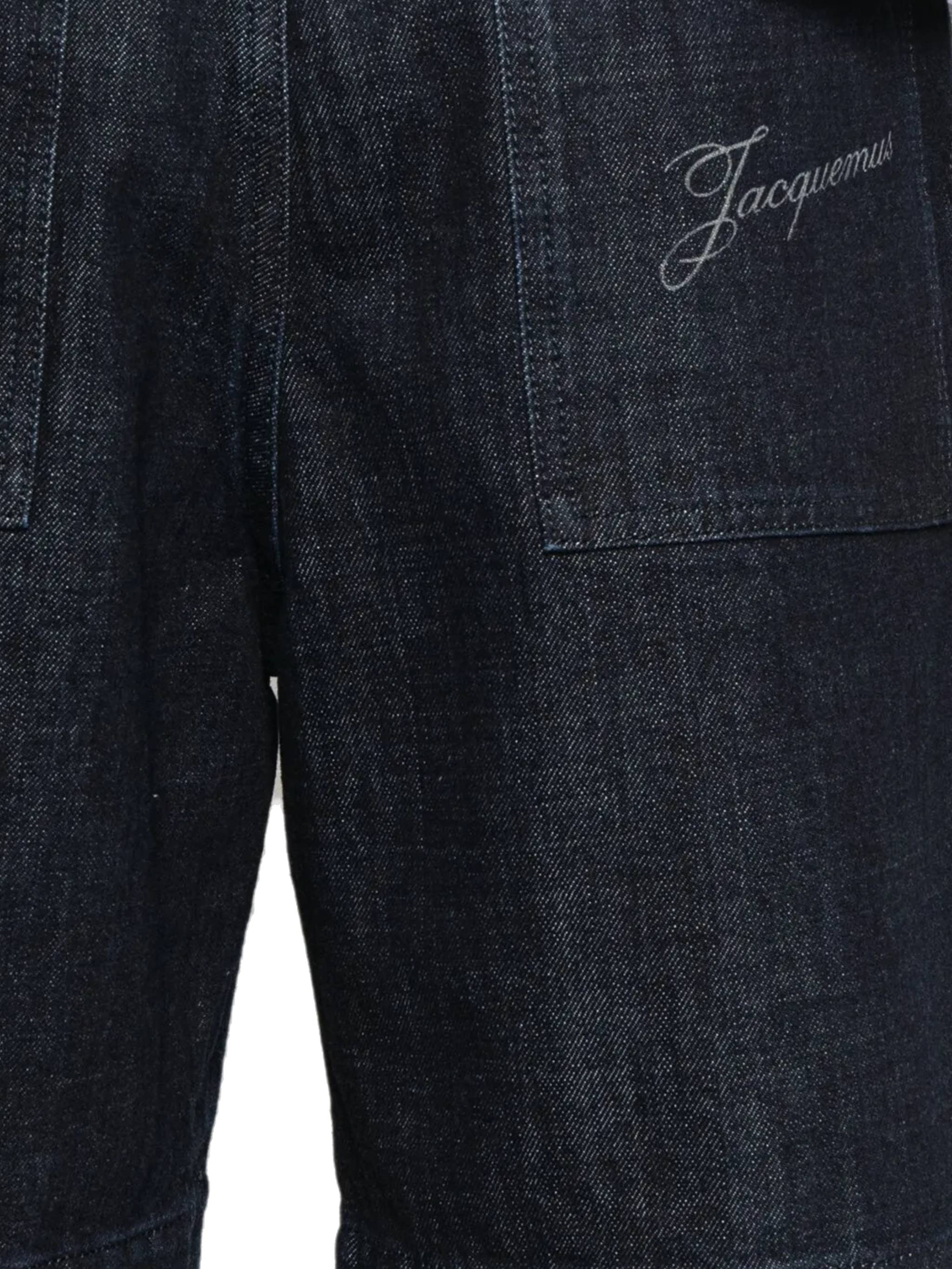 Indigo blue button fly fastening classic five pockets belt loops embroidered logo to the rear