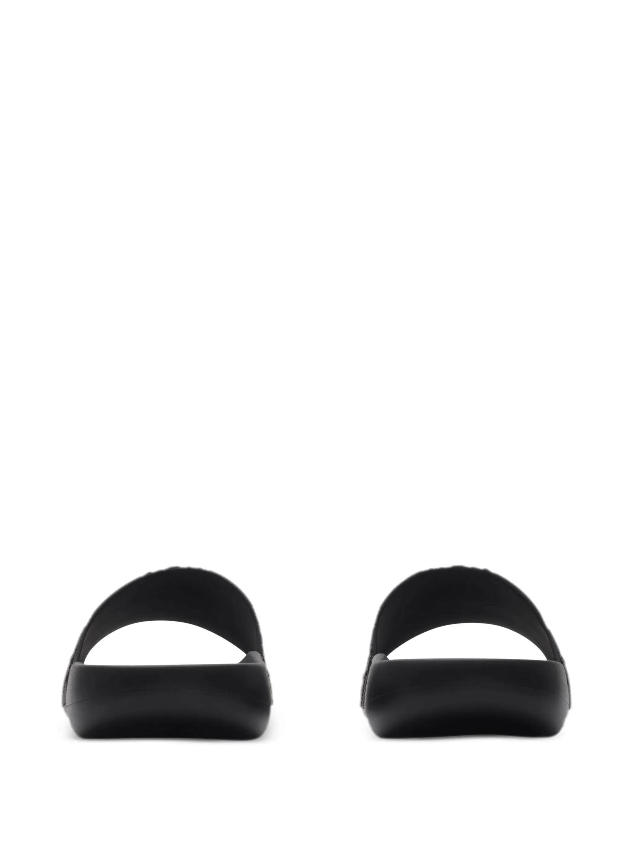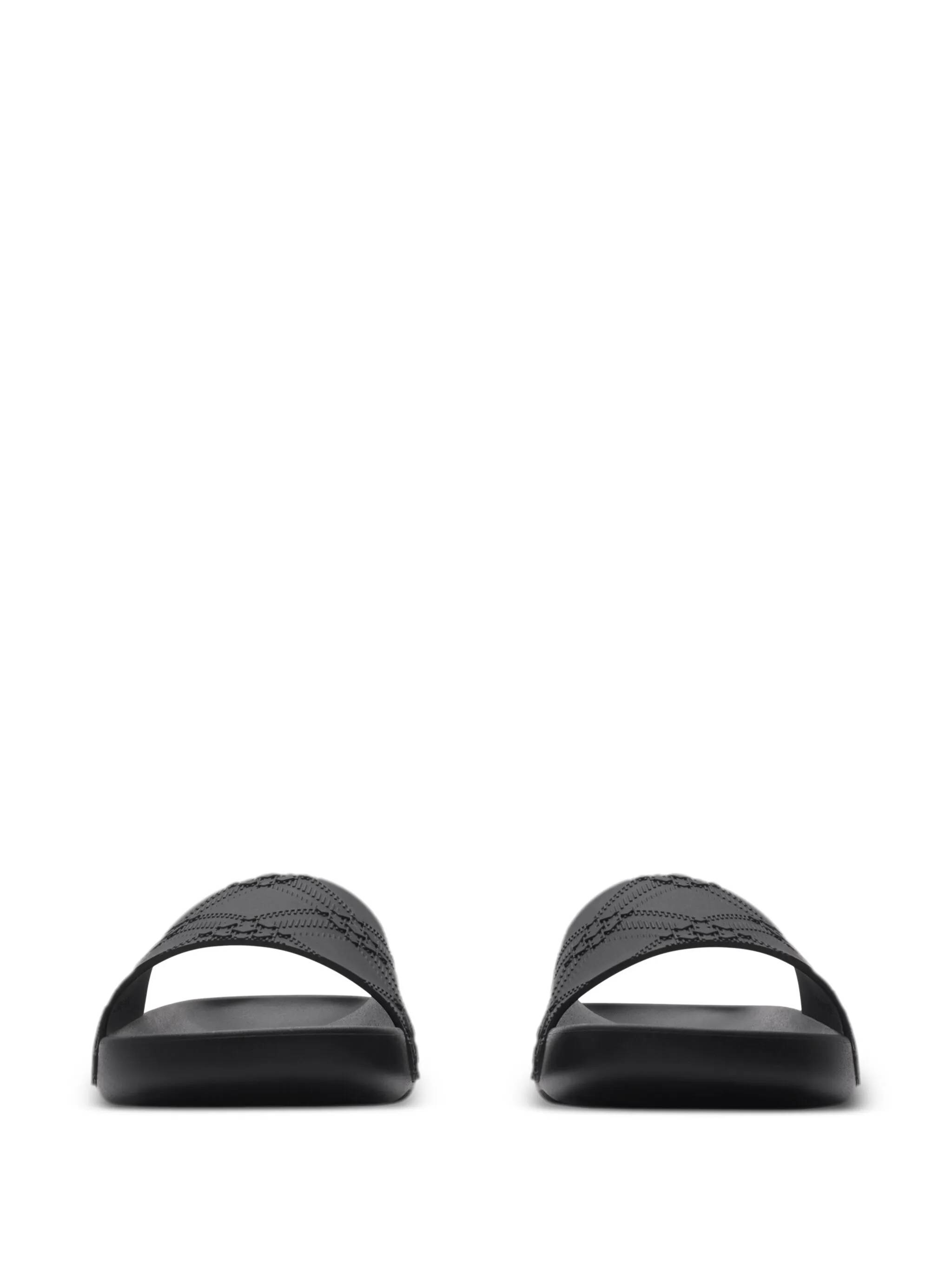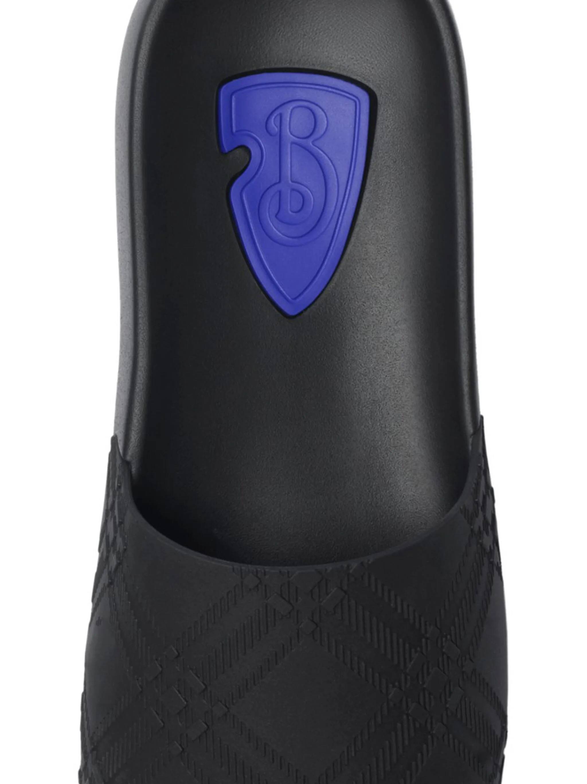 black check pattern slipon style round open toe moulded footbed flat rubber sole