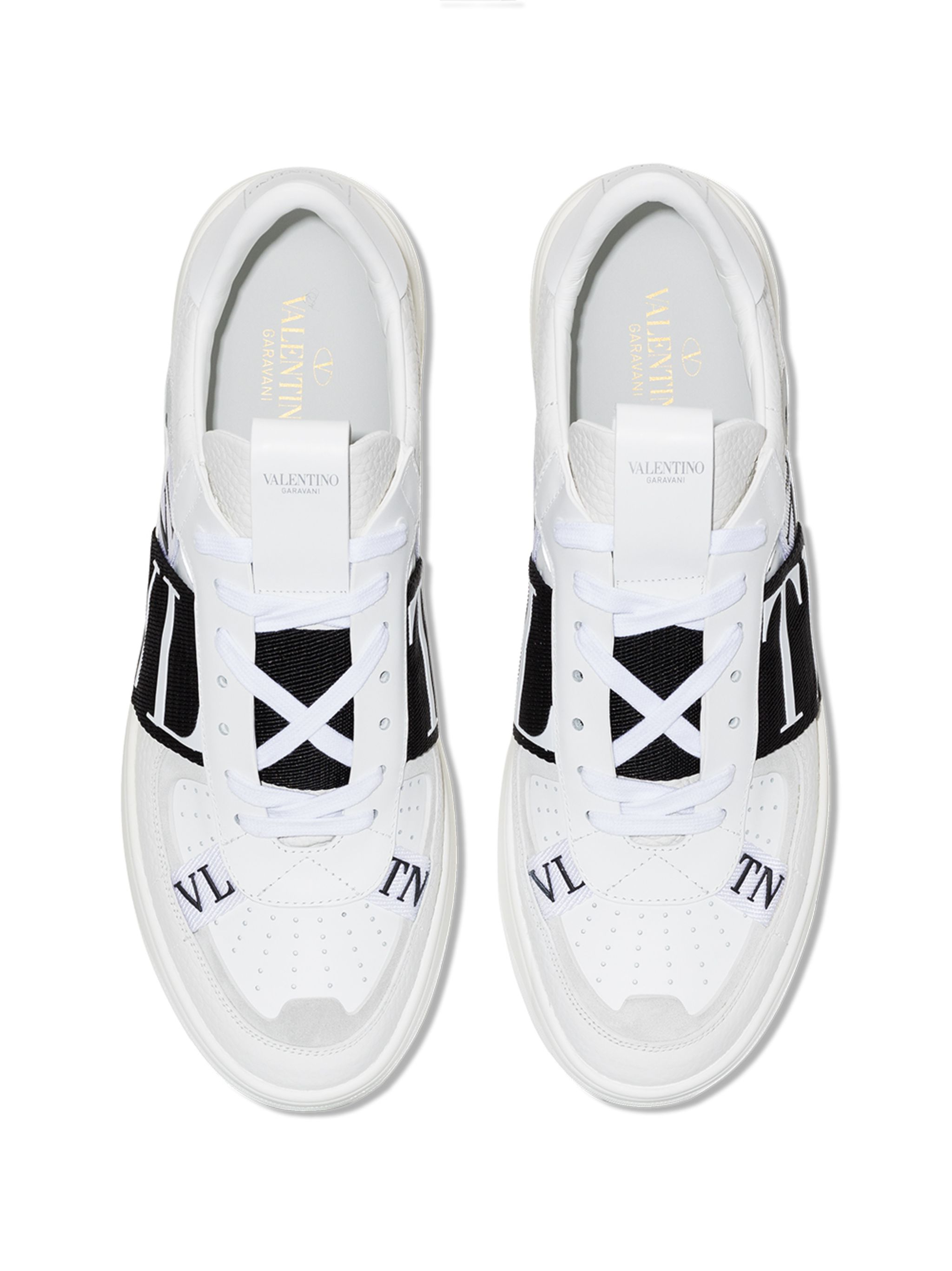 white calf leather round toe front laceup fastening perforated embellishment logoprint strap pulltab at the tongue flat sole