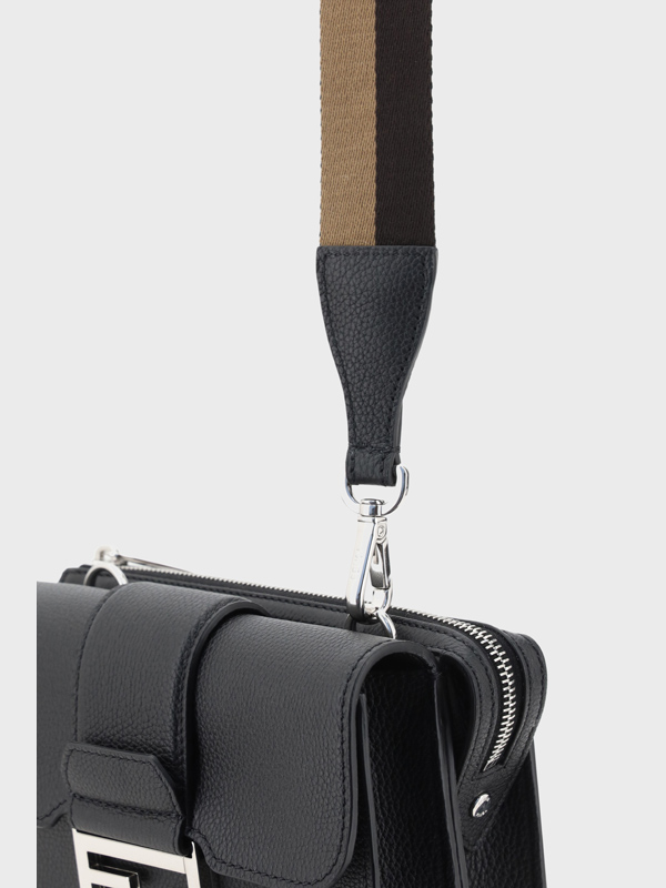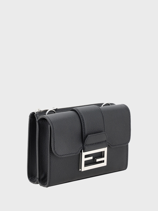 Fendis Double Baguette Shoulder Bag in grained leather is a stylish and functional accessory The adjustable and removable shoulder strap offers versatility allowing you to adapt it to your preferences The front closure with magnetic flap is enriched by a metal plaque with the brands iconic FF logo a distinctive and luxurious detail On the back a welt pocket with zipper closure adds further practicality The grained leather design lends a sophisticated and durable look making this bag a perfect accessory for any occasion