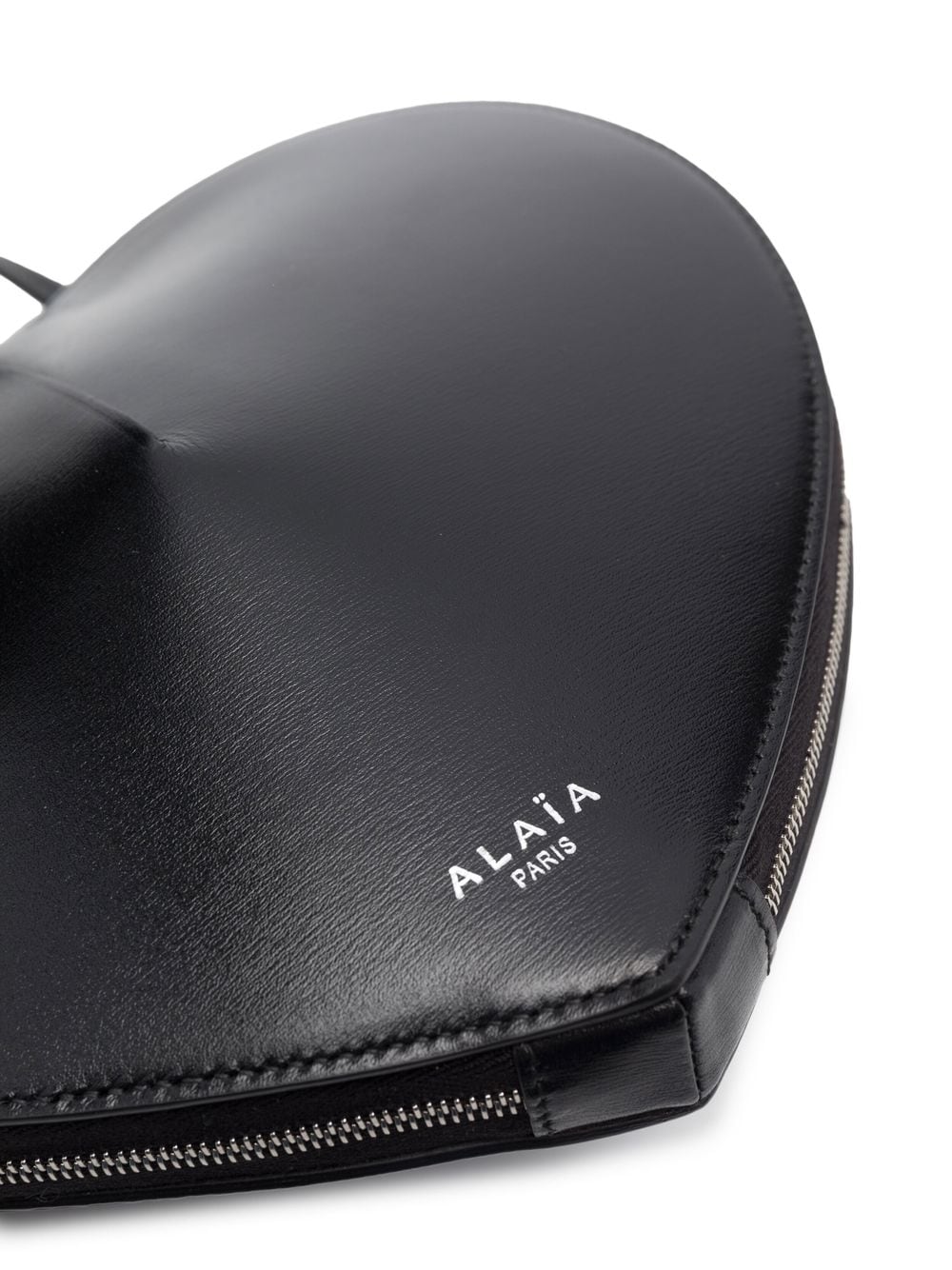 heart-shaped satchel bag from Alaia featuring jet black, calf leather, silver-tone logo lettering, heart motif, single shoulder strap and main compartment.