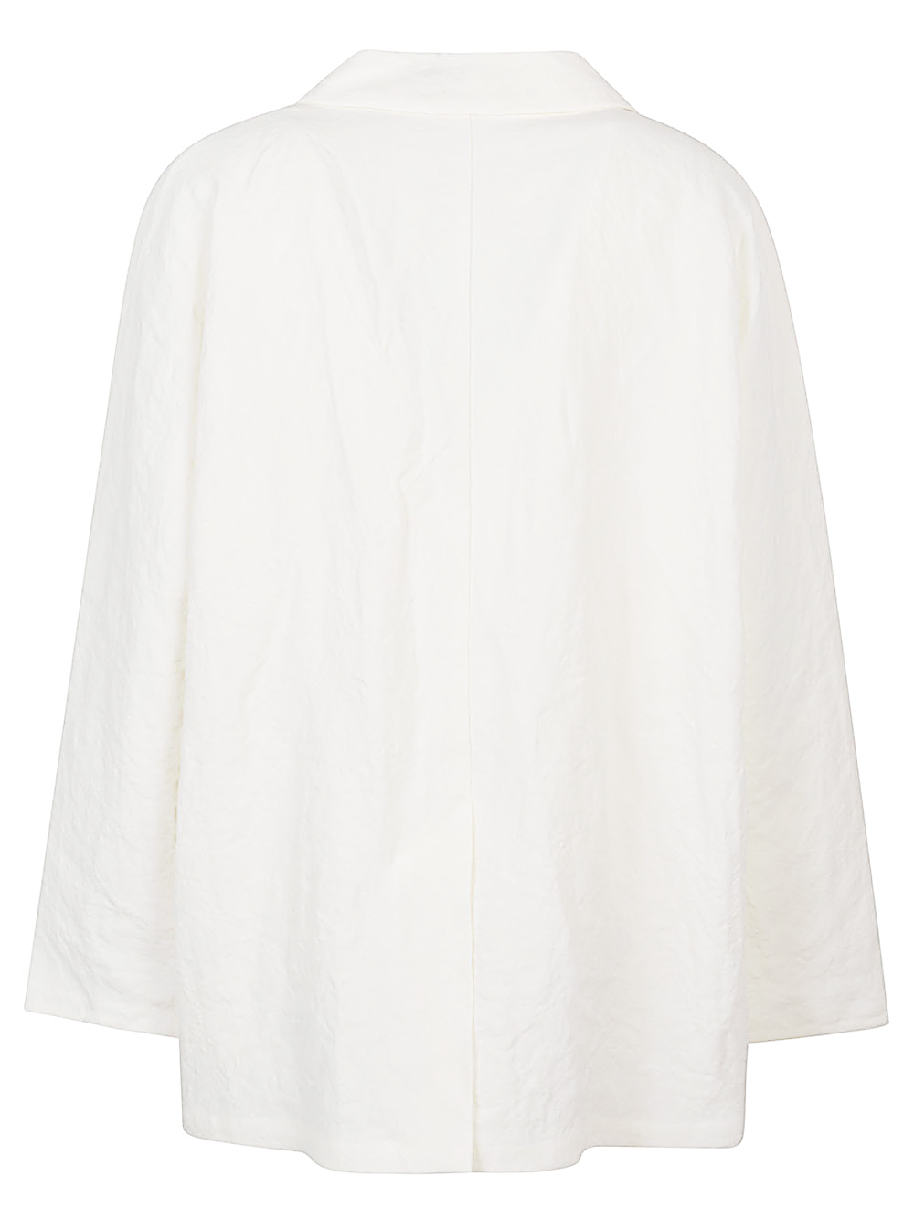 White jacket, long sleeves, button closure, two patch pockets on the front, straight hem.