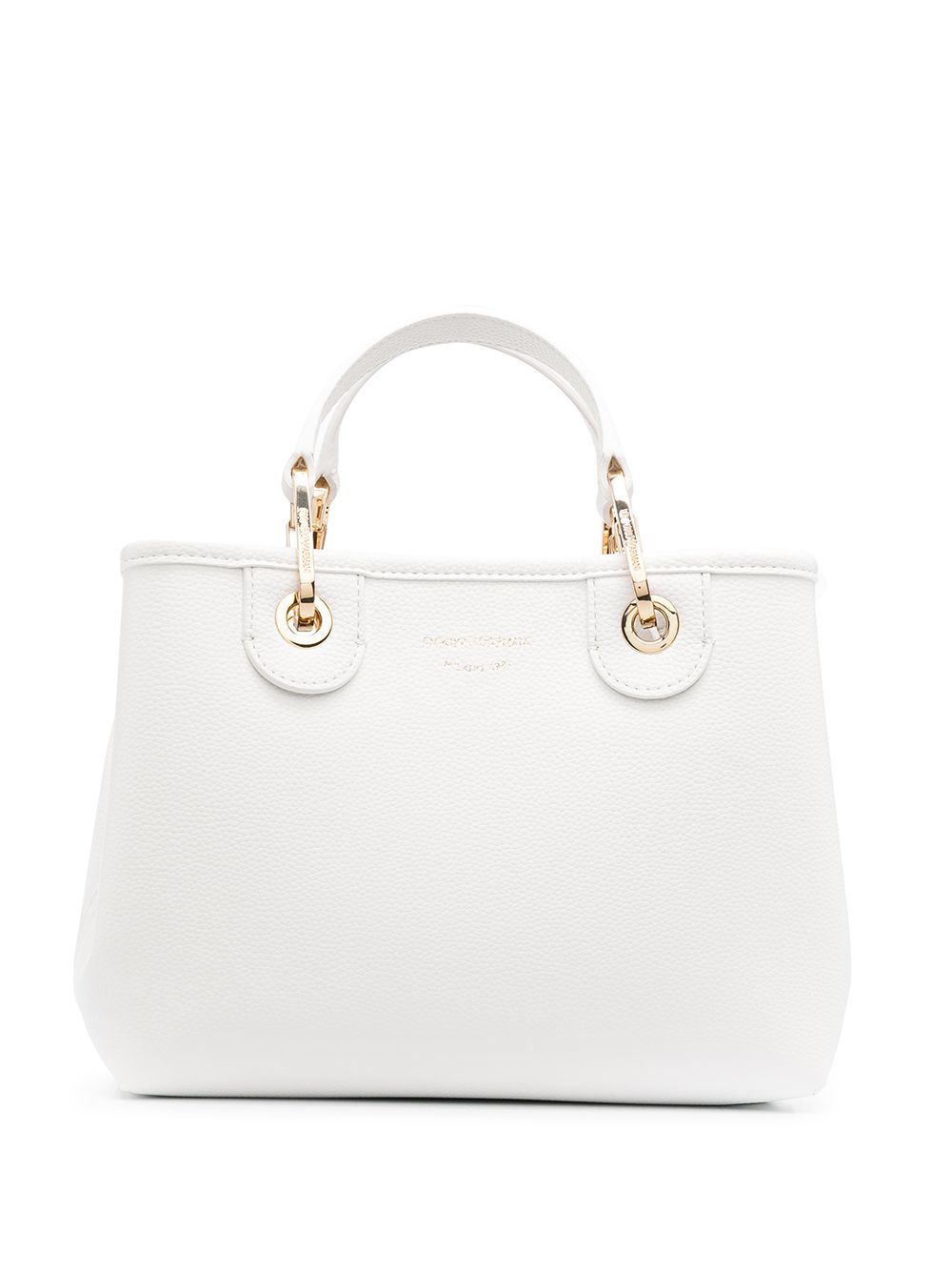 White MyEA striped strap bag from EMPORIO ARMANI featuring grained texture, stripe trim, logo-print strap, gold-tone hardware, two rounded top handles, snap fastening and removable pouch.
