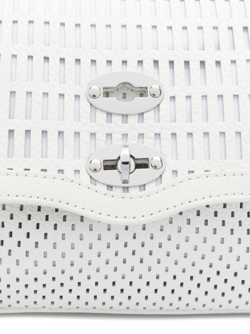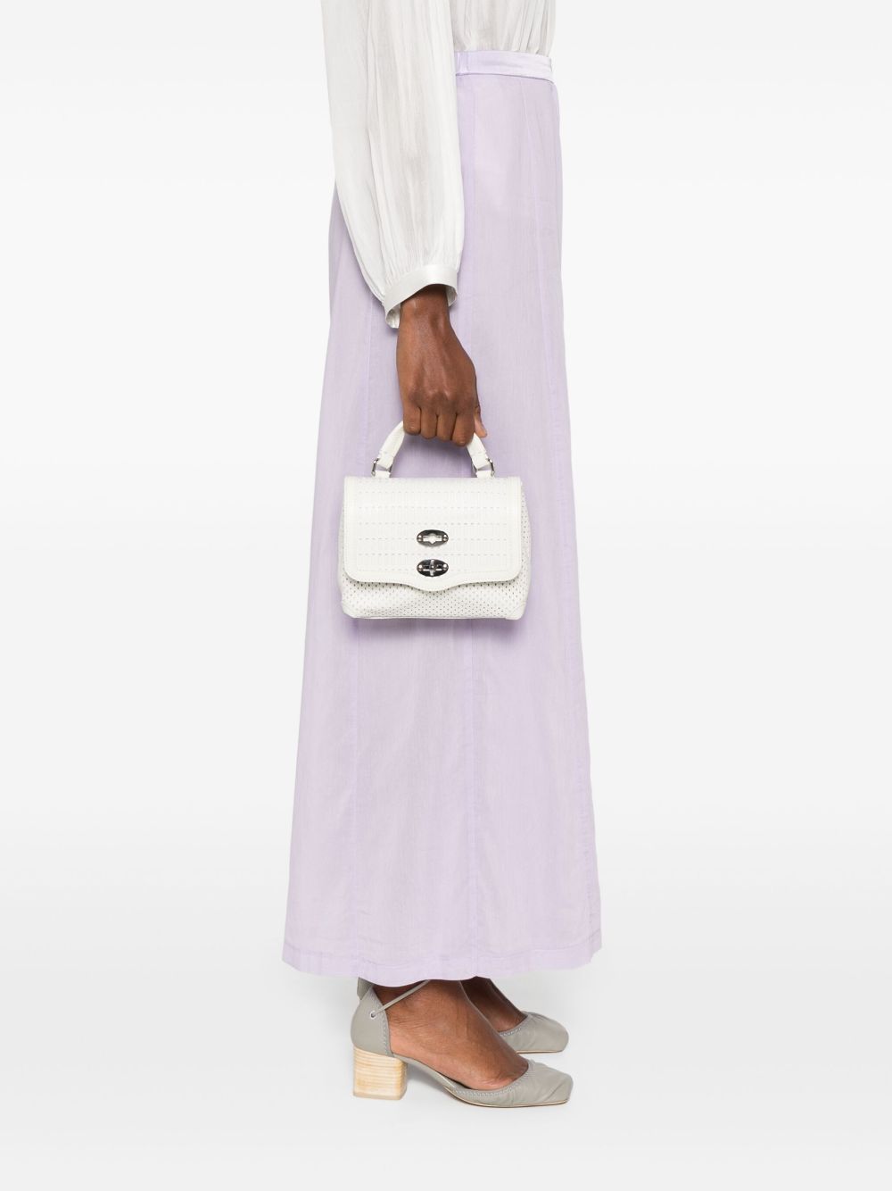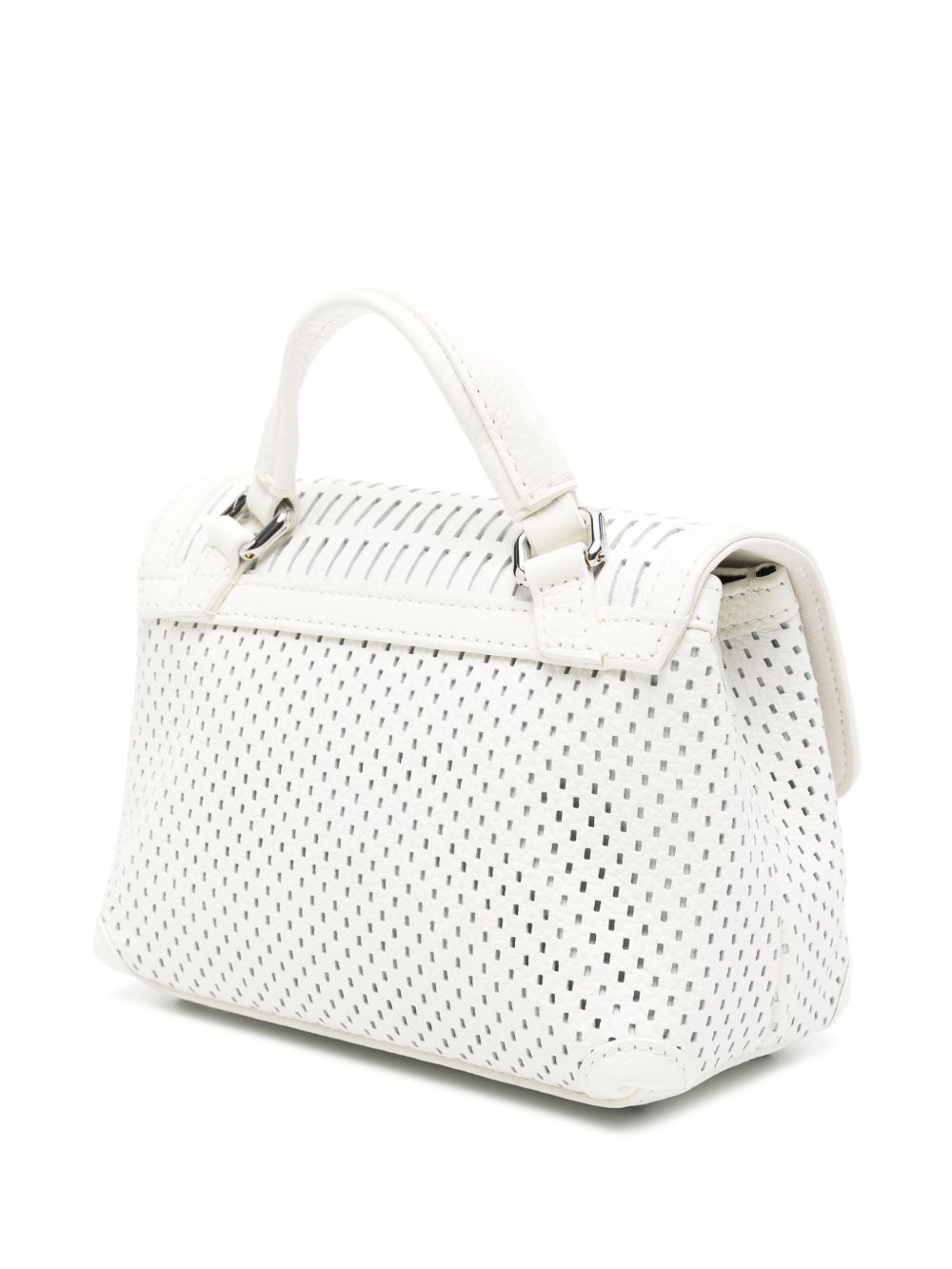 white twist-lock fastening single flat top handle adjustable detachable shoulder strap This piece comes complete with a protective dust bag.