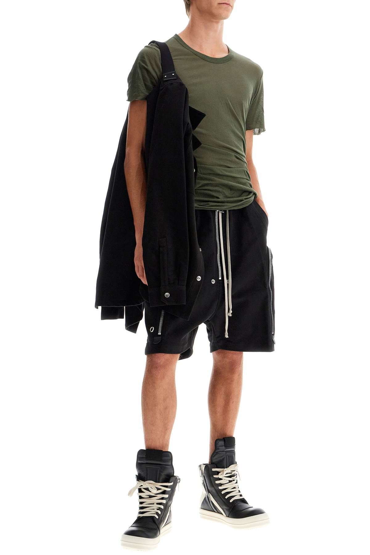 The Rick Owens Basic T-Shirt is made of semi-transparent cotton jersey with a micro ribbed crew neck and raw cut edges. It has a slim fit and the model is 187 cm tall, wearing size L.