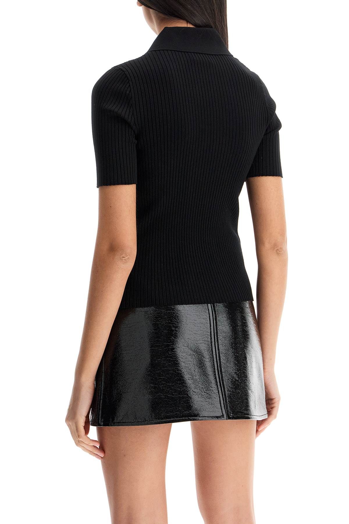 Short-sleeved Courrèges polo shirt in ribbed viscose blend knit with embroidered contrast AC logo patch on the chest. It features a fitted silhouette with a collar and five-button placket. The model is 177 cm tall and wears an XS size.